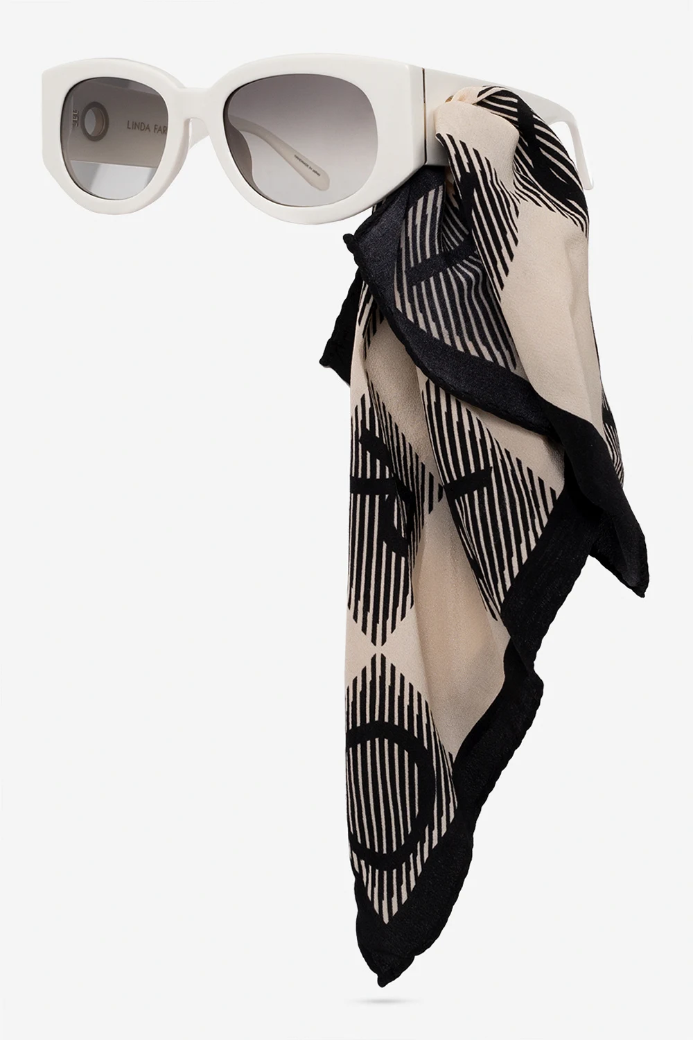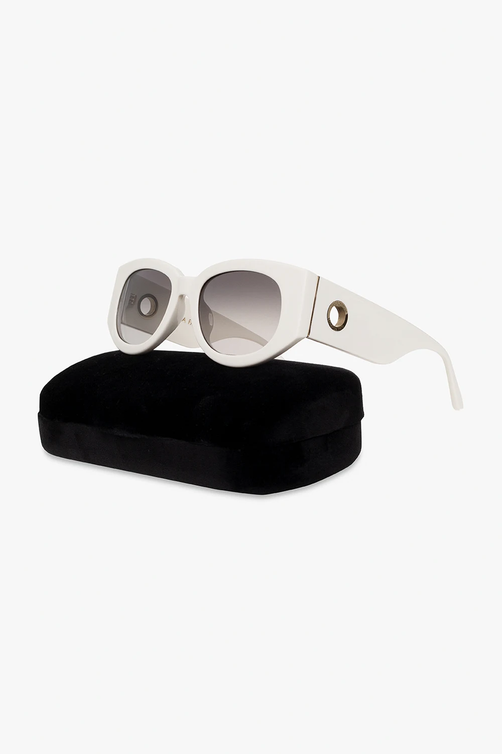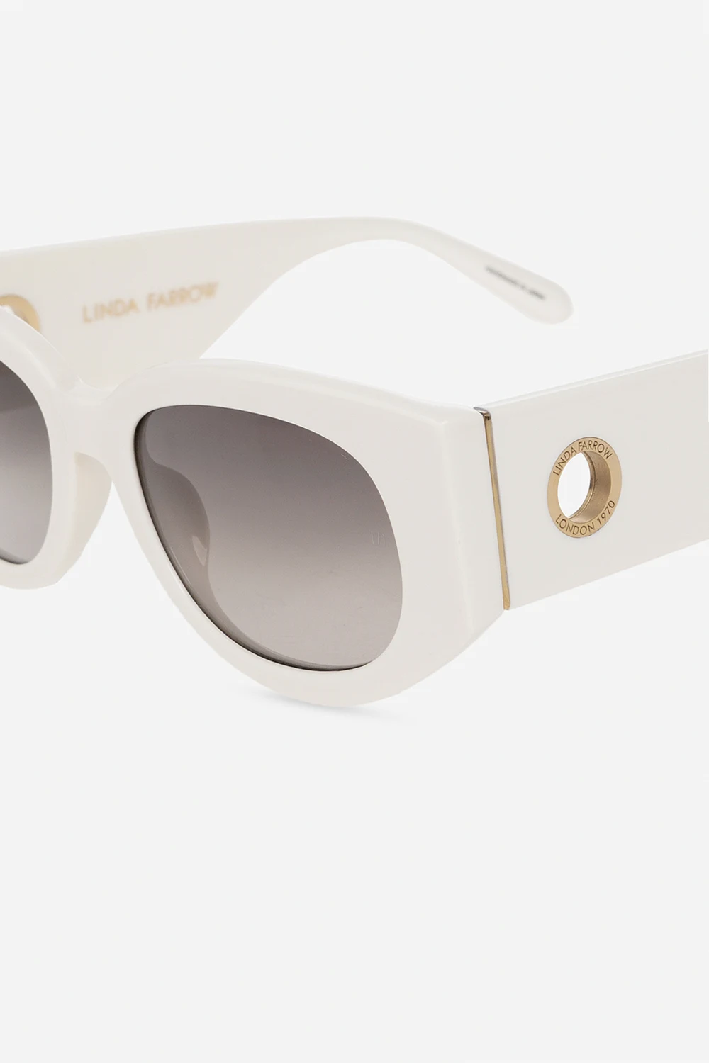 White ‘Debbie’ sunglasses from Linda Farrow. Crafted from polished acetate with rounded D-frame design, this model features wide temples with the brand's signature gold-plated eyelets with a logo, gold-tone metal hardware and dark grey gradient lenses with ZEISS technology to ensure anti-glare and 100% UV protection. Handcrafted in Japan. Branded case included.