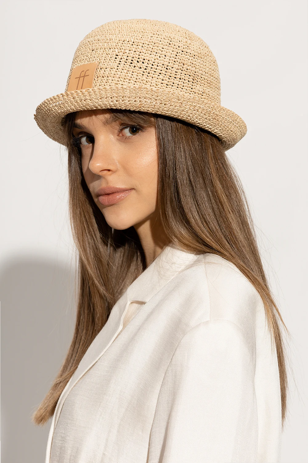Light beige bucket hat from Forte Forte. Woven from straw, this item boasts the brand’s logo on a patch.