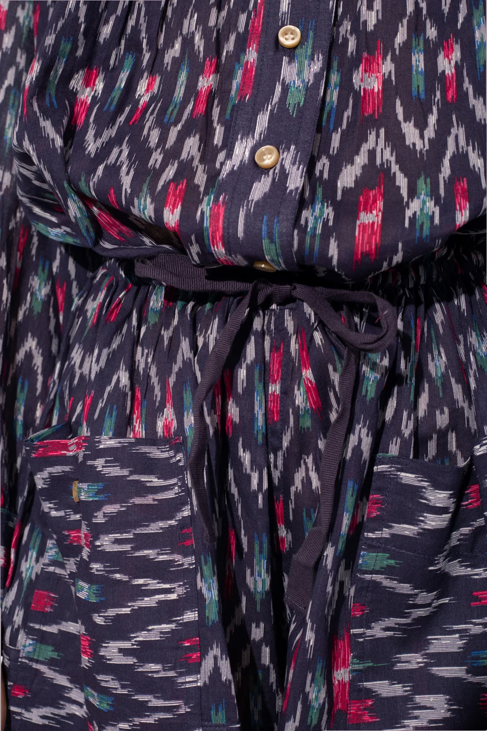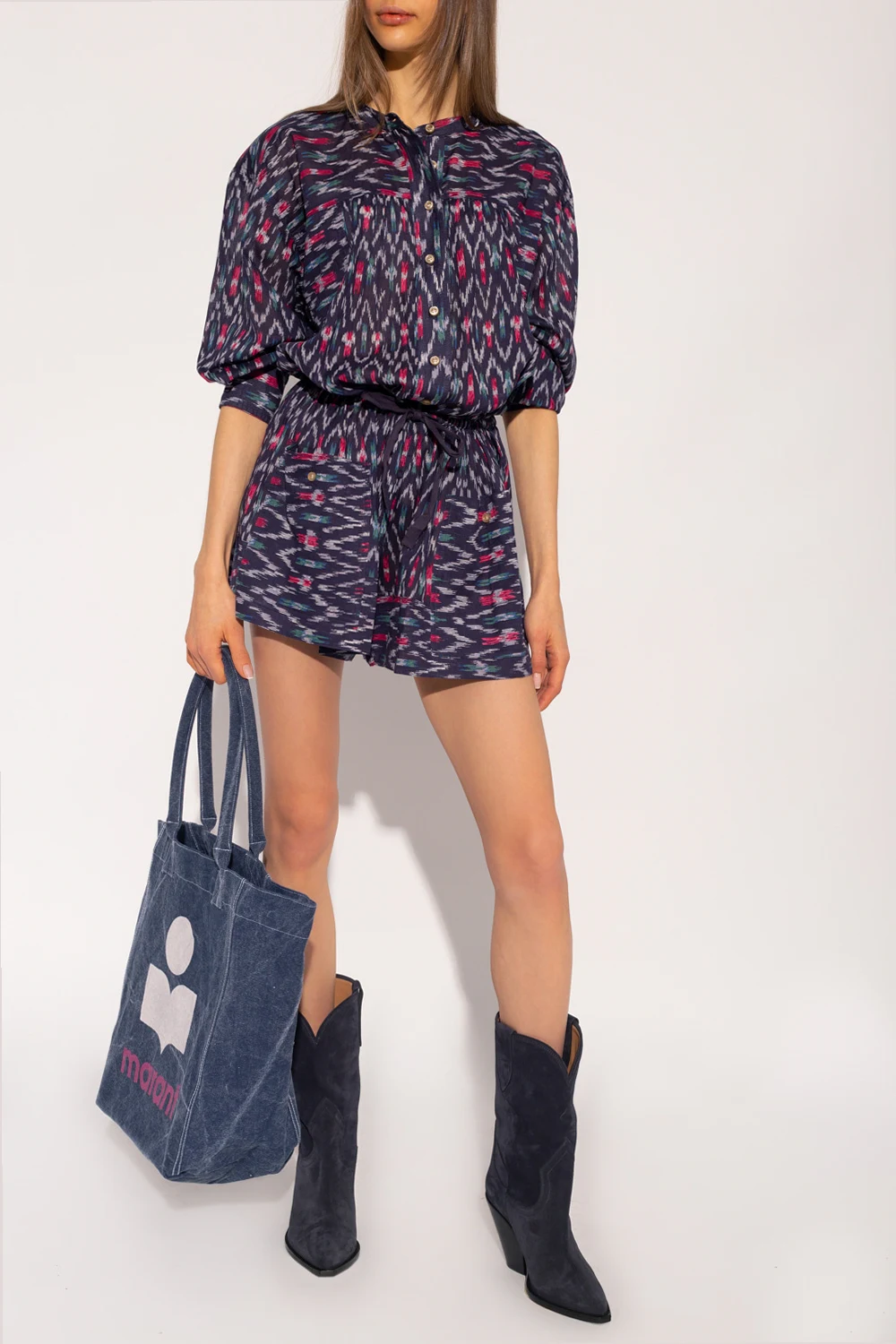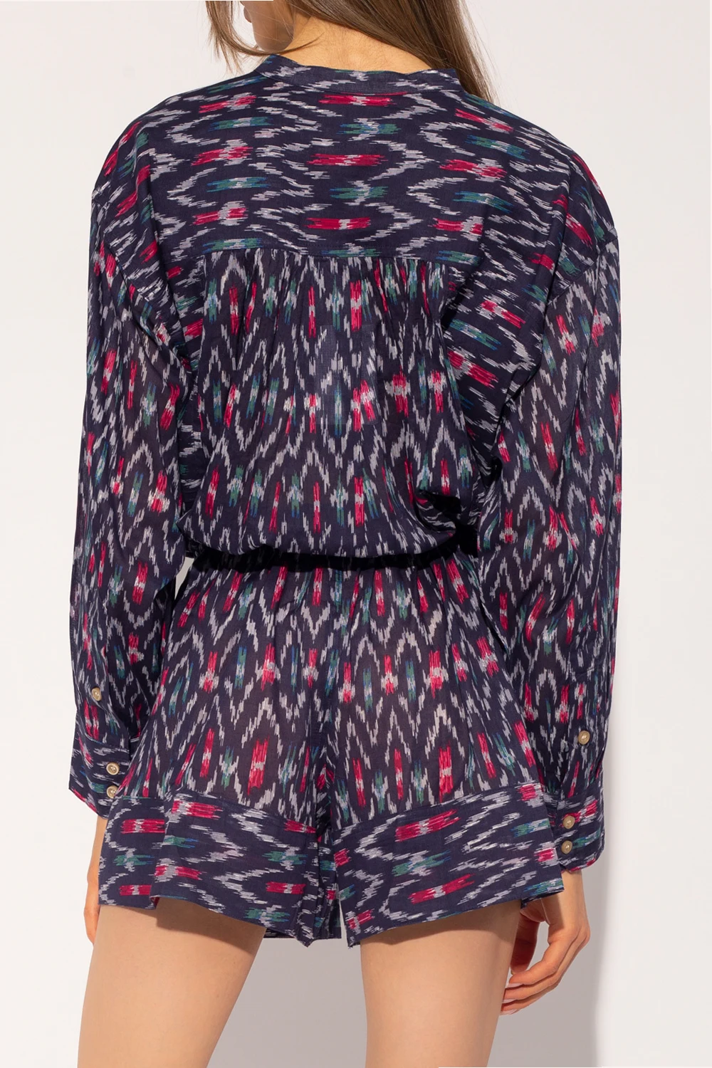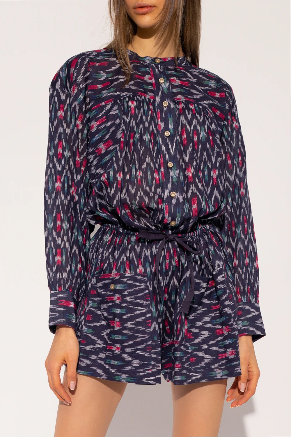 Navy ‘Lehana’ patterned jumpsuit from Isabel Marant Étoile. Made of cotton, this garment represents the label’s carefree character. It features button and drawstring fastening, multicolored ‘Ikat’ pattern, two buttoned pockets, short legs and long puff sleeves with elasticated cuffs.
