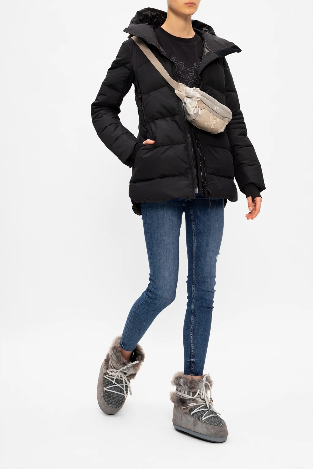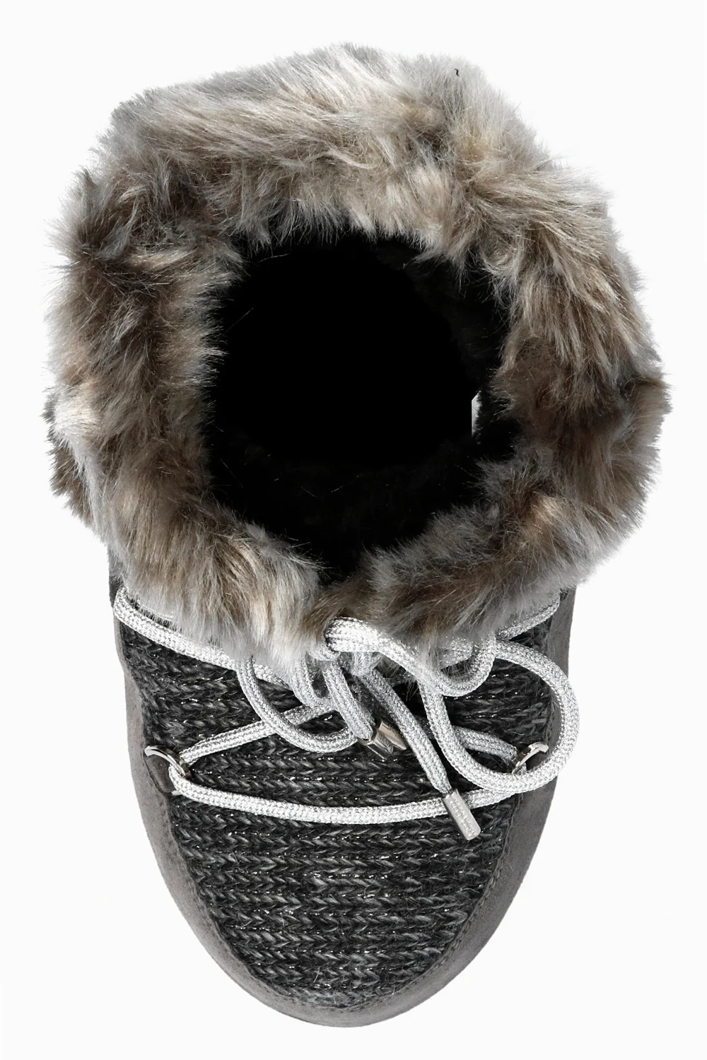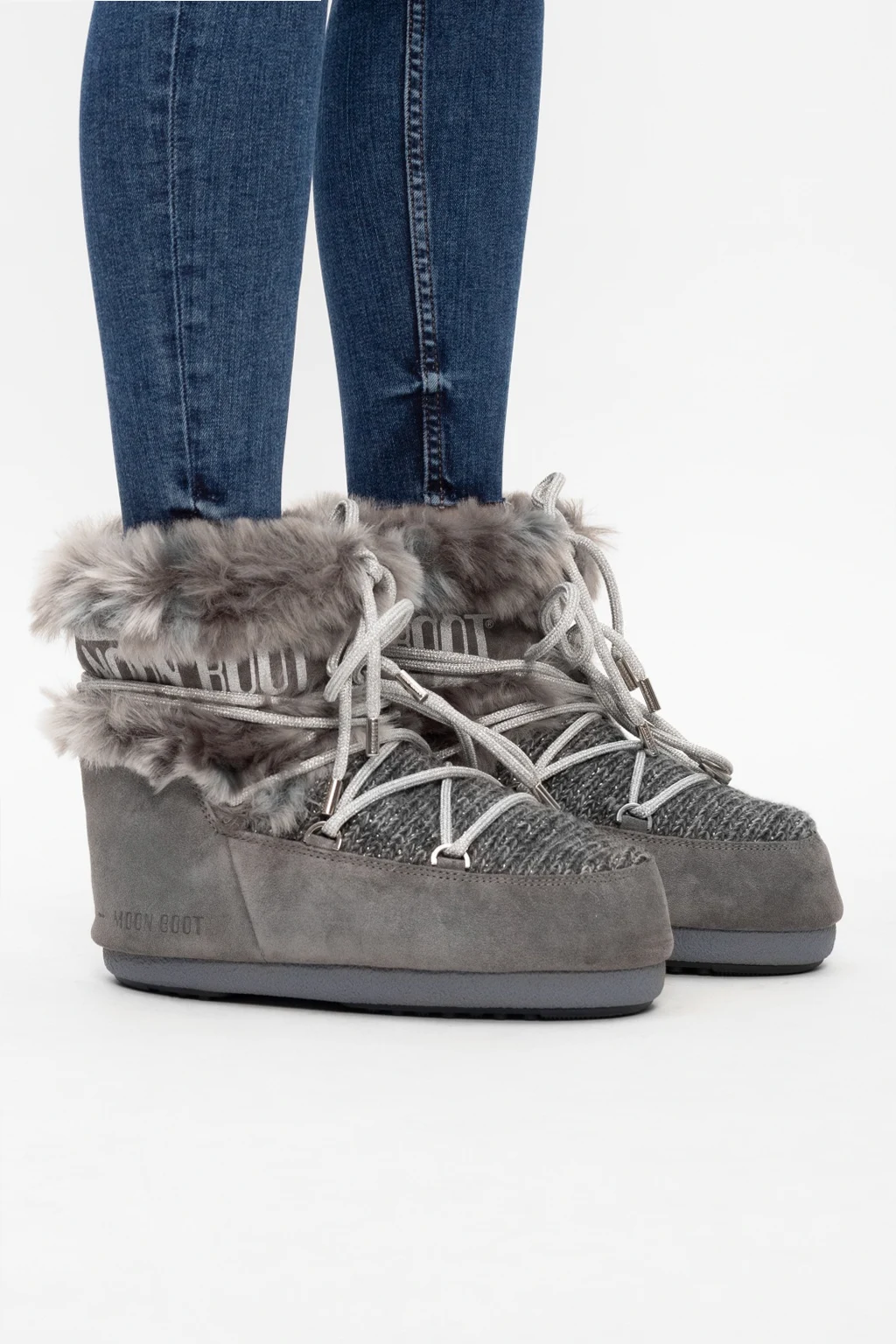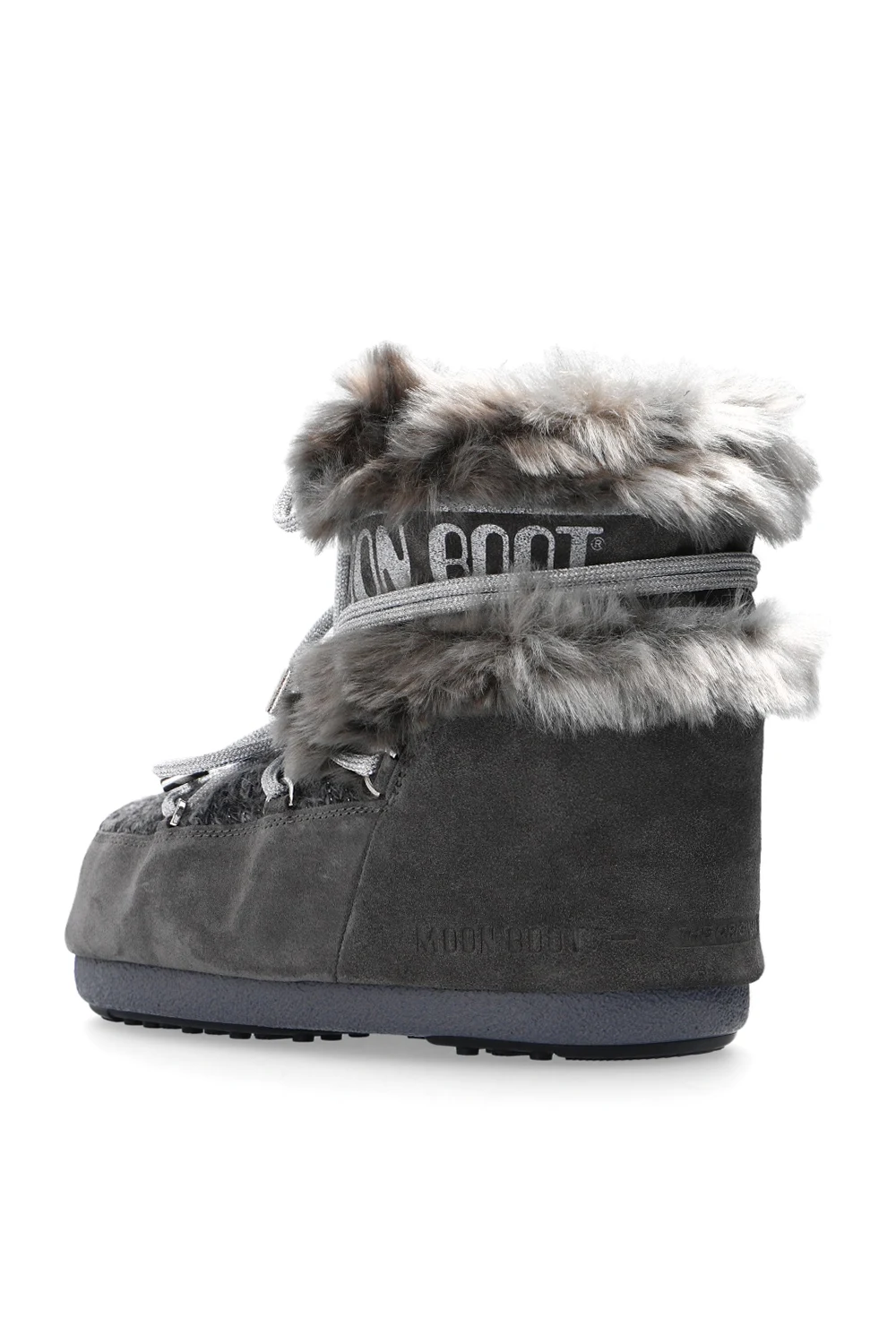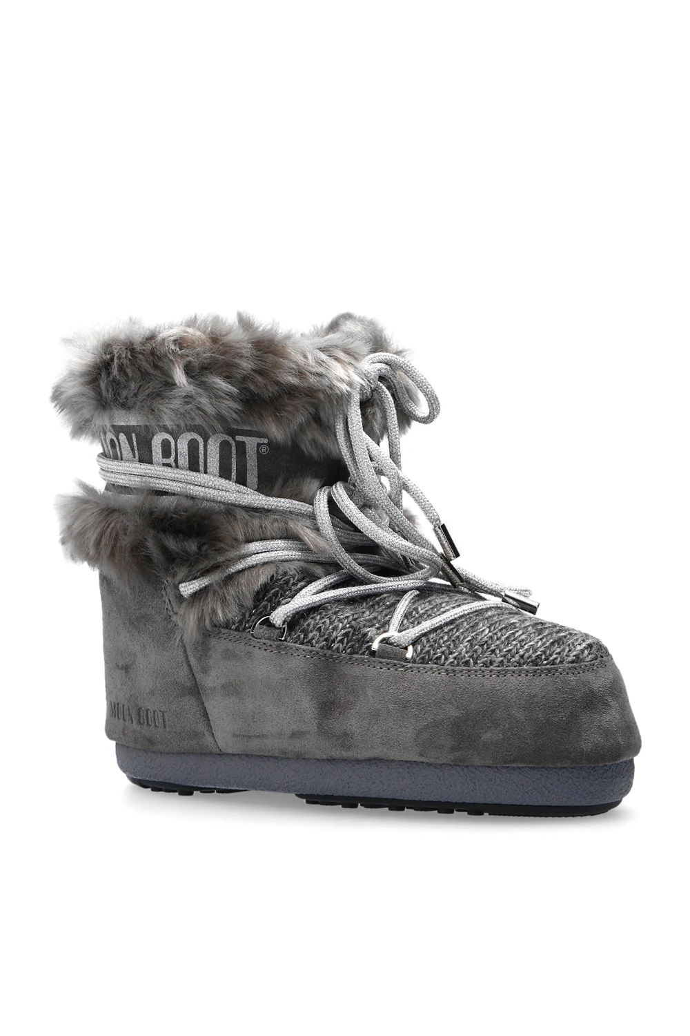 Grey ‘Mars’ fur snow boots from Moon Boot. Crafted from suede and wool, this slip-on design features a printed logo pattern, silver-tone laces and a grey rubber sole.