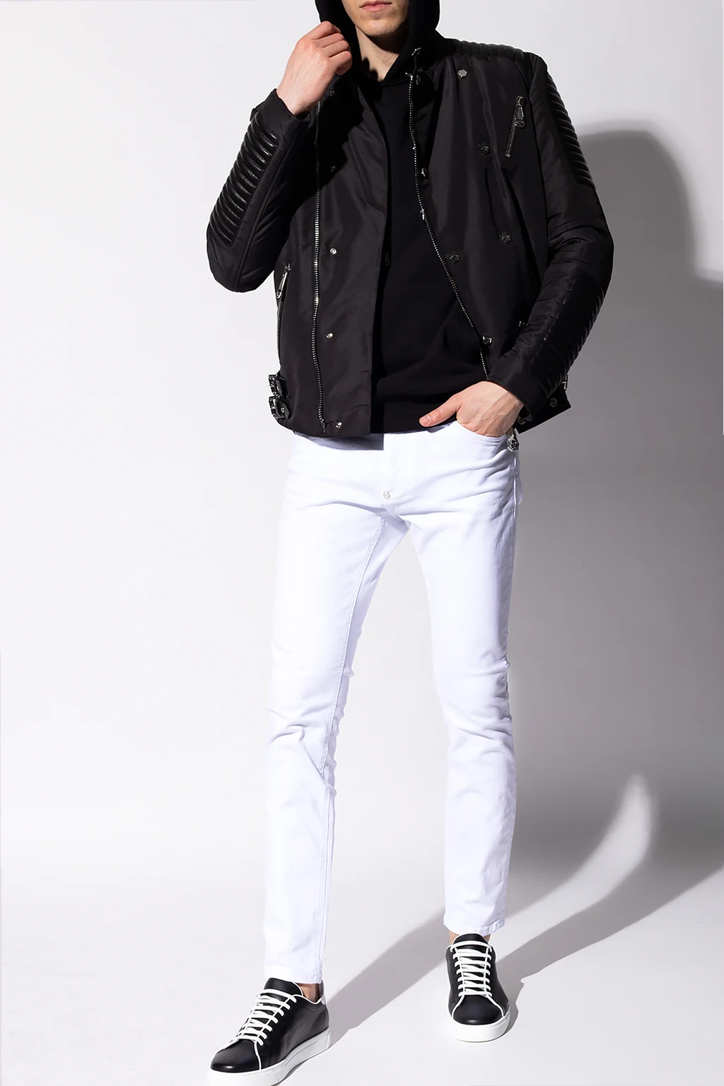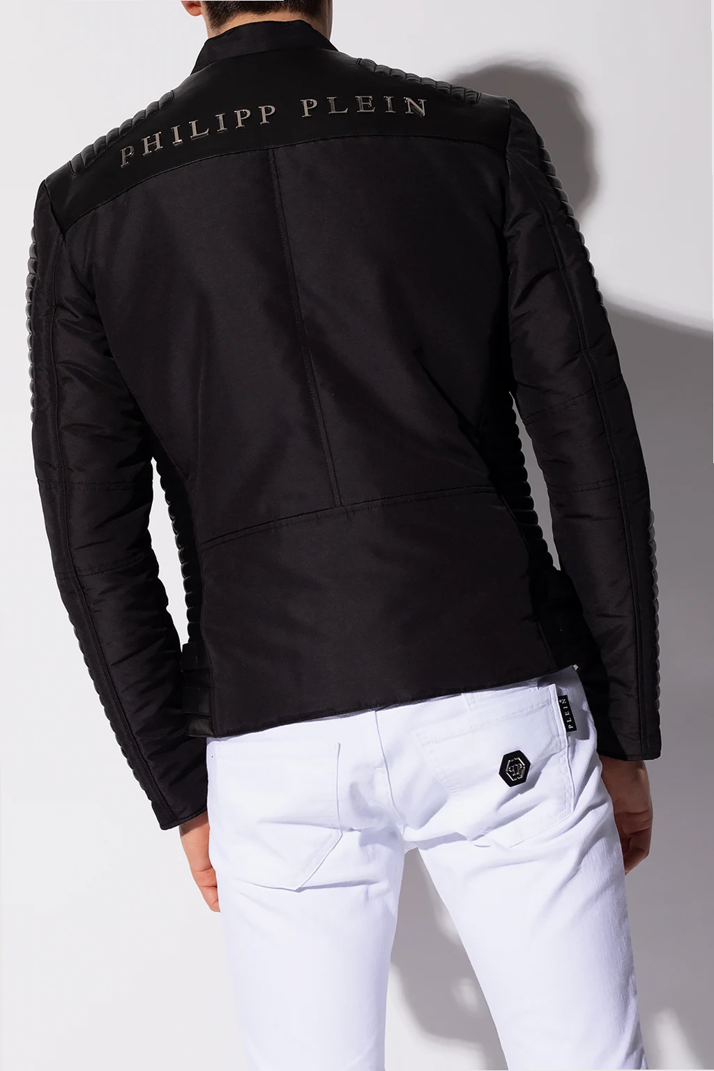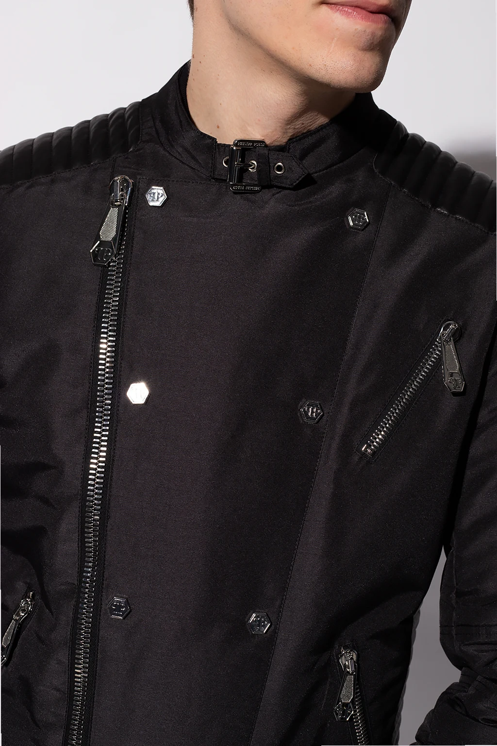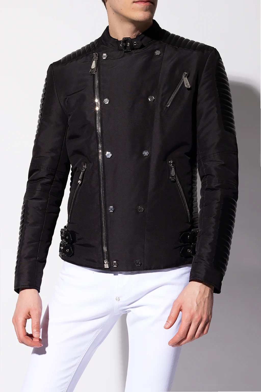 Black jacket with a band collar from Philipp Plein. Fastened with a zip and snaps, this garment is trimmed with leather and has three zip pockets, buckle straps on the sides, long sleeves and a metal logo-embossed appliqué in silver-tone.