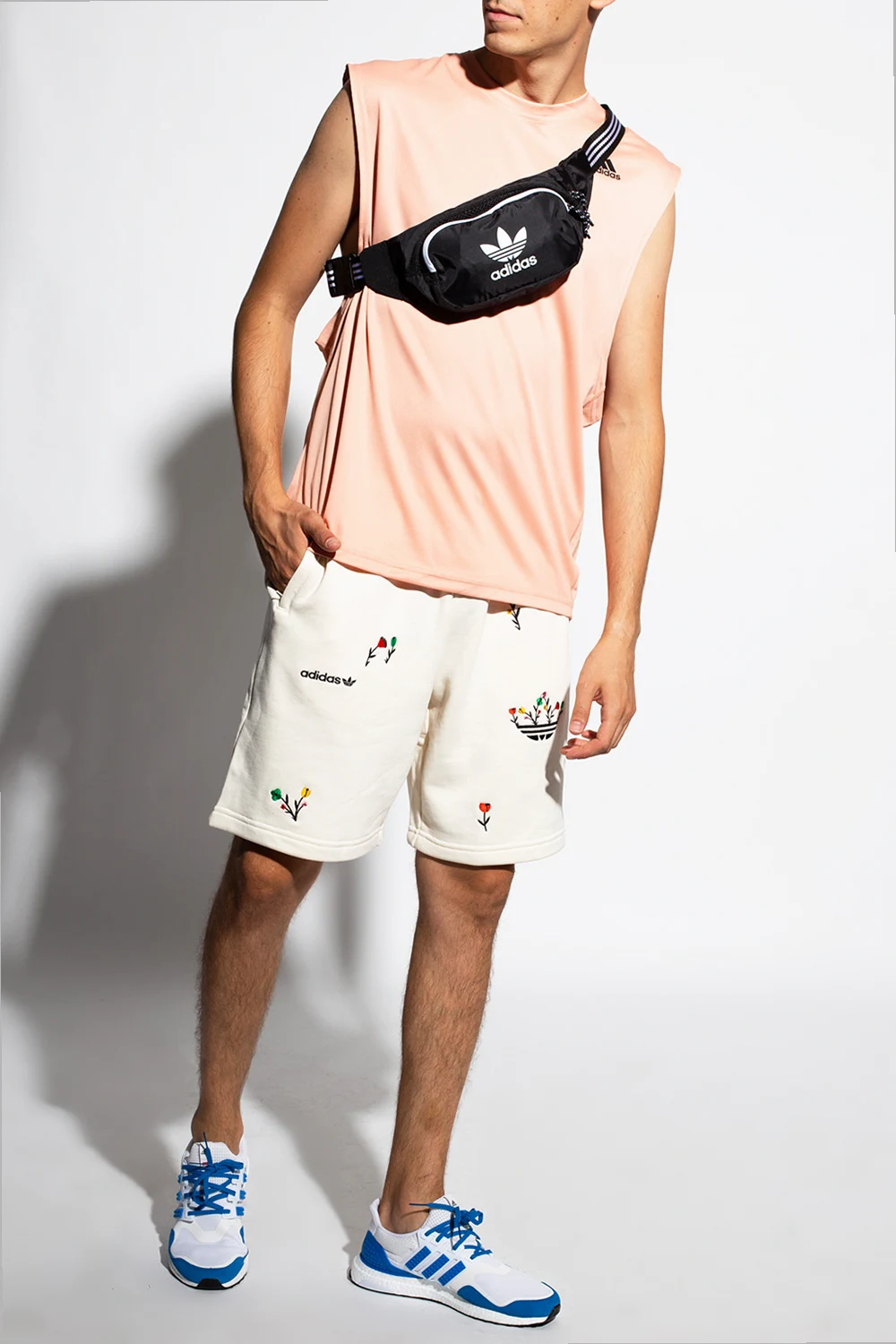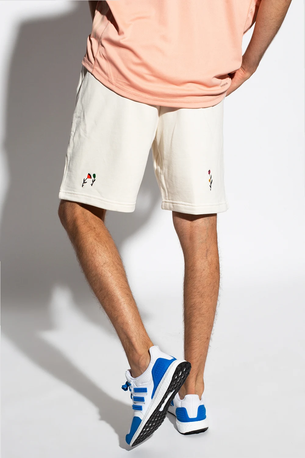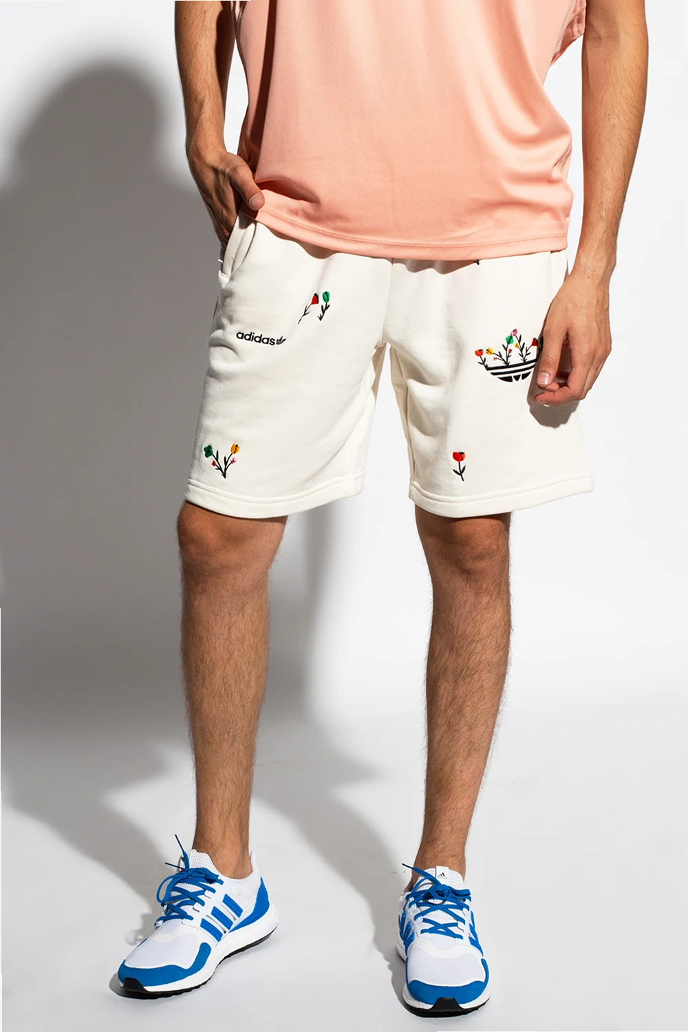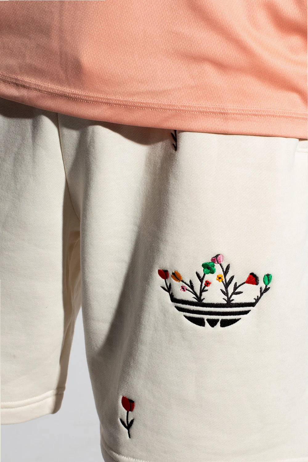 Cream shorts from ADIDAS Originals, the ‘Better Cotton Initiative’ line. Crafted from cotton from sustainable crops, this design is complete with a drawstring waist, embroidered floral pattern with a logo and two front zip pockets.