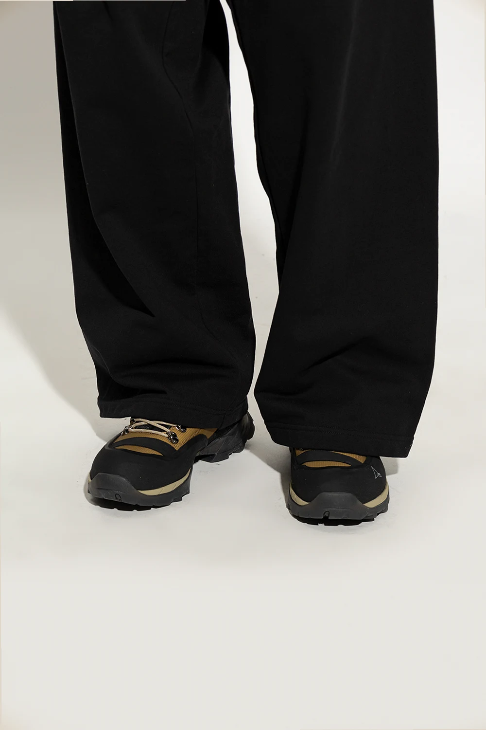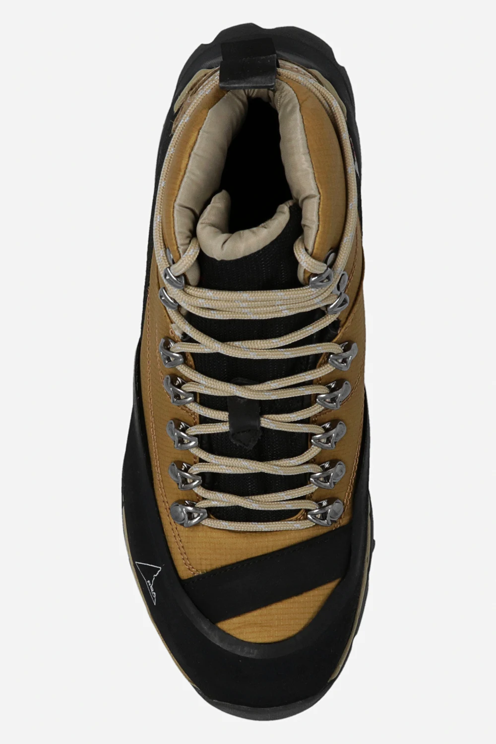 Beige, black and brown ‘Andreas’ hiking boots from Roa. Made of leather and fabric, this lace-up pair features a logo detail, rubber trims and black Vibram® Megagrip toothed tread pattern sole designed for optimal traction that ensures high resistance to use on roughest surfaces.
