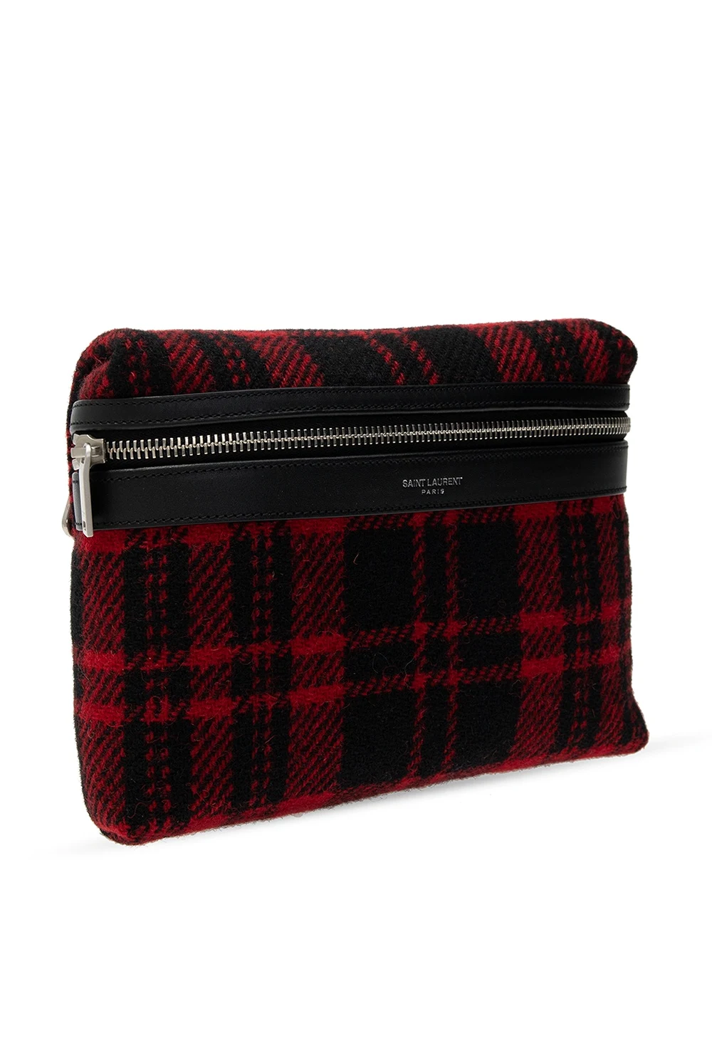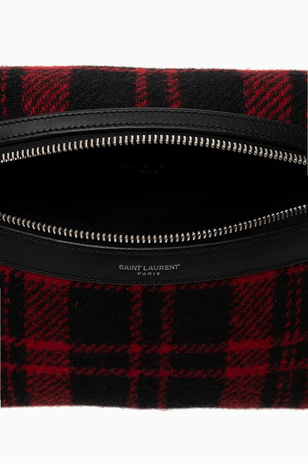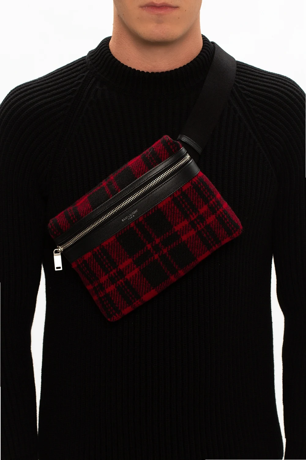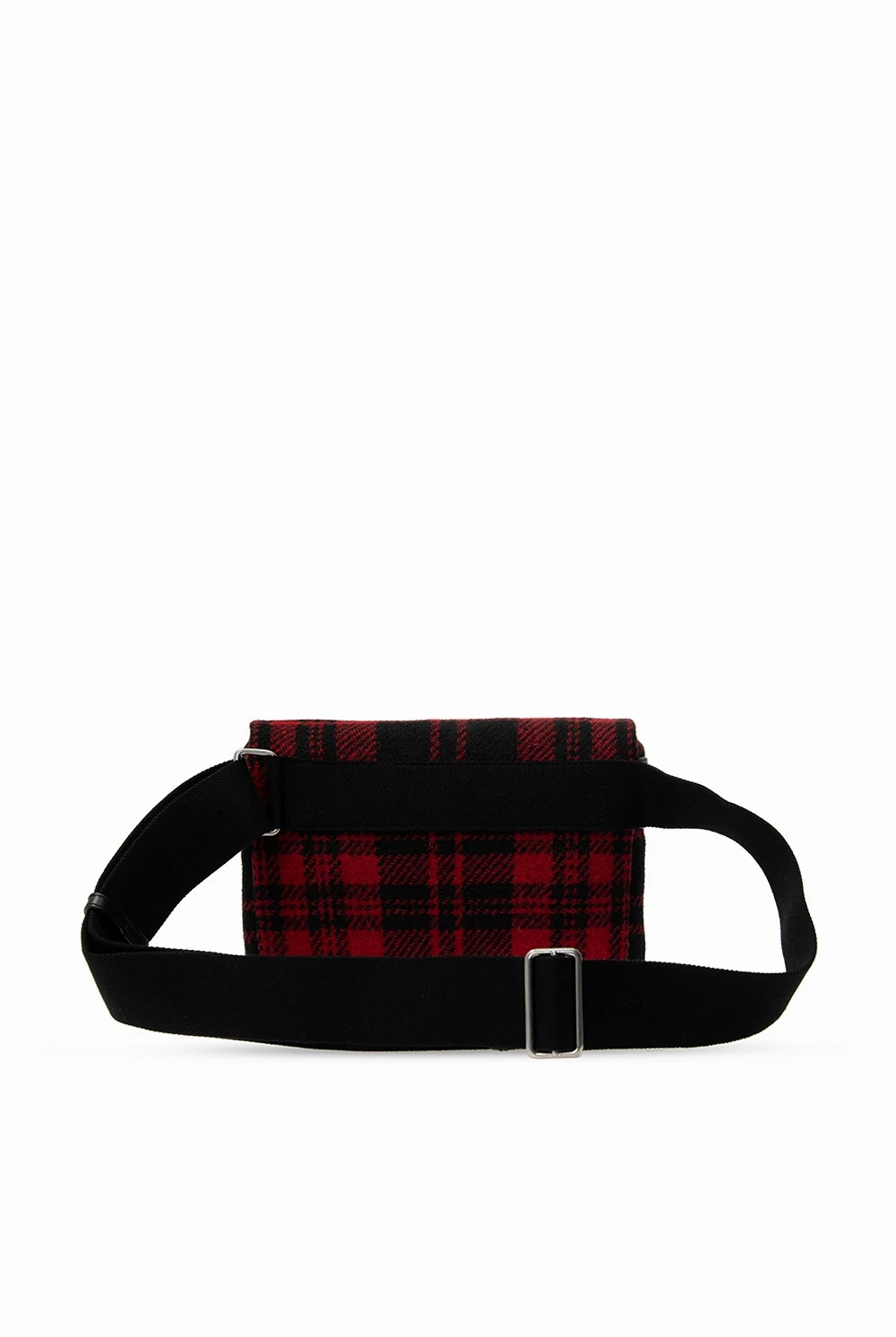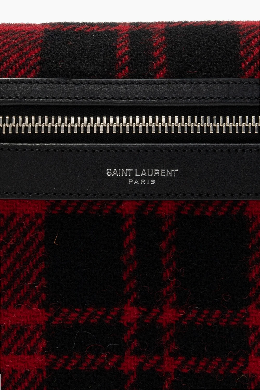 Black and red ‘City’ belt bag from Saint Laurent. Rendered in tartan motif with bovine leather finishes and silver-tone logo embossing, this design employs zip closure, an external zipped pocket on the back, an adjustable strap, silver-tone metal hardware and interior with one compartment and one zipped pocket.