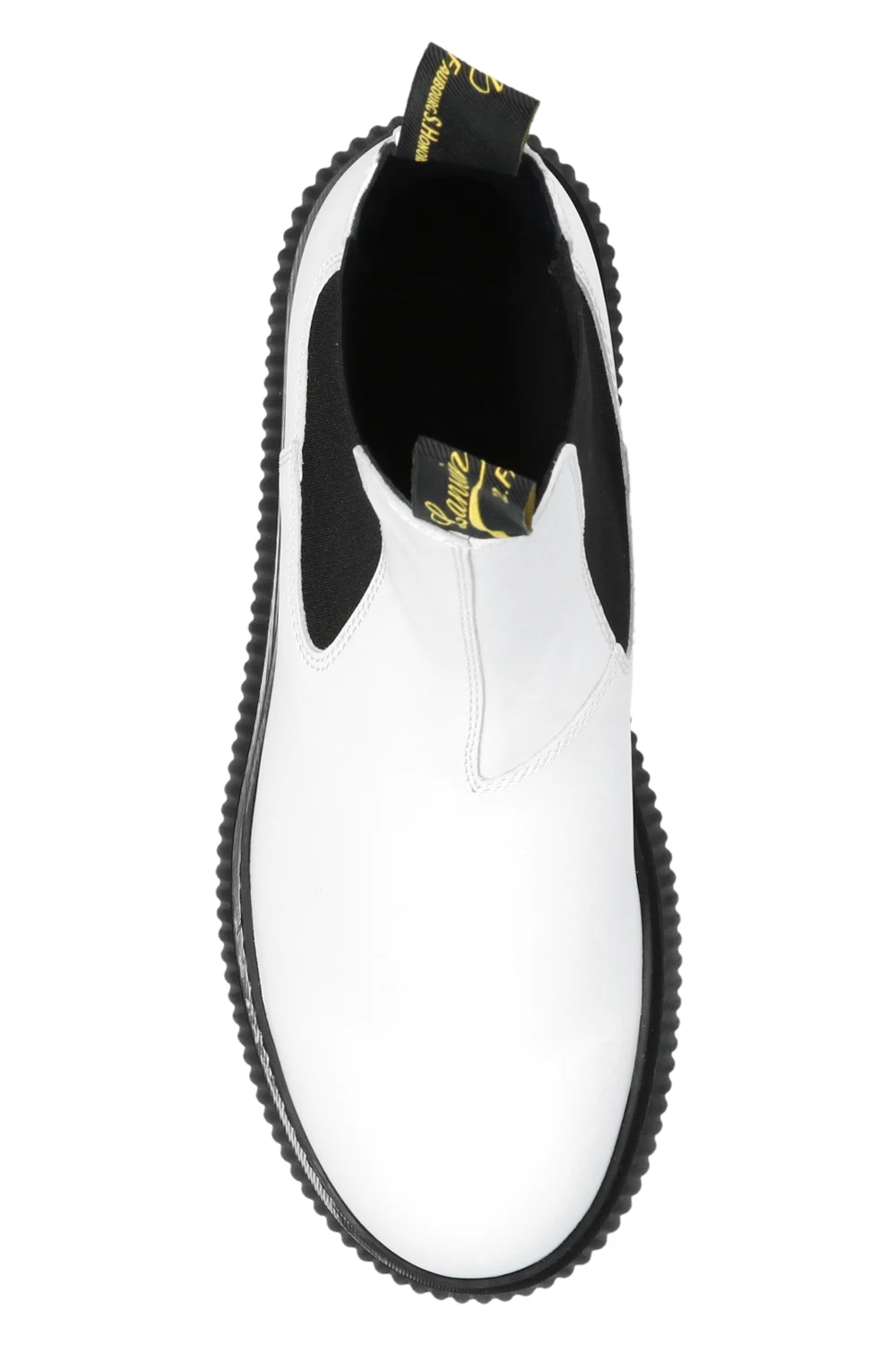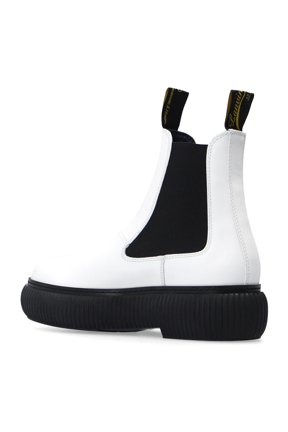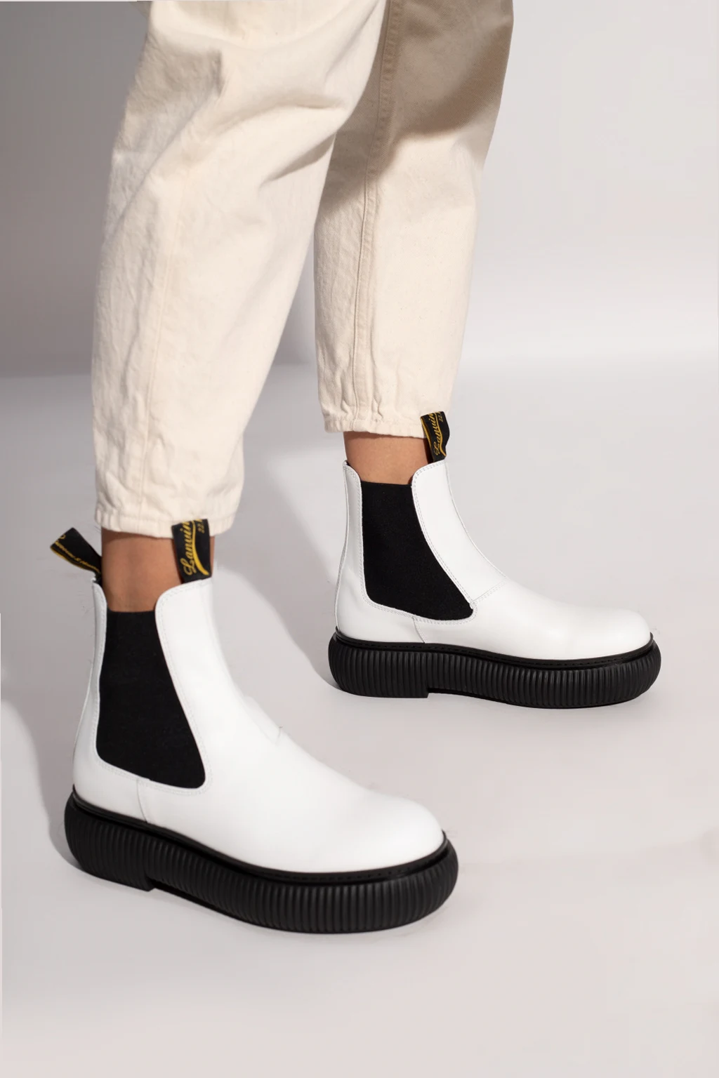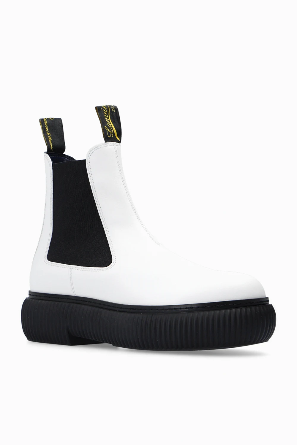 White and black ‘Arpge’ Chelsea boots from Lanvin. Resting on a black sole made from thermoplastic polyurethane, this leather-crafted pair is complete with elastic side panels in black.