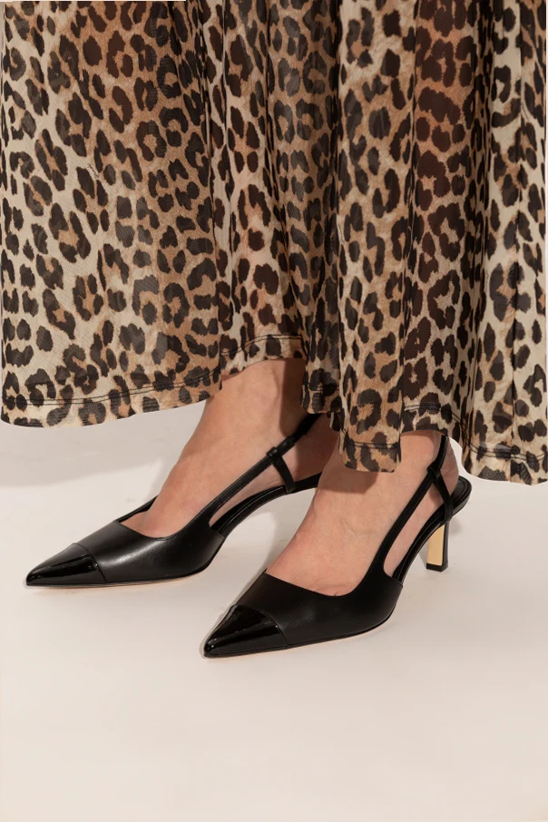 Das Modell zeichnet sich durch eine teilweise offene Ferse aus, die von filigranen Riemchen umschmeichelt wird, während Schaft und Innenfutter aus mattem, glattem, hochwertigem Kalbsleder für exklusiven Komfort sorgen. Die zart lackierte Spitze besticht mit edlem Glanz, und das markante Designer-Logo unterstreicht den Prestigecharakter des Produkts.