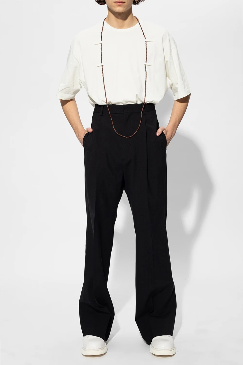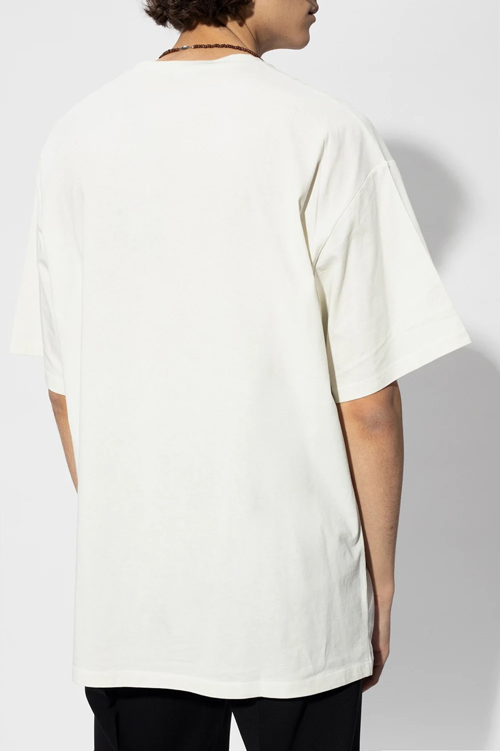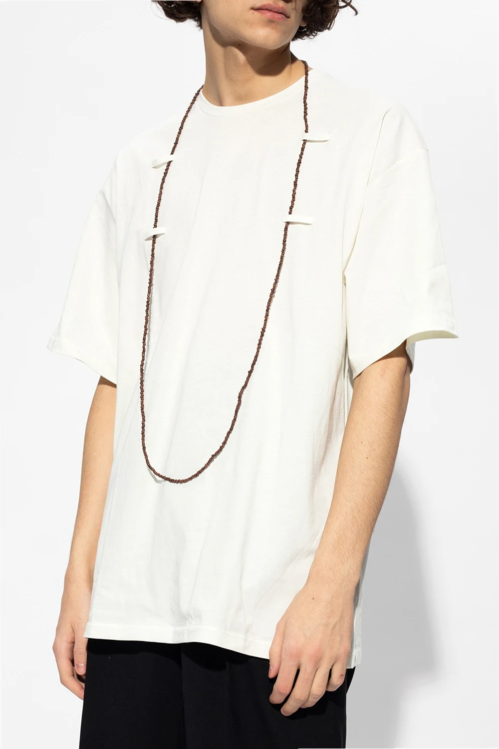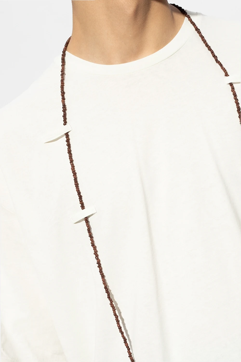 Light yellow T-shirt from Raf Simons. The ‘Archive Redux’ collection celebrates the label’s 25th anniversary. Crafted from cotton, this short sleeve design features a ribbed round neck and decorative appliqué in the form of a brown necklace with lobster clasp fastening.
