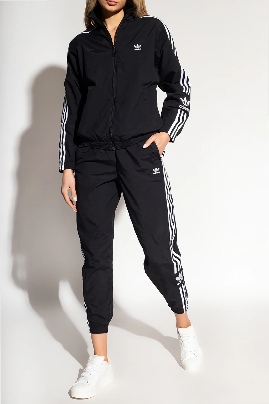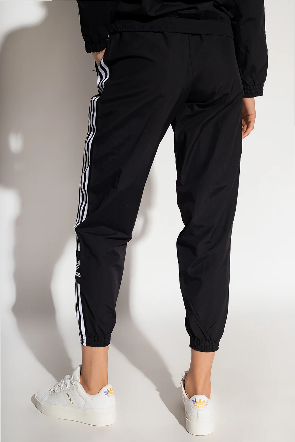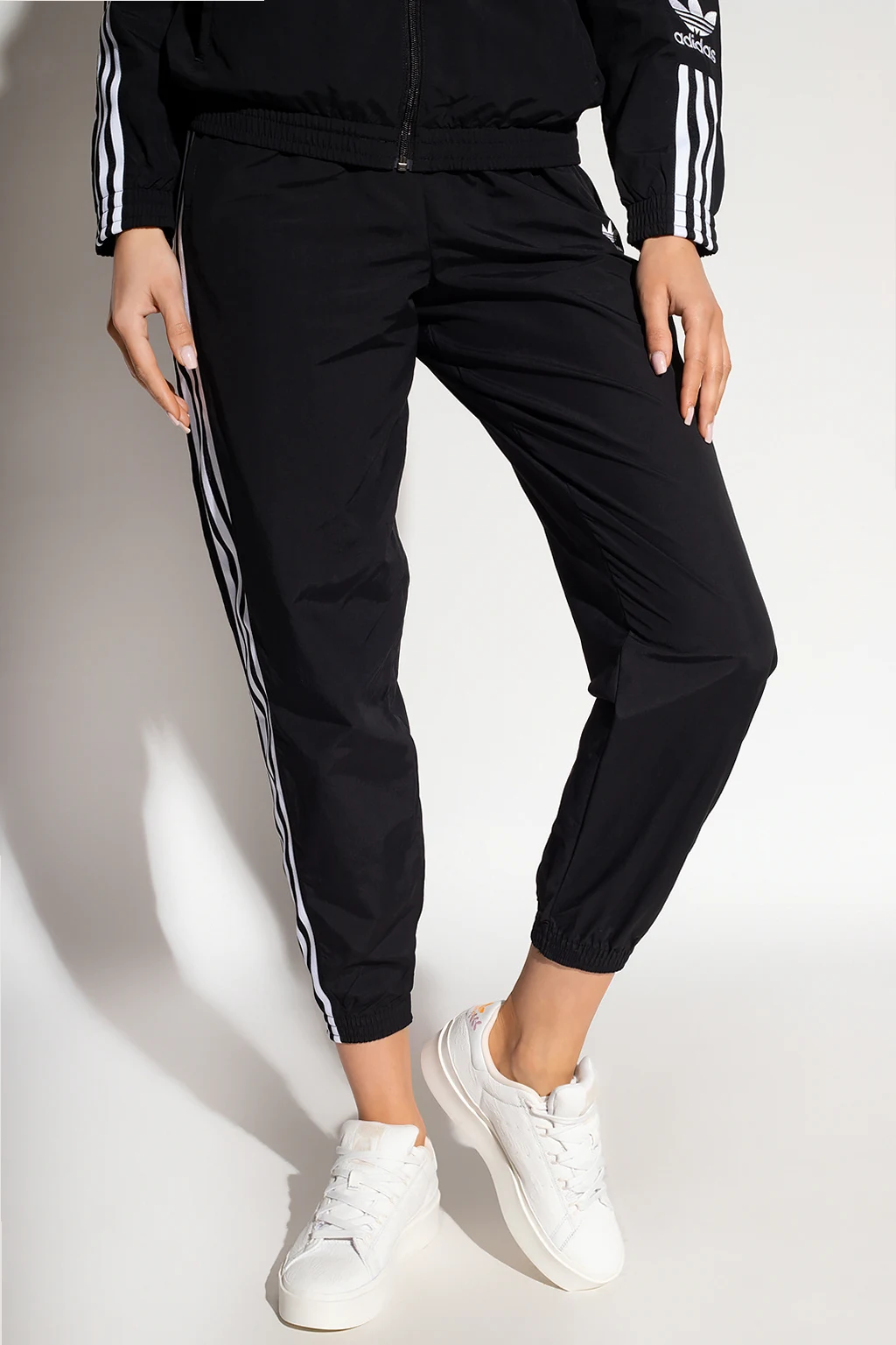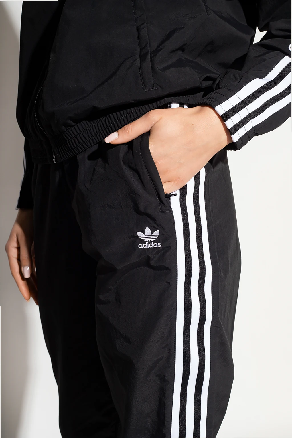 Black track pants from ADIDAS Originals. Made of Primegreen, a series of high-efficient recycled materials, this pair features a drawstring waist, two front zip pockets, an embroidered white logo and sewn-on the brand's signature three stripes.