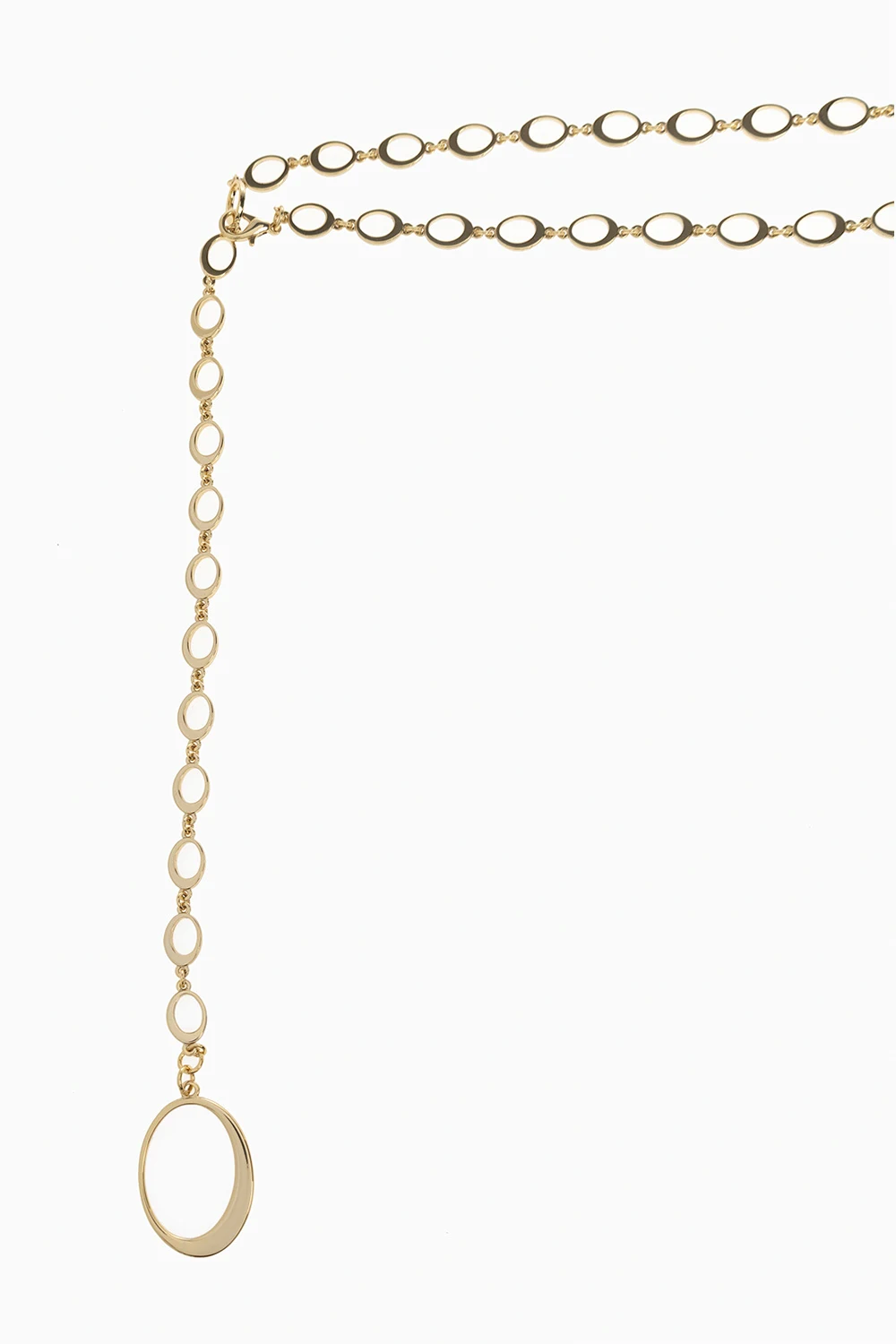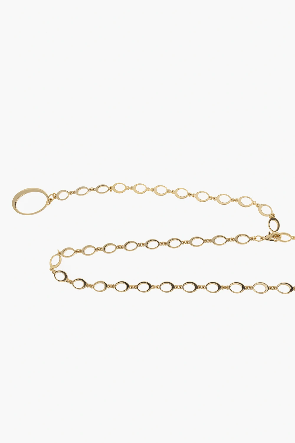 Gold-tone belt with decorative logo-shaped links and adjustable closure from Oseree.