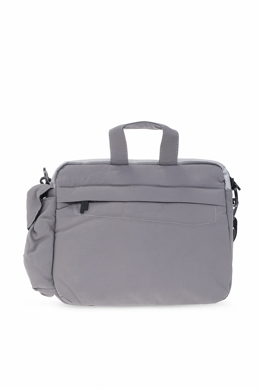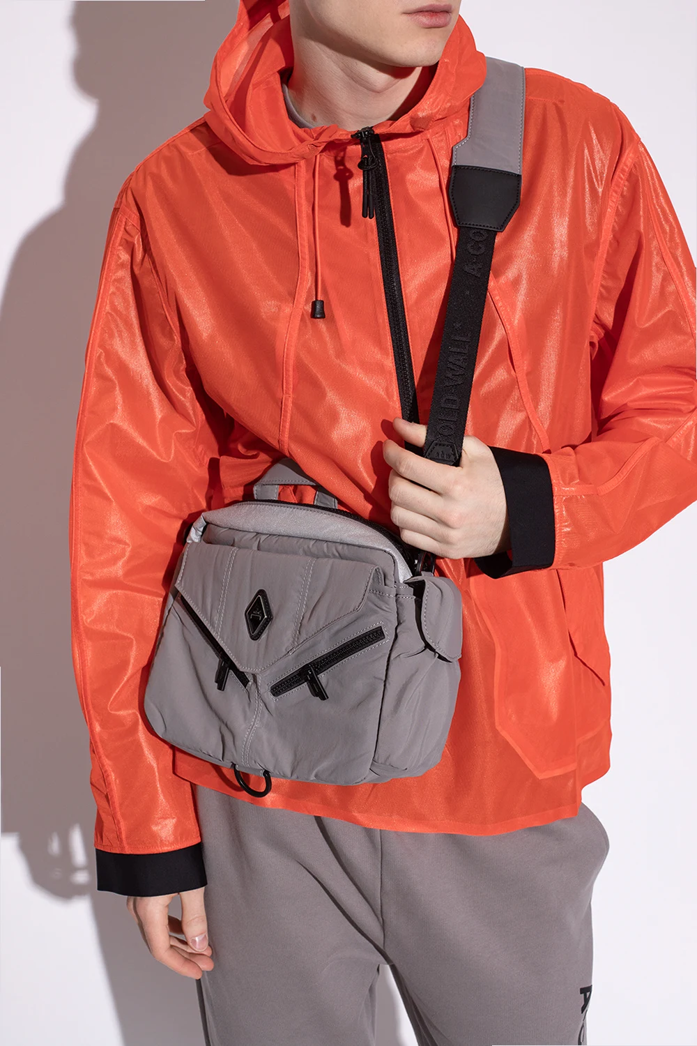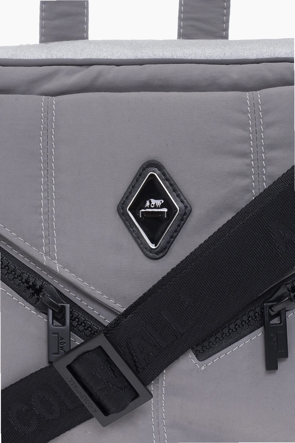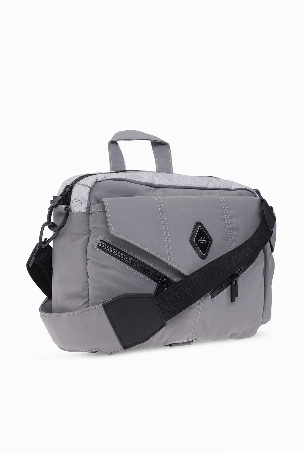 Grey shoulder bag from A-COLD-WALL*. Fastened with a zip, this model is decorated with a black and silver-tone logo patch and is complete with three front and back pockets, detachable and adjustable strap, half-round handle, silver-tone metal hardware and one internal compartment with two slip pockets and one zip pocket.