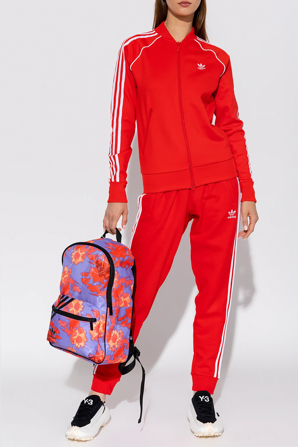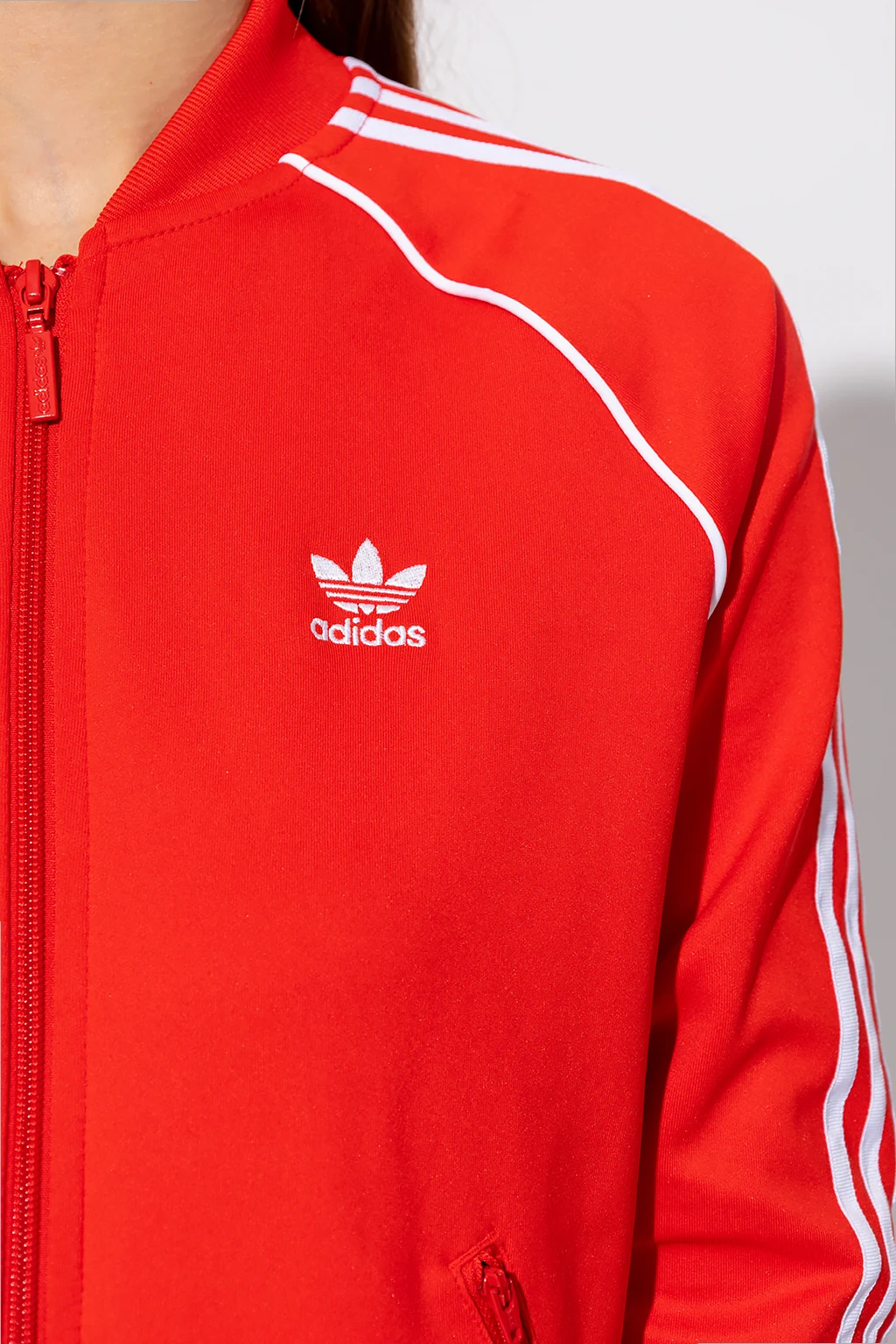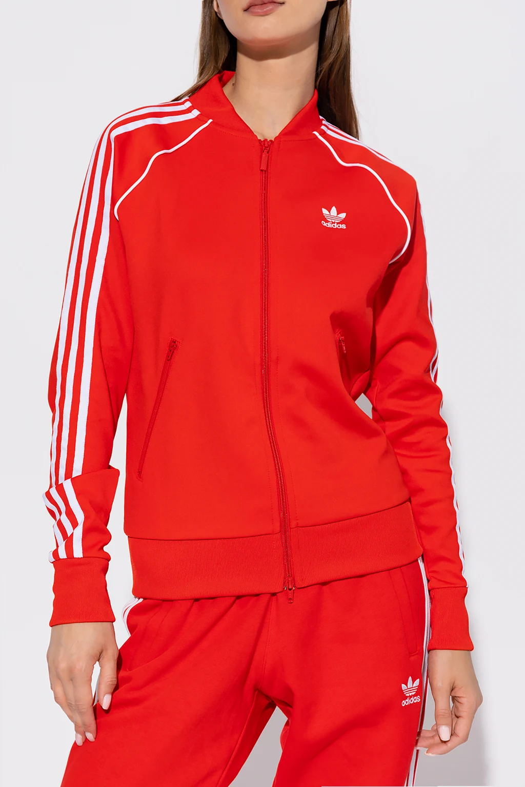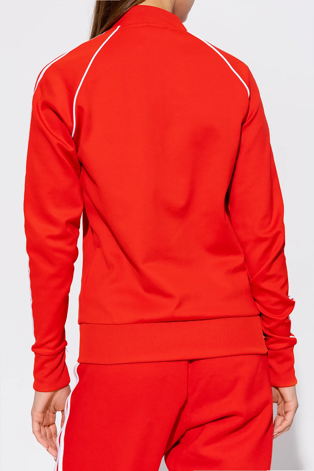 Red sweatshirt with a standing collar from ADIDAS Originals. Crafted from recycled materials, this style showcases a zip fastening, an embroidered logo and the brand's signature three stripes in white, two zip pockets and an elasticated bottom hem and cuffs.