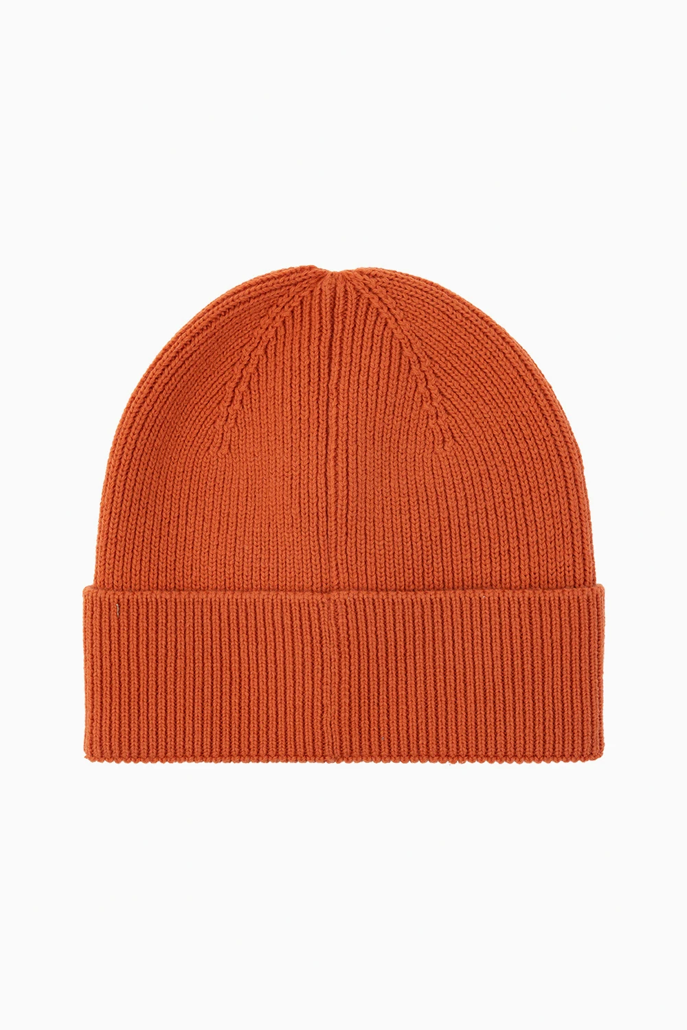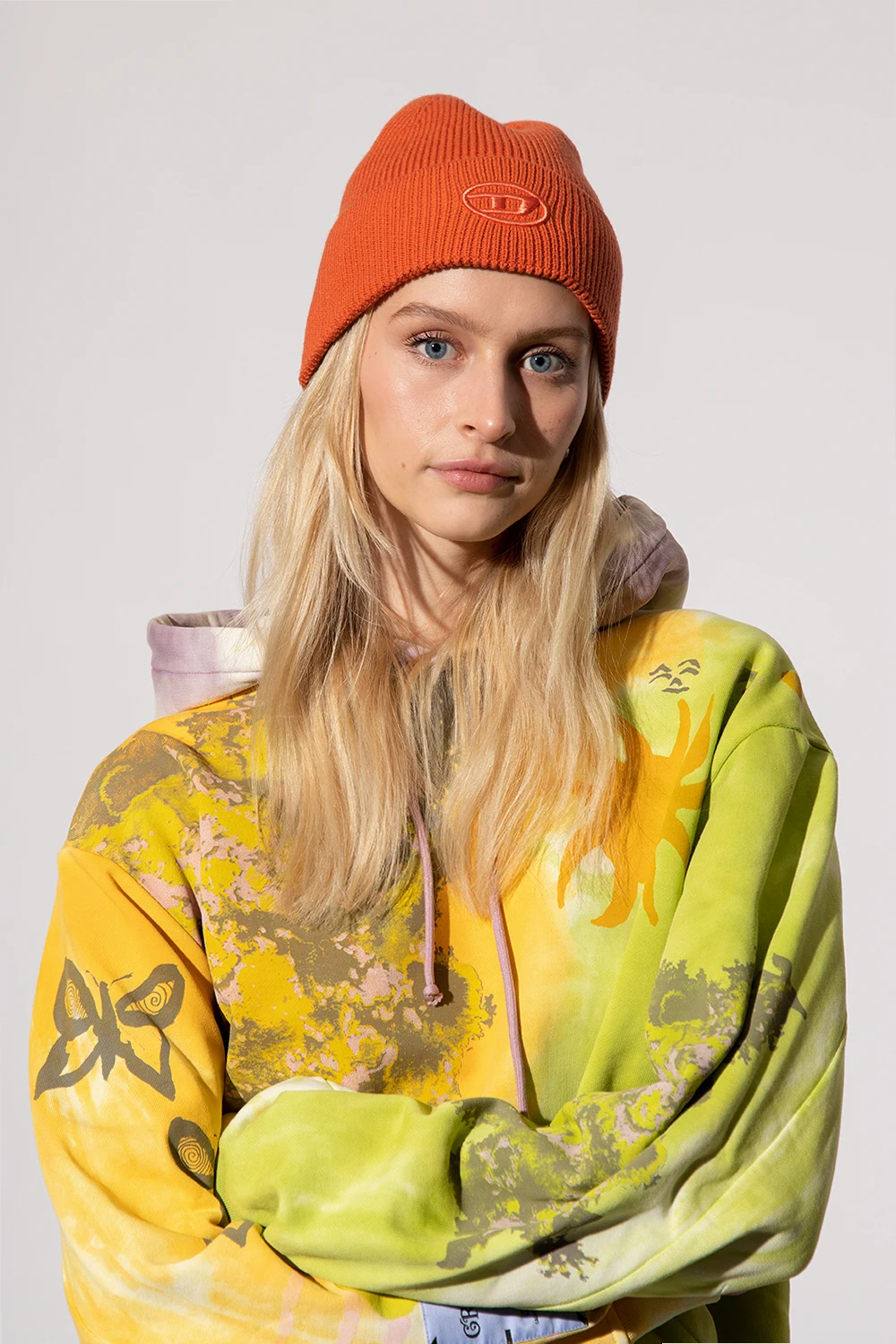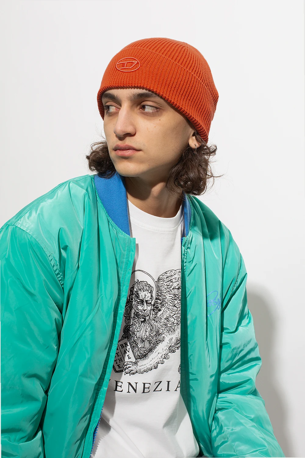 Orange beanie from Diesel. Crafted from a ribbed wool and cotton blend, this item features a logo patch for brand recognition.