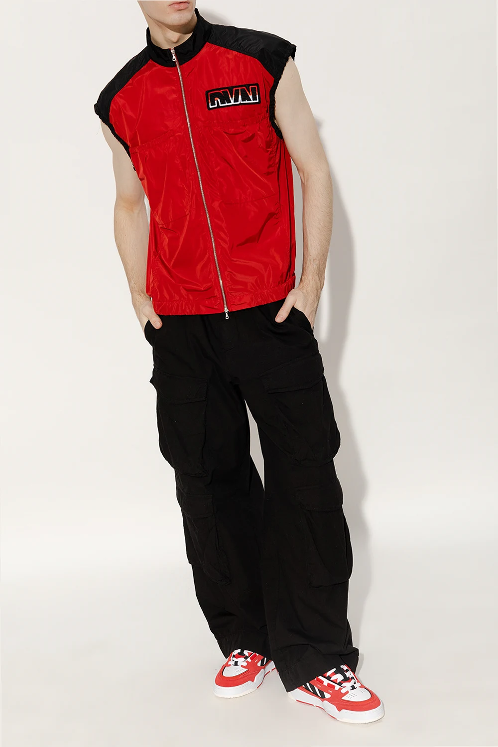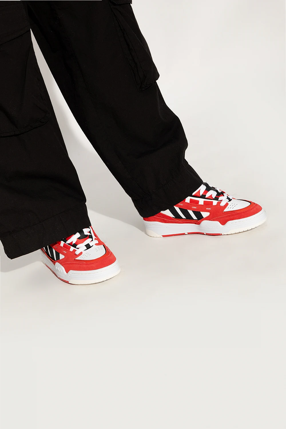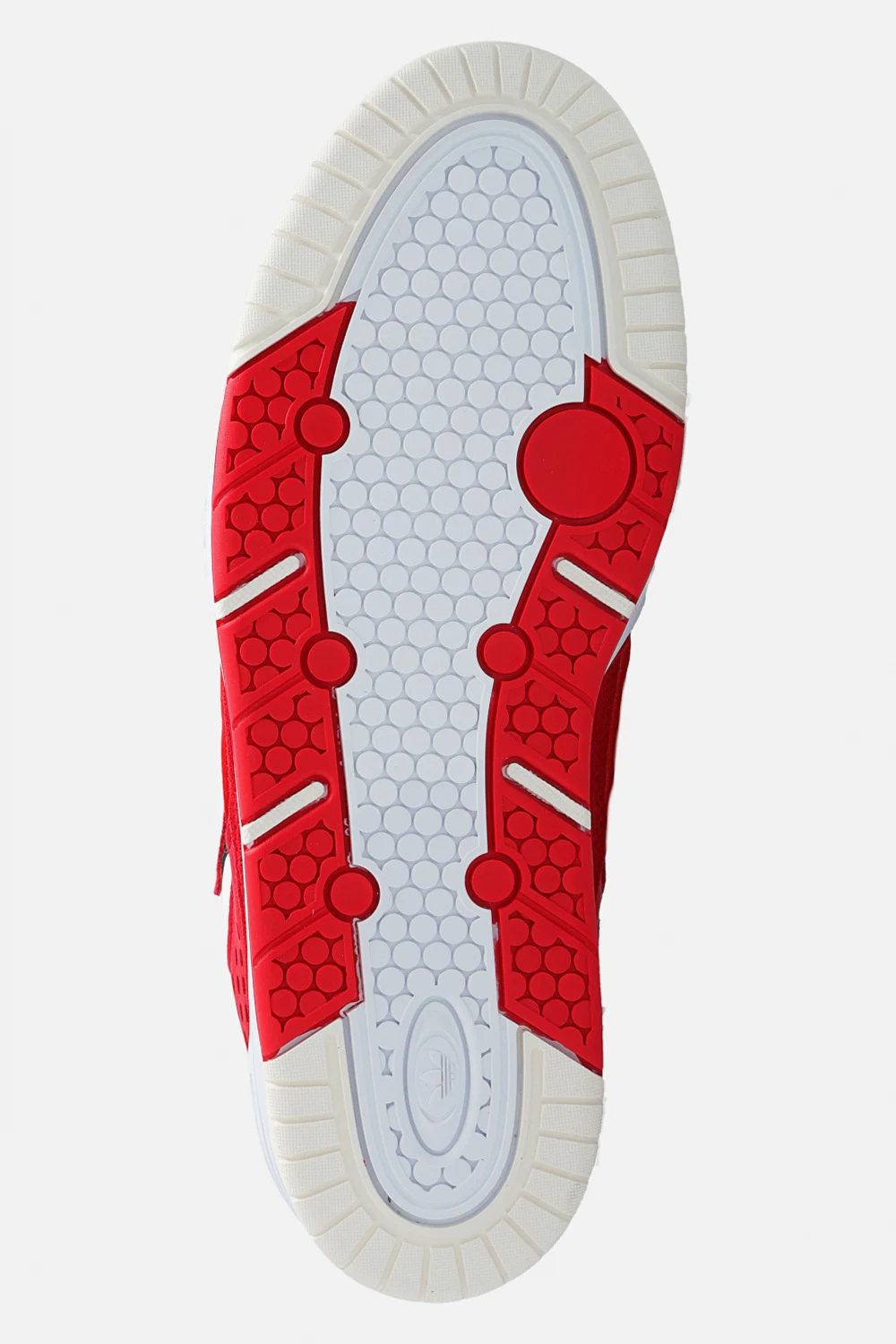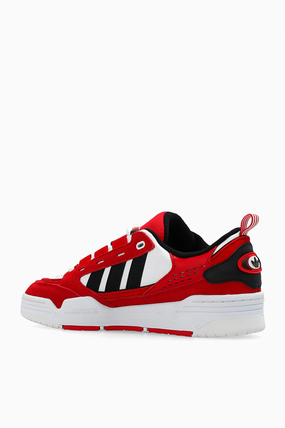 Red and white ‘ADI2000’ sneakers from ADIDAS Originals. Crafted from leather and fabric, this lace-up model sits on a white rubber sole and showcases a logo application and the brand's signature three stripes.