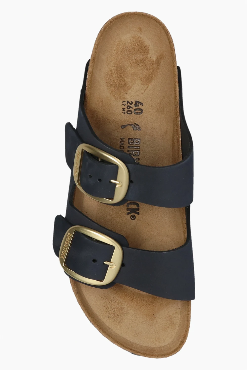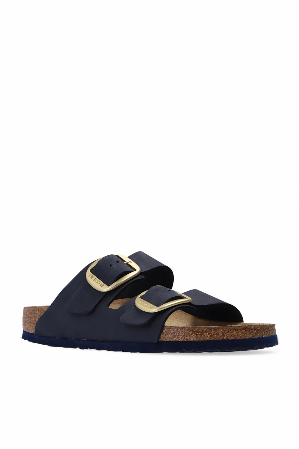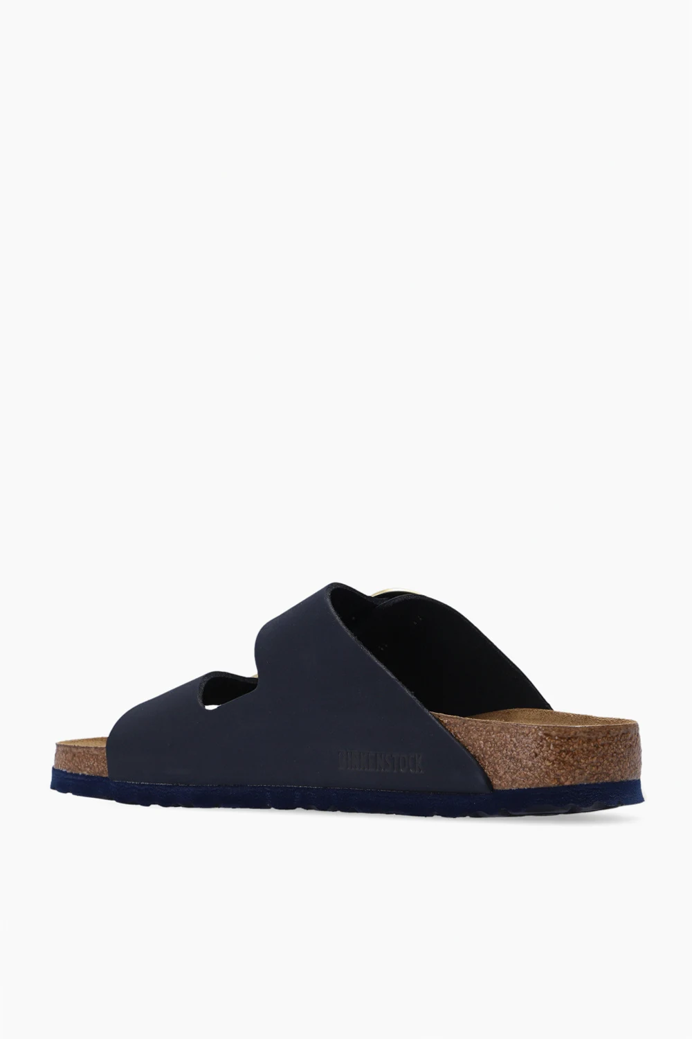 Navy ‘Arizona Big Buckle’ slides from Birkenstock. Crafted from nubuck, this pair features straps with a gold-tone logo-embossed buckle and rests on a brown and navy sole made of cork and EVA foam.