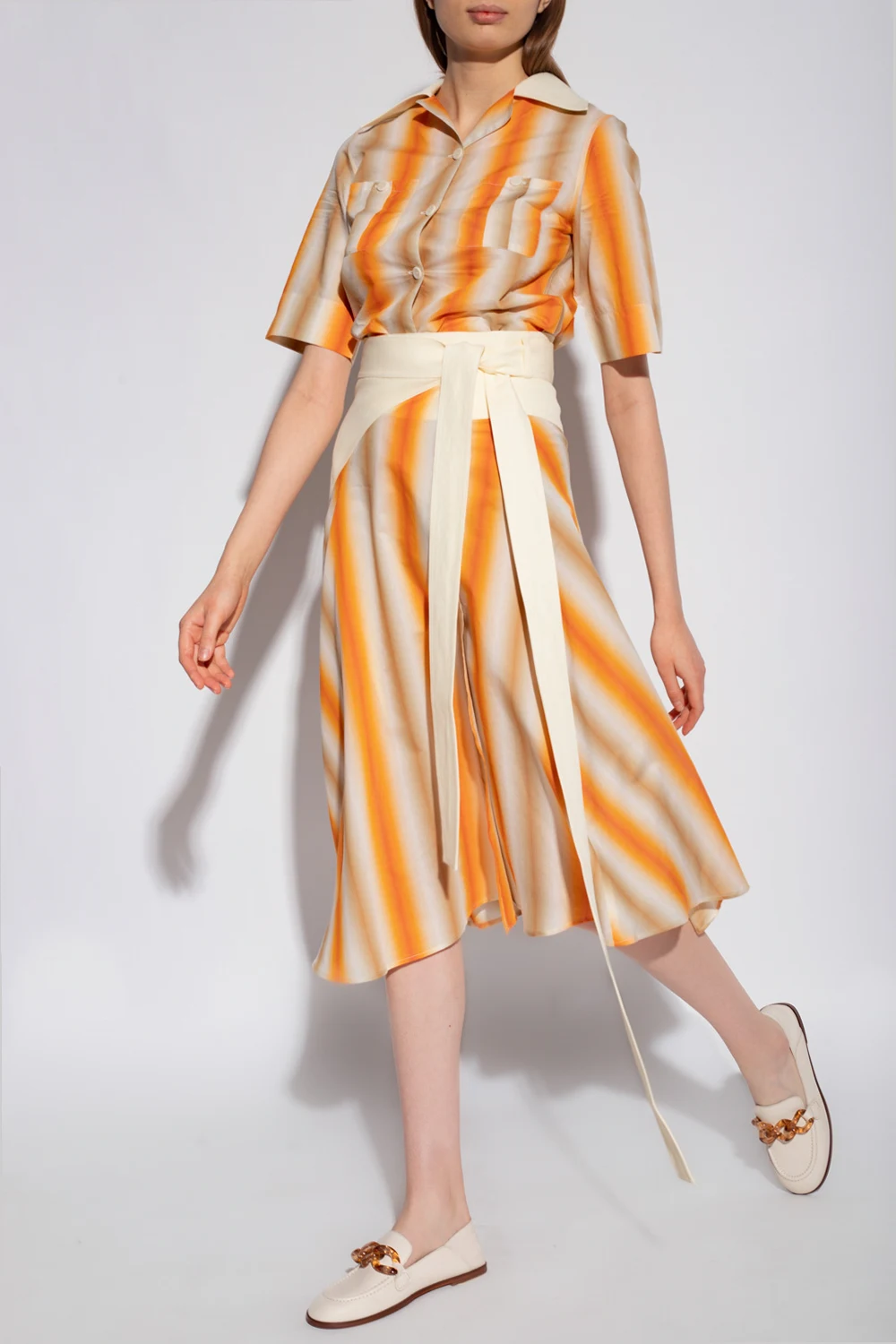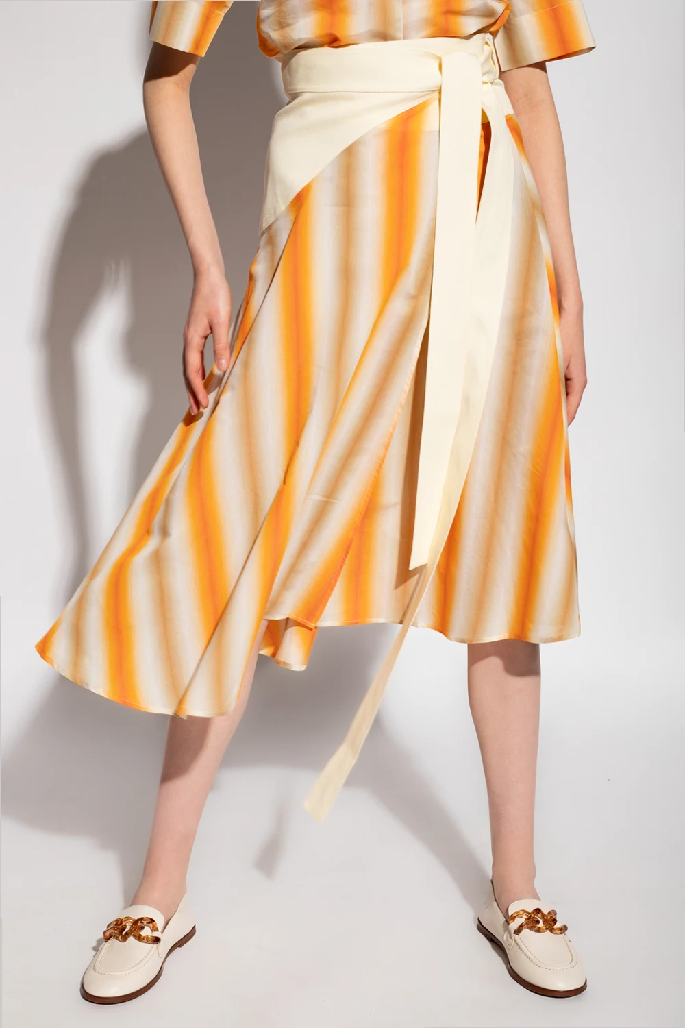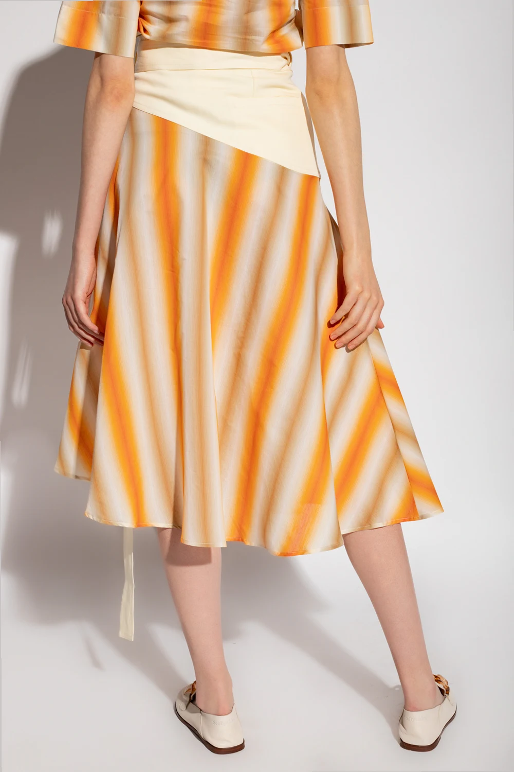 Cream, orange and brown ‘Sunrise’ skirt from Wales Bonner. Crafted from a cotton, silk and linen blend, this design features a strap with pleats, stripe pattern and slip pocket.