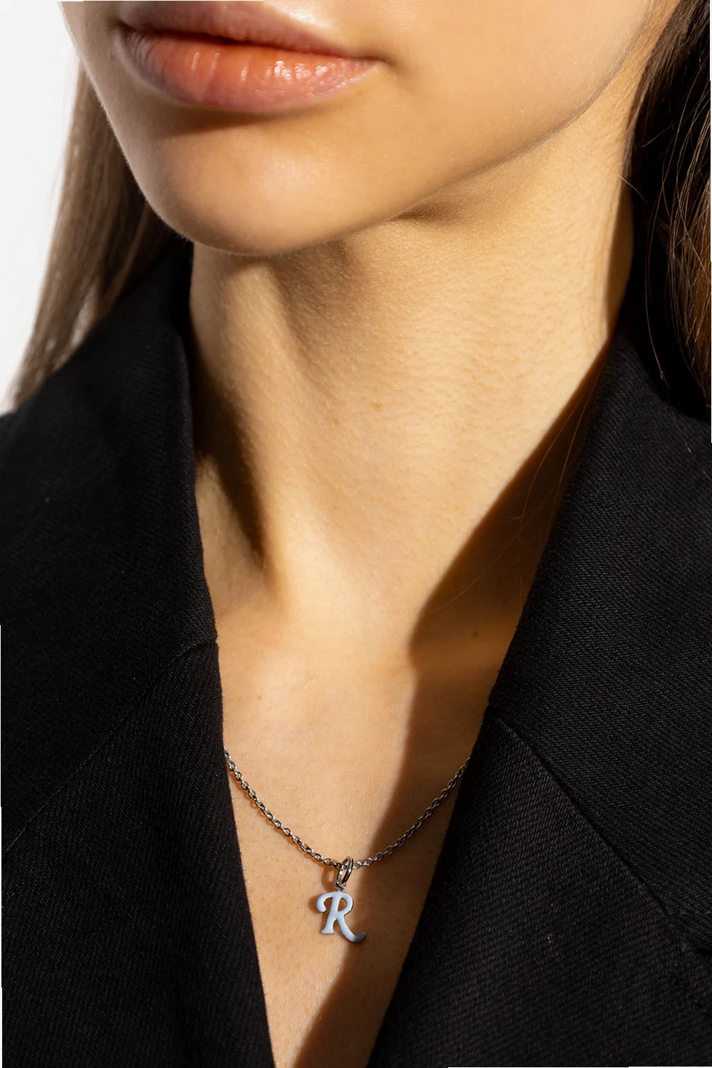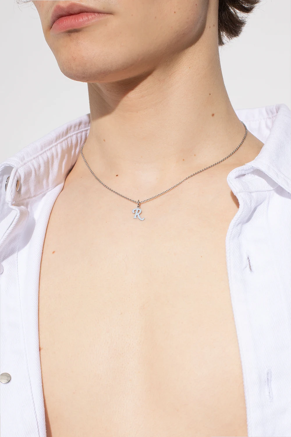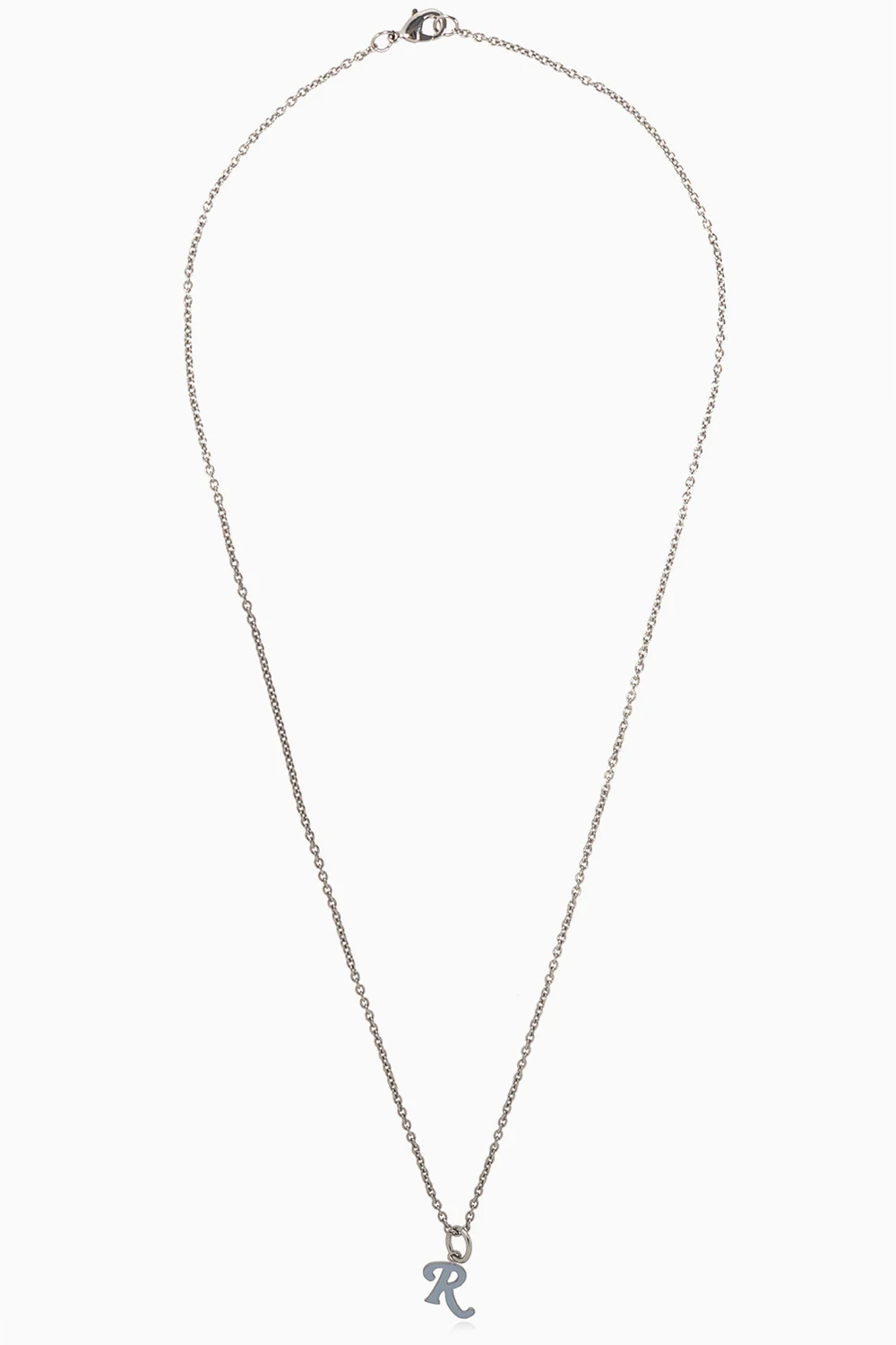 Silver-tone necklace from Raf Simons. Crafted from brass, this item features a lobster clasp and logo charm in light blue.