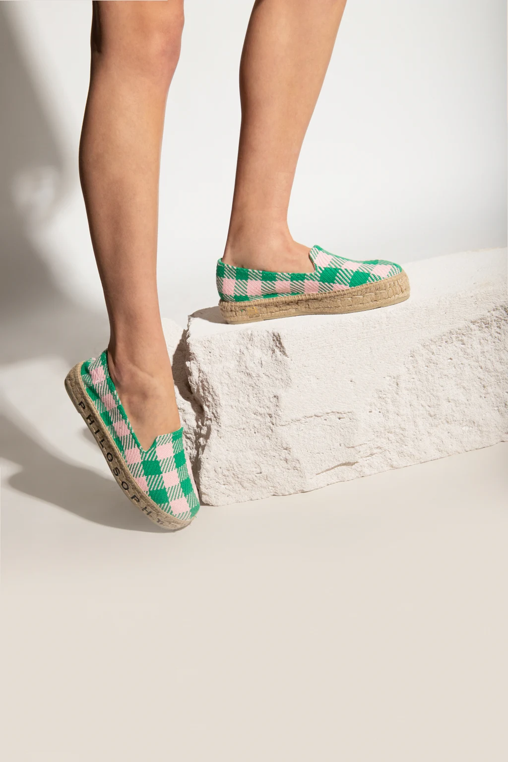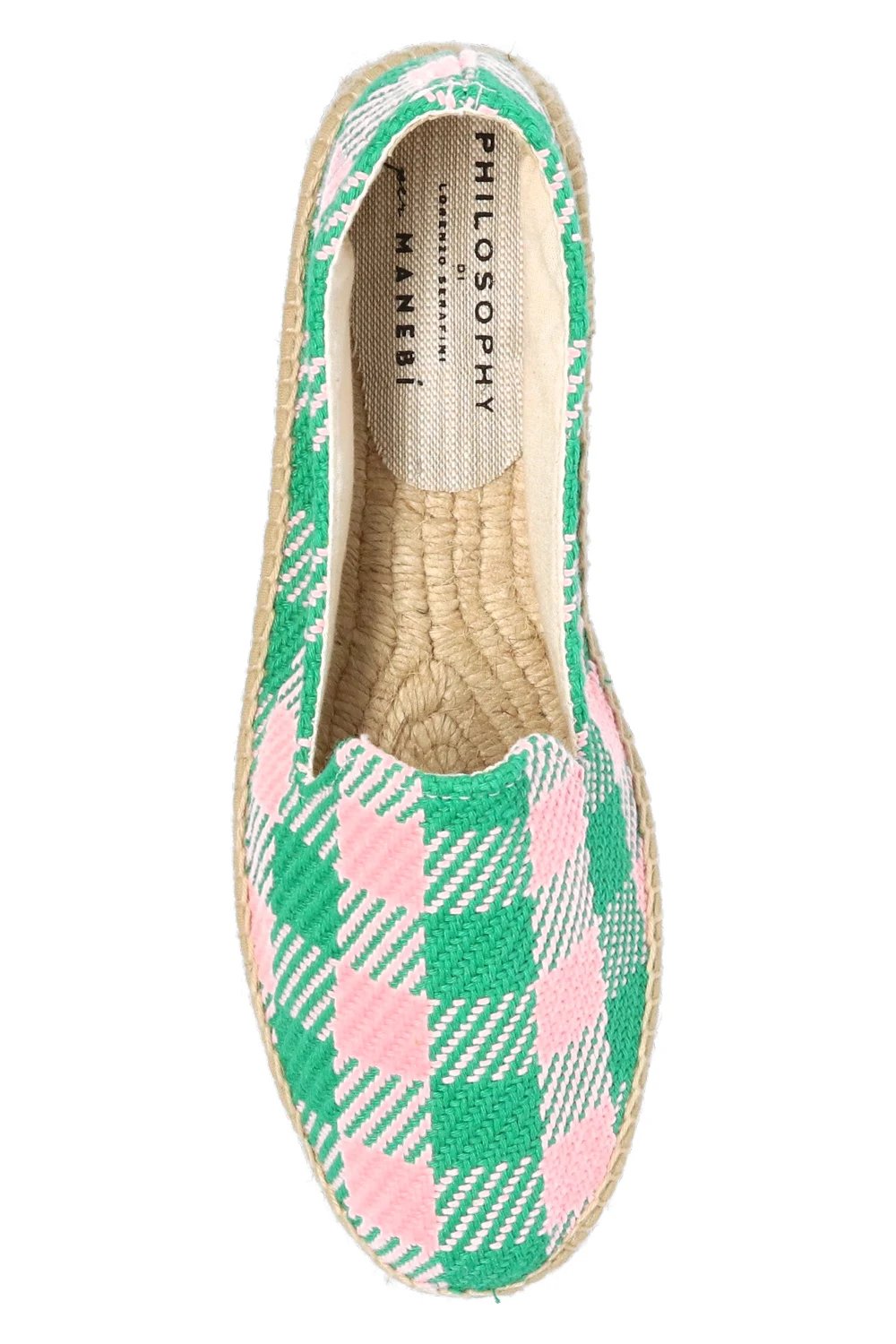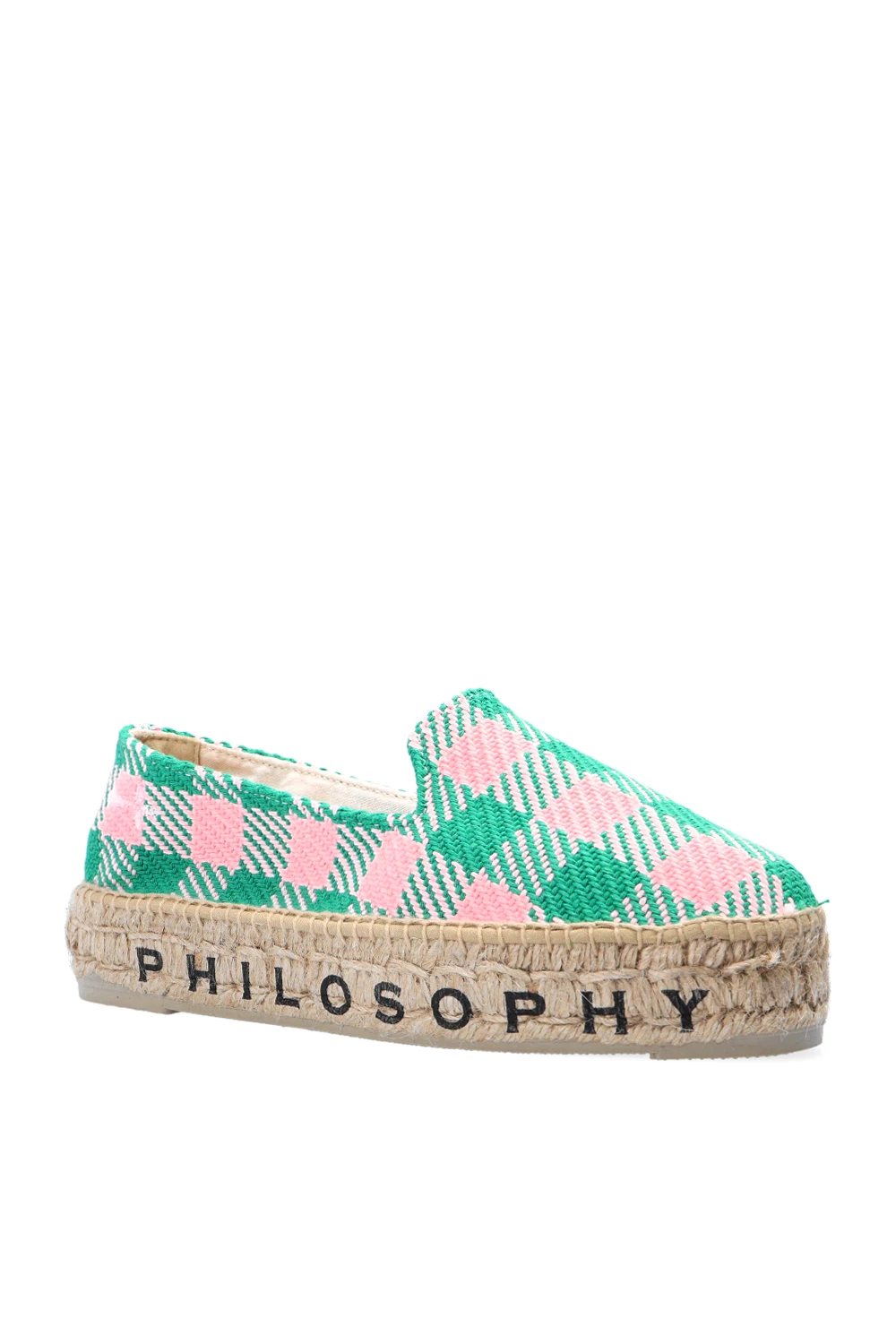 Green and pink woven espadrilles from Philosophy x Manebi. Set on a beige rubber sole, this pair is decorated with embroidered and printed logo details in black.