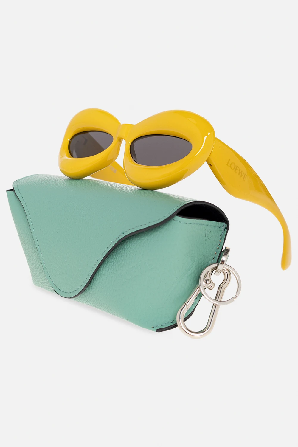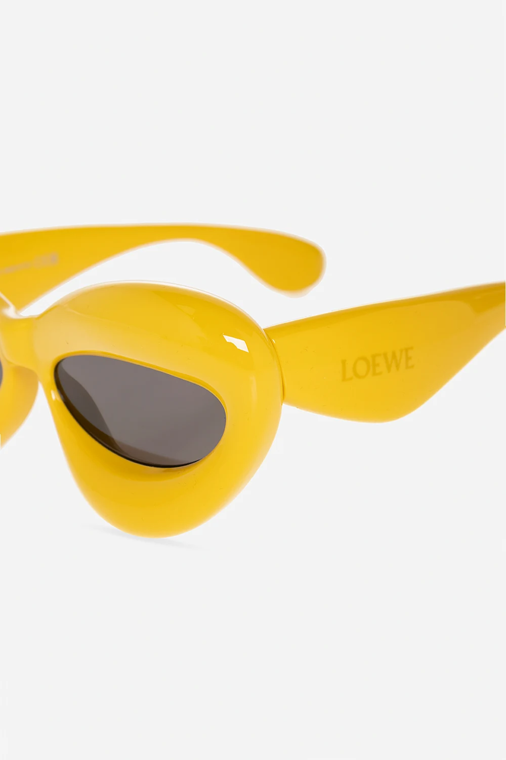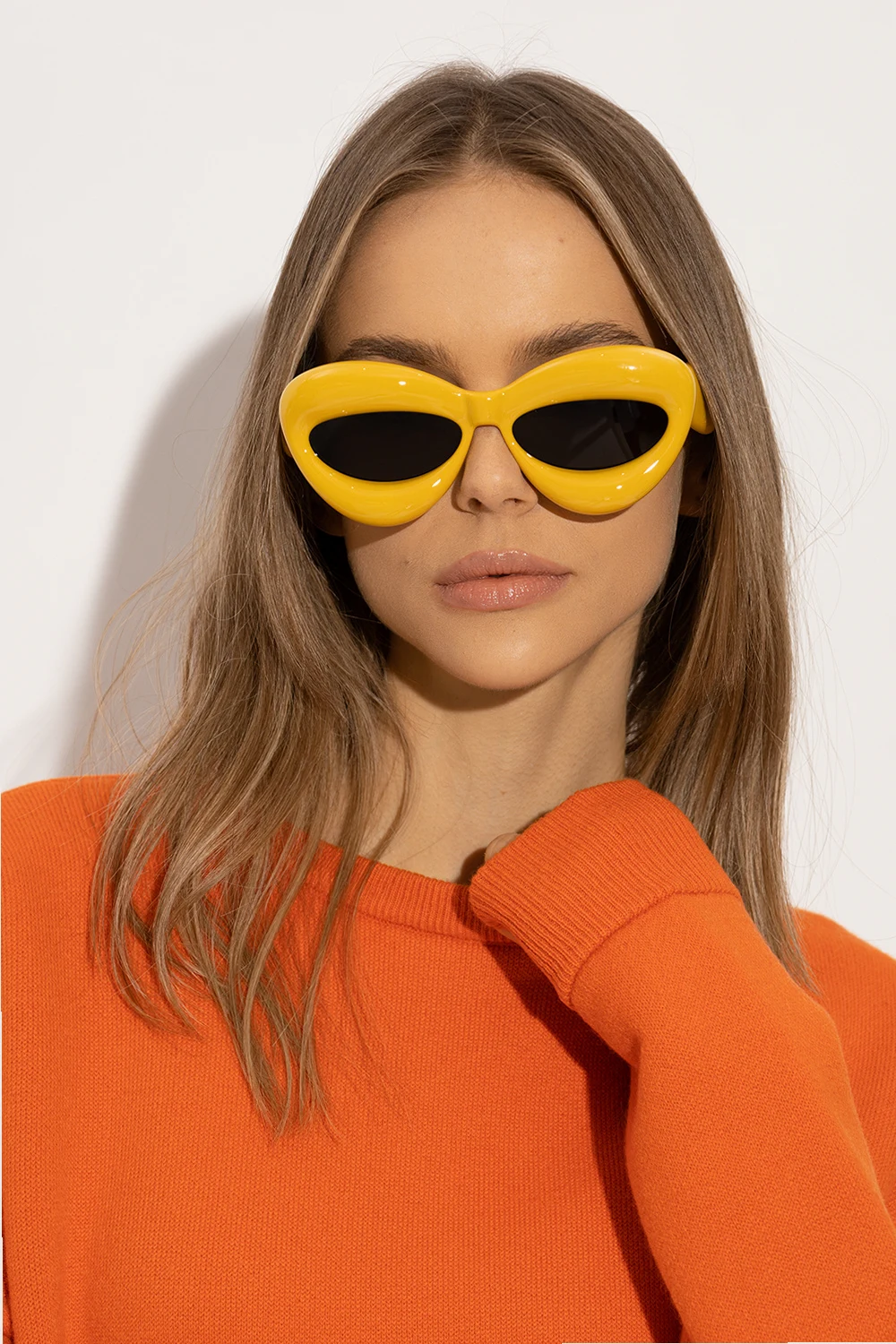 Yellow sunglasses from Loewe. Made of acetate, this pair has thick, oversize, cat-eye frames, logo print on the sides and grey nylon lenses with 100% UV protection. Comes with a case.