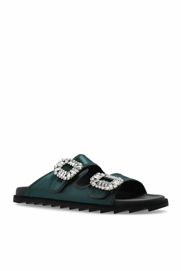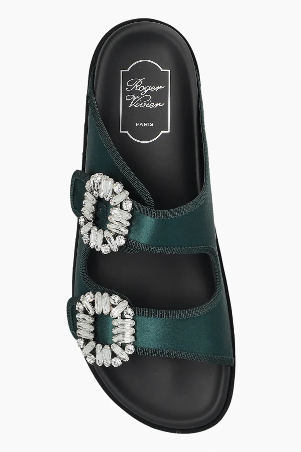 Zwei breite Riemen umschließen den Fuß sicher und werden von markanten, kristallbesetzten Schnallen geschmückt, die mit dezentem Glanz die Blicke auf sich ziehen. Die Originalität des Modells wird durch das verzierte Roger Vivier Paris-Logo unterstrichen, das dezent auf der Innensohle aufgedruckt ist.