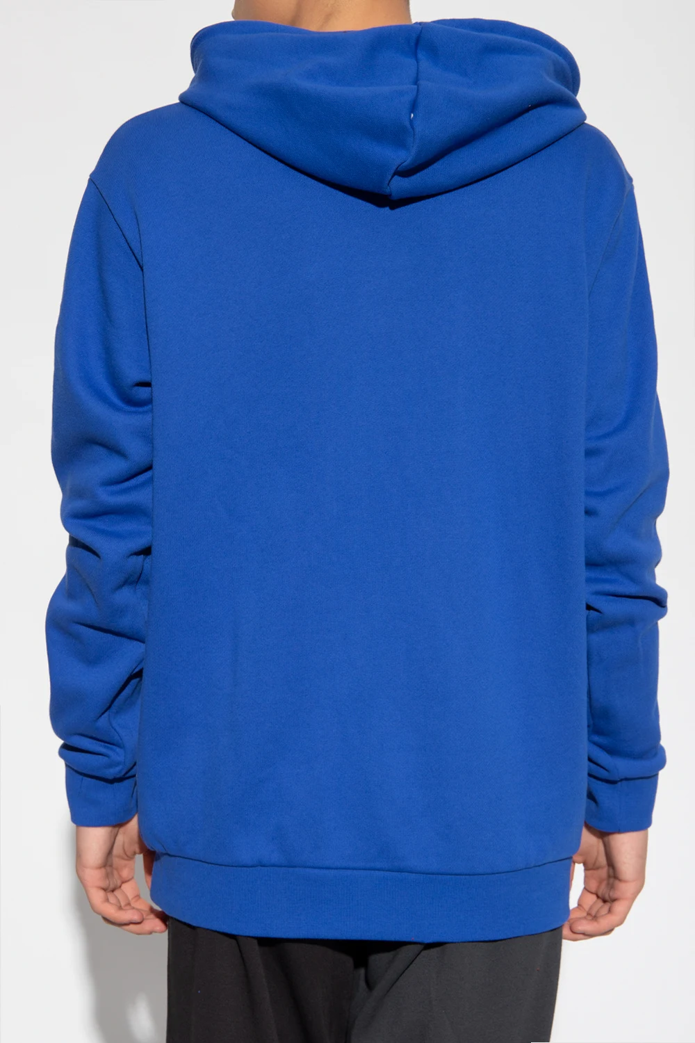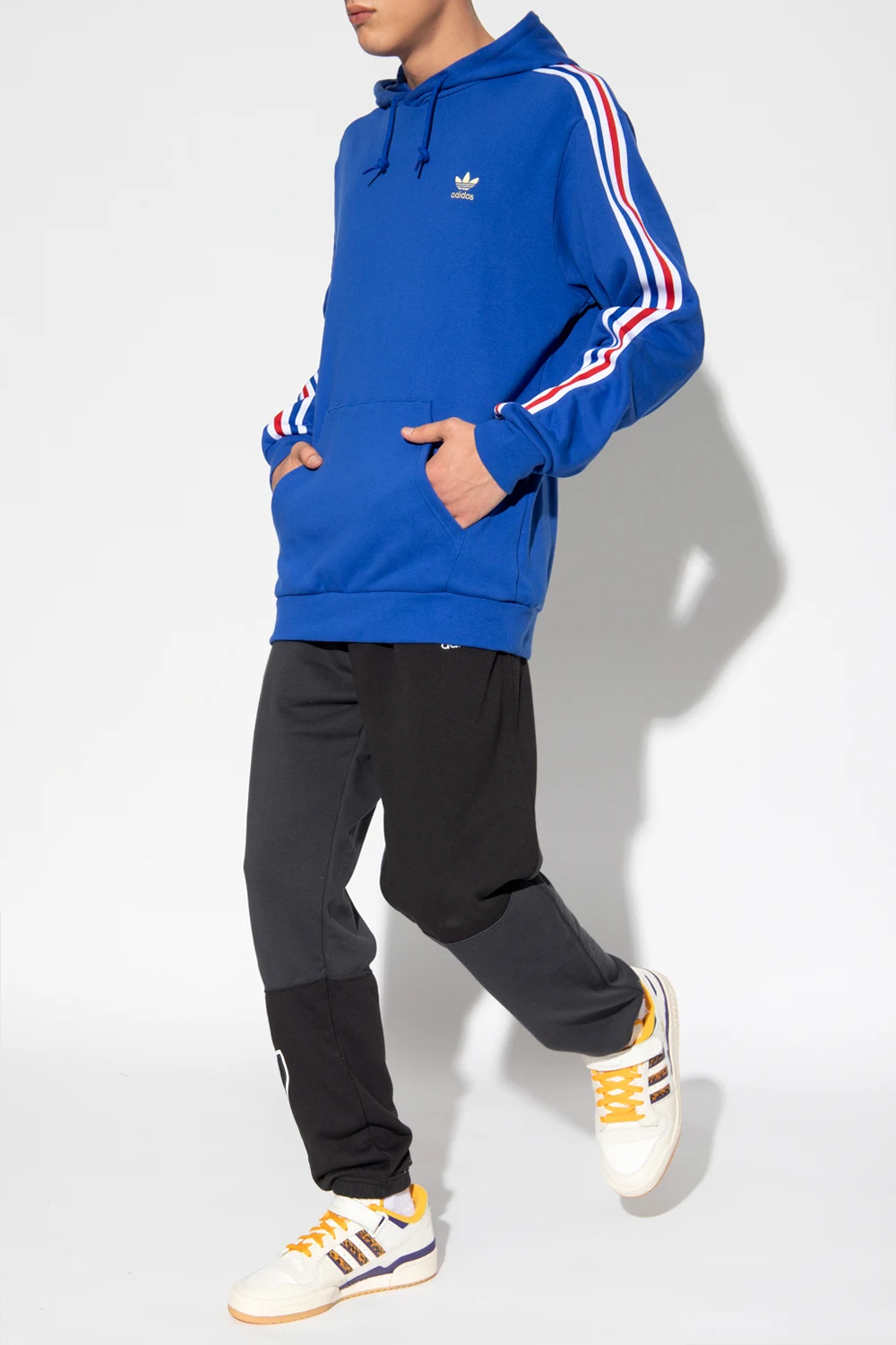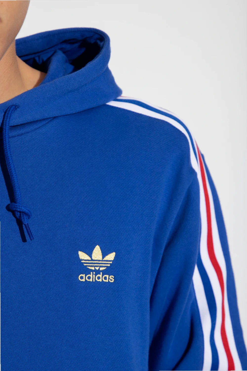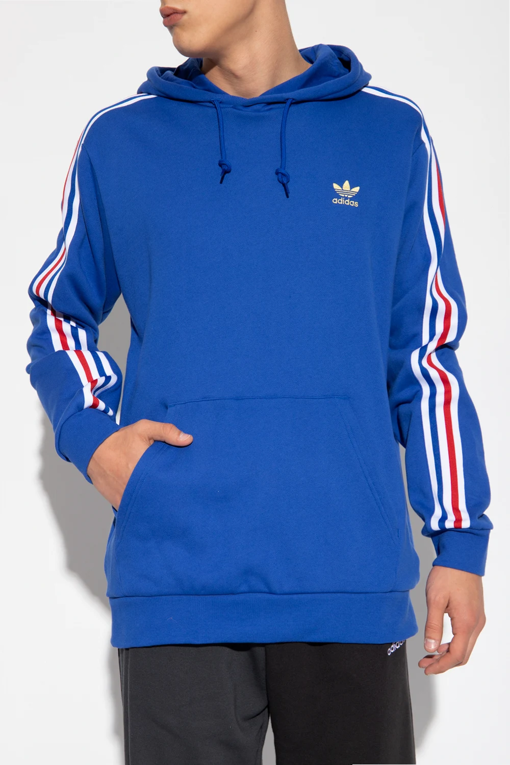 Blue sweatshirt with a drawstring hood from ADIDAS Originals. Crafted from cotton jersey, this style features an embroidered logo, white, blue and red stripe detailing, a kangaroo pocket, long sleeves and a ribbed bottom hem and cuffs.
