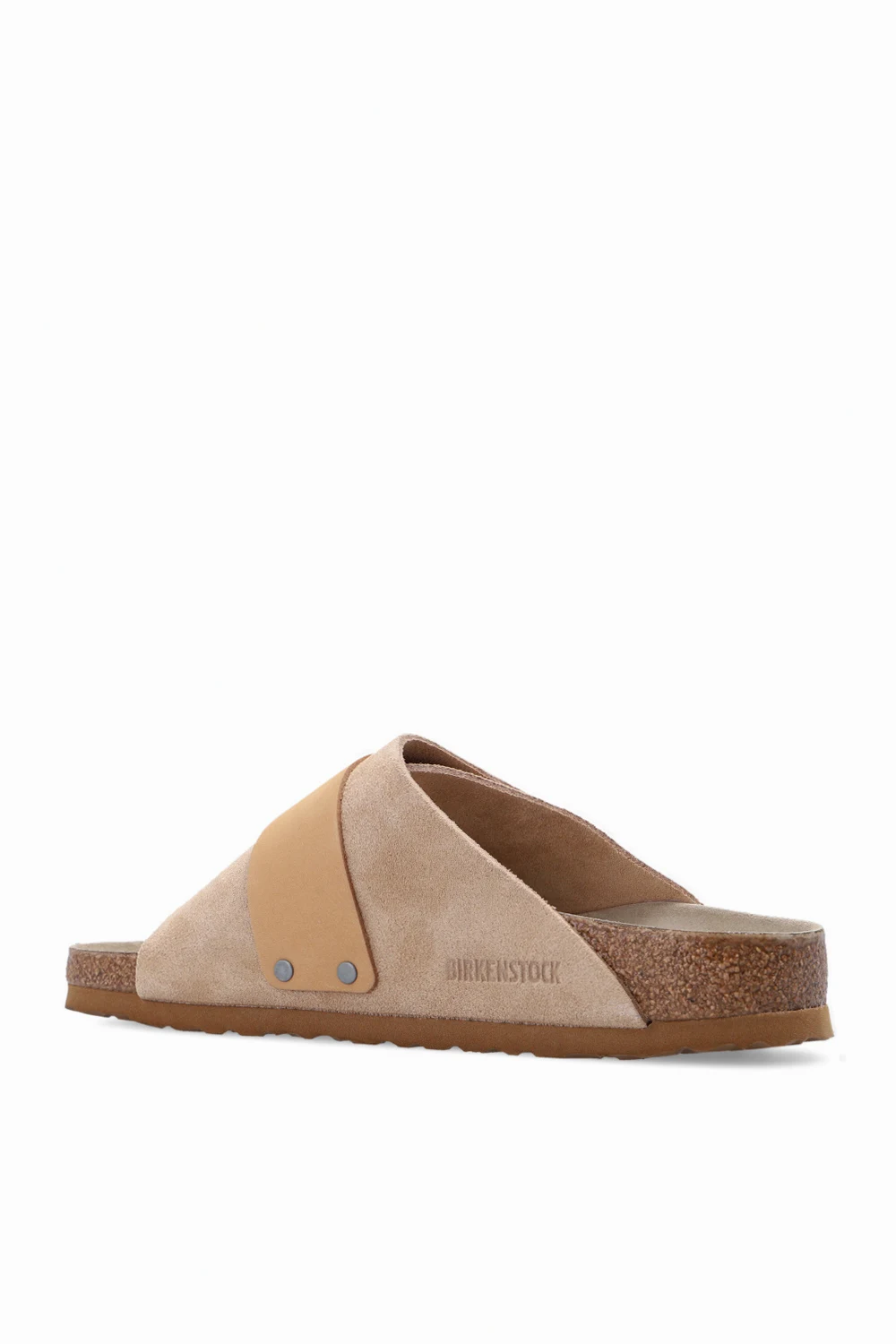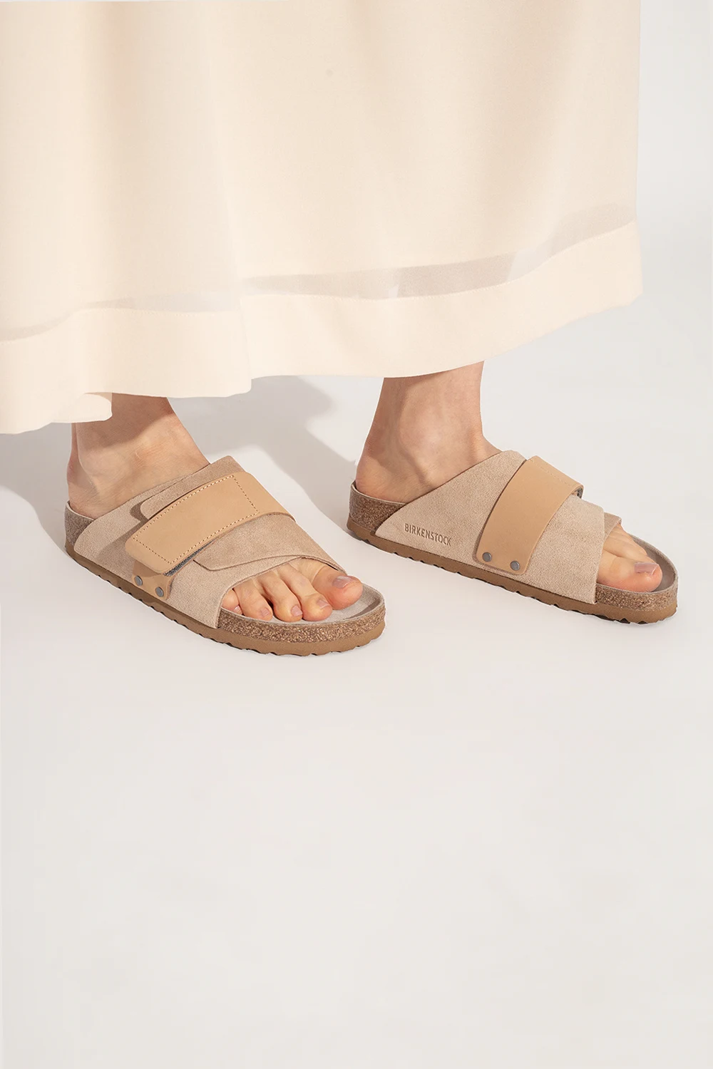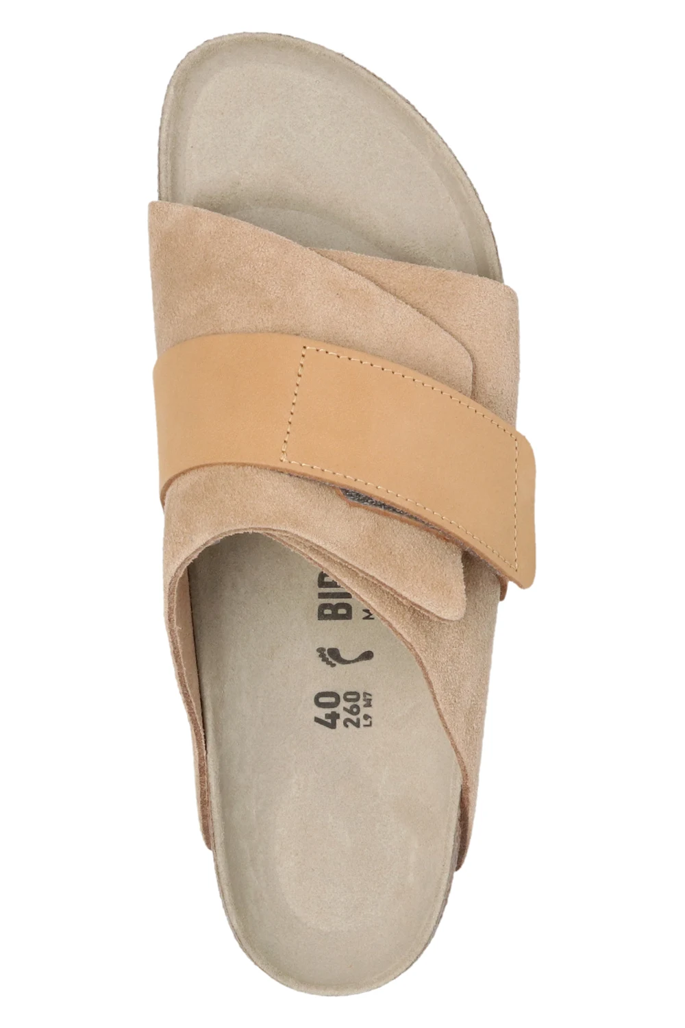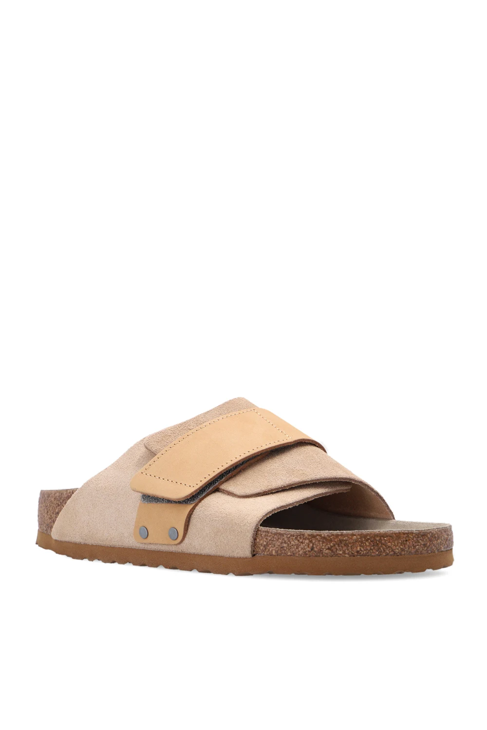 Beige ‘Kyoto’ slides from Birkenstock. Made of leather, this model features velcro closures and a brown sole in natural cork and EVA.