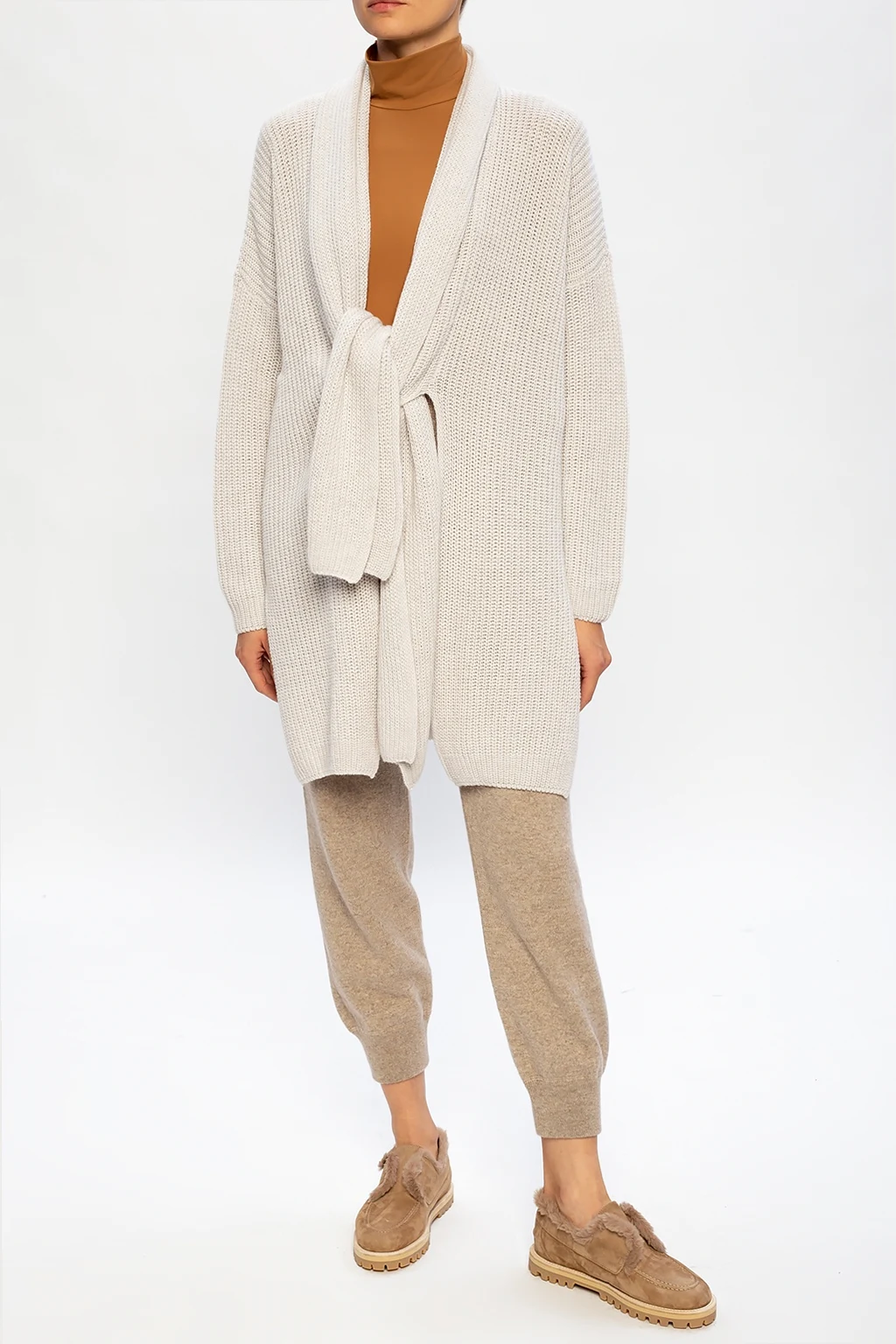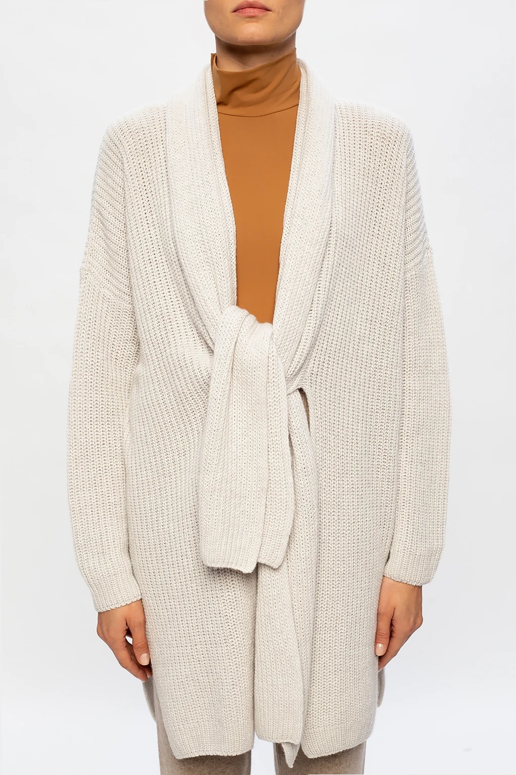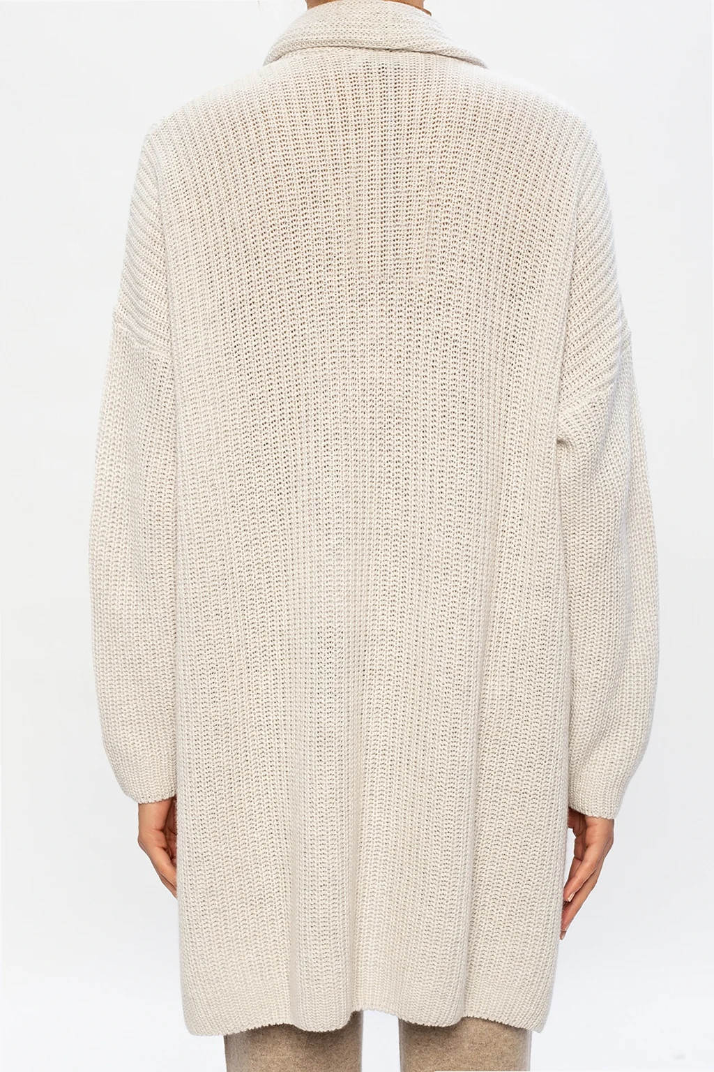 Beige cardigan from Agnona. Knitted from cashmere with a ribbed structure, this piece is complete with long sleeves and side vents.