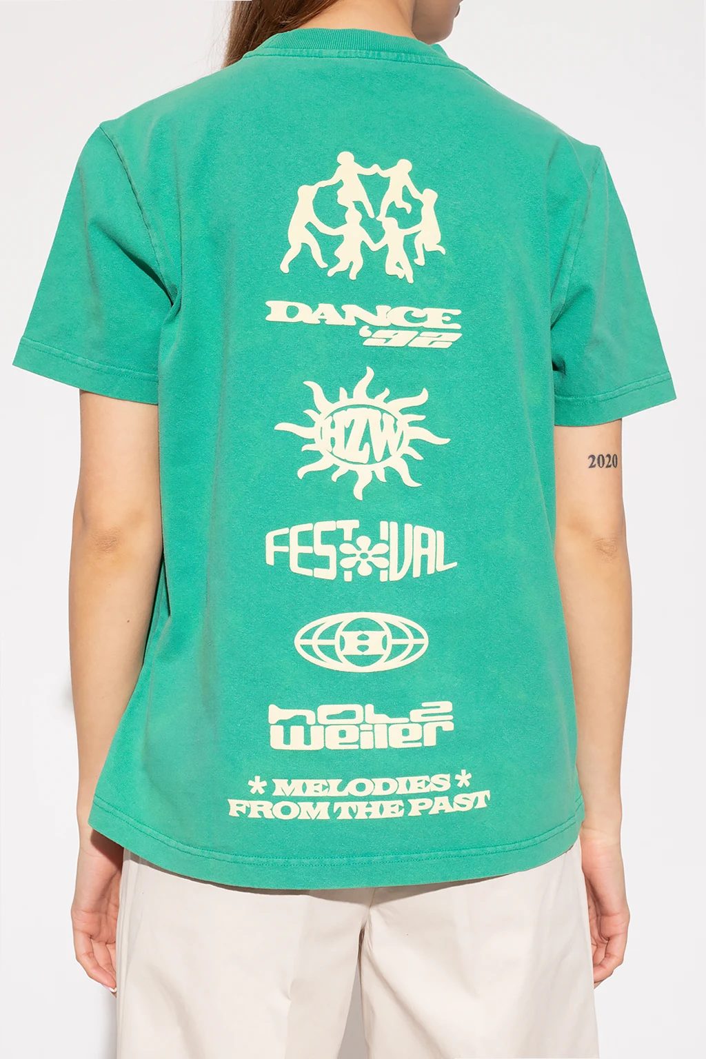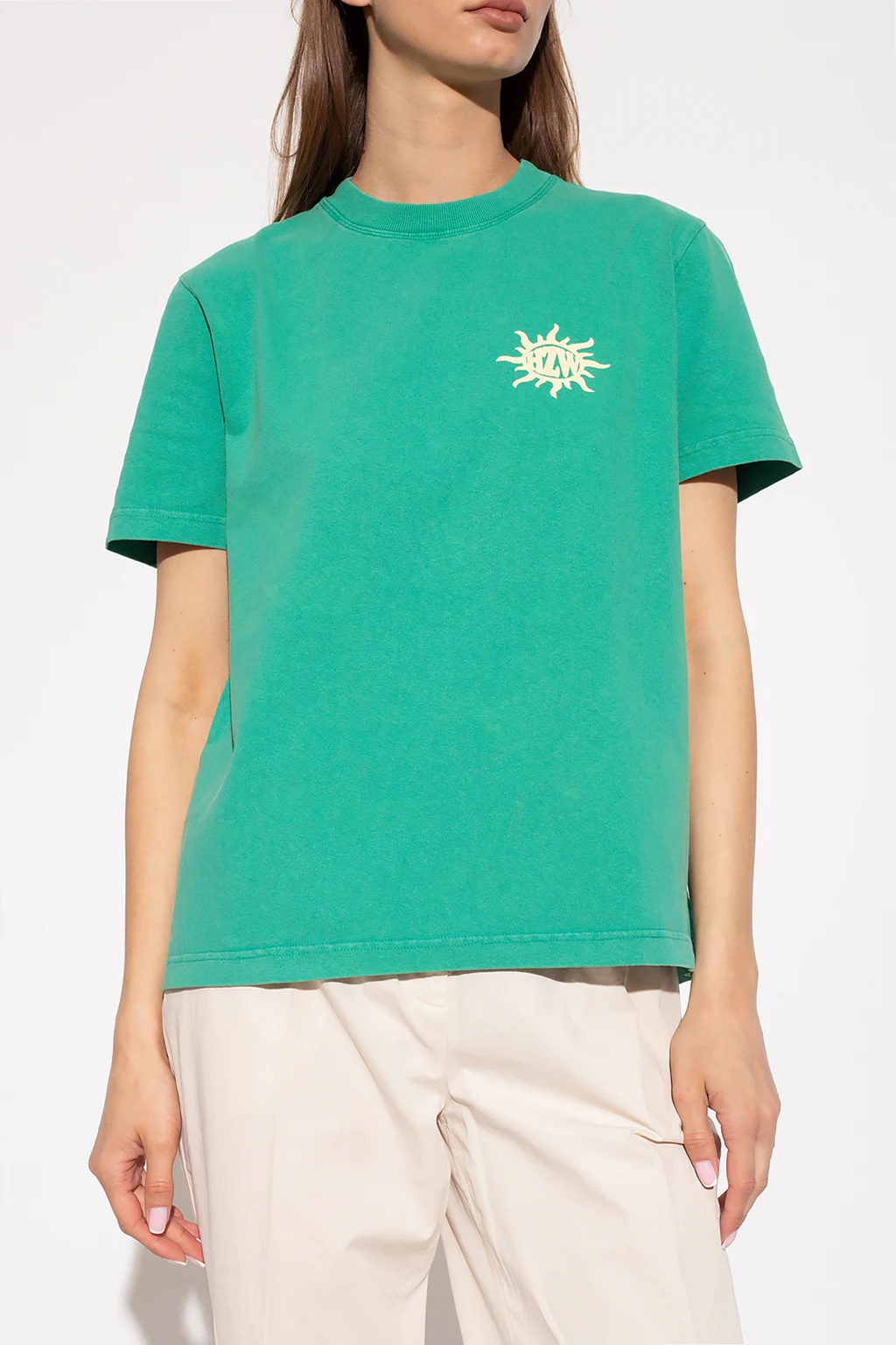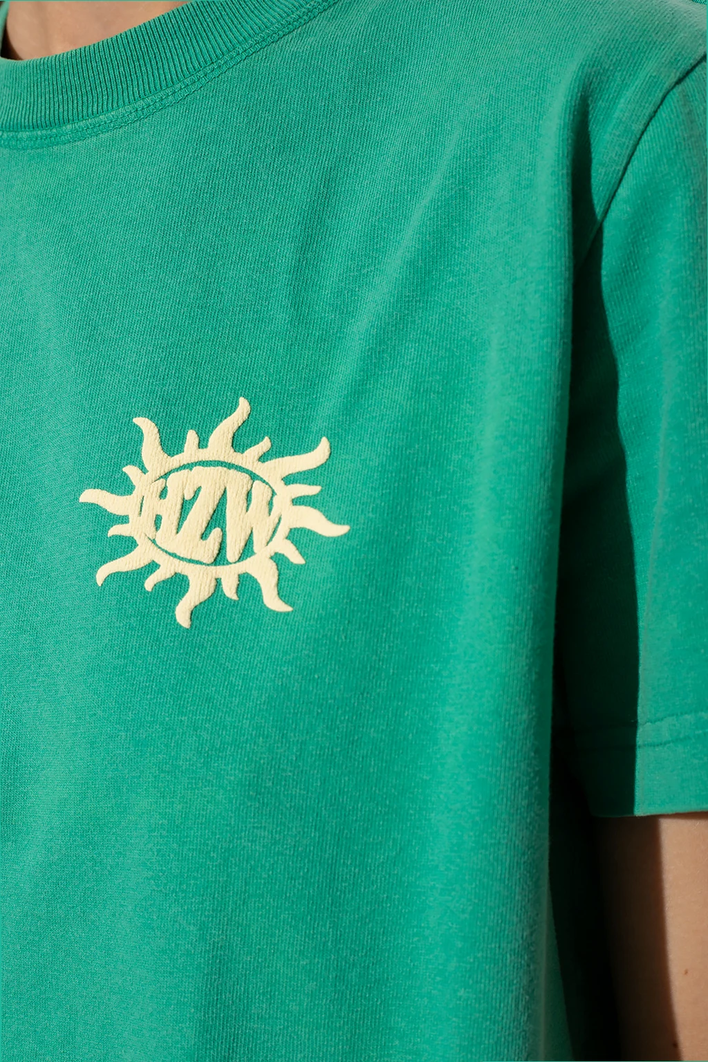 Greenish blue ‘W.Kjerag National’ crewneck T-shirt from Holzweiler. Crafted from organic cotton, this style features short sleeves, an elasticated collar and a cream graphic pattern on the front and back.