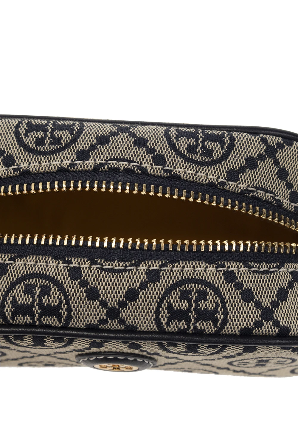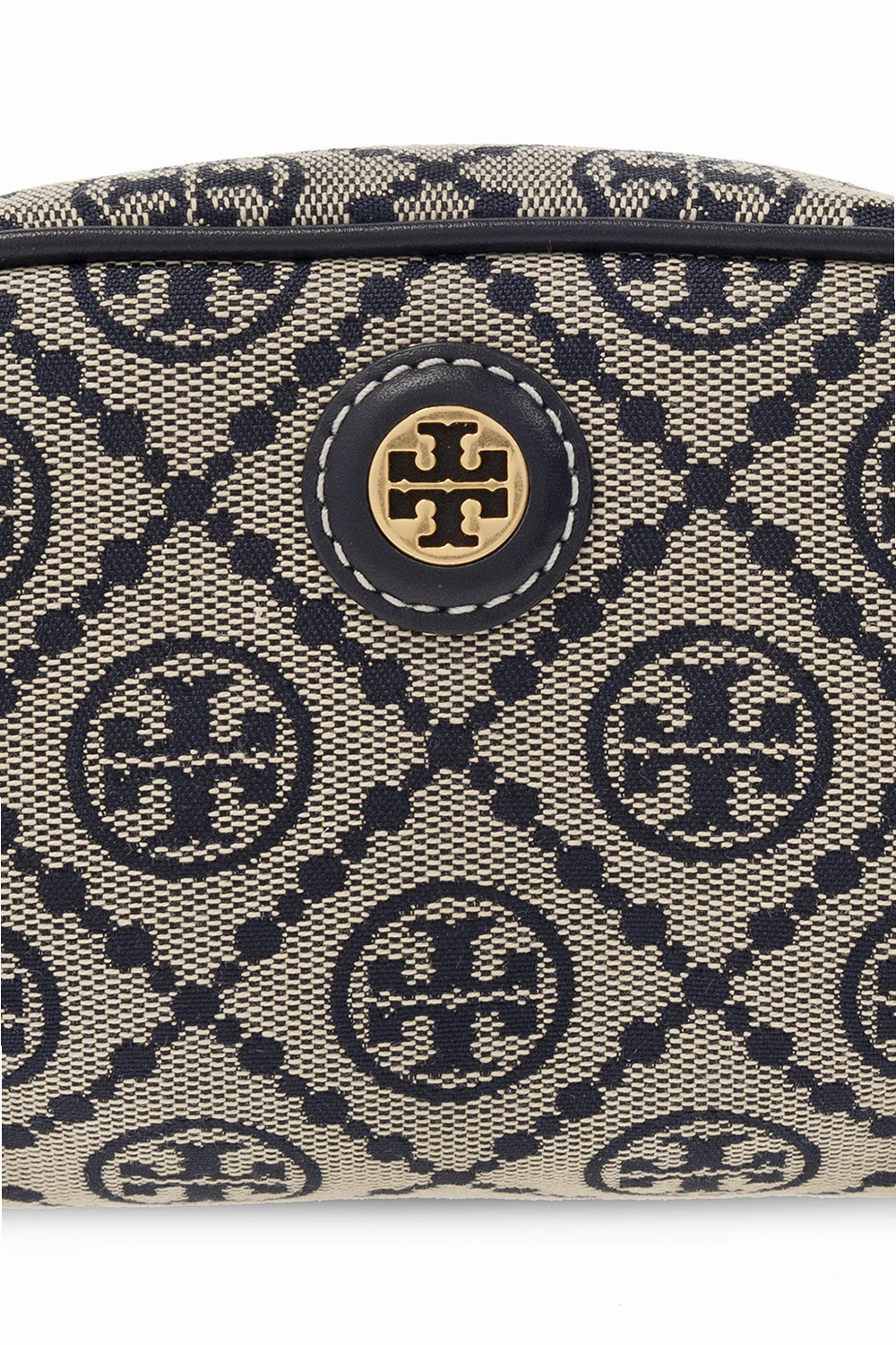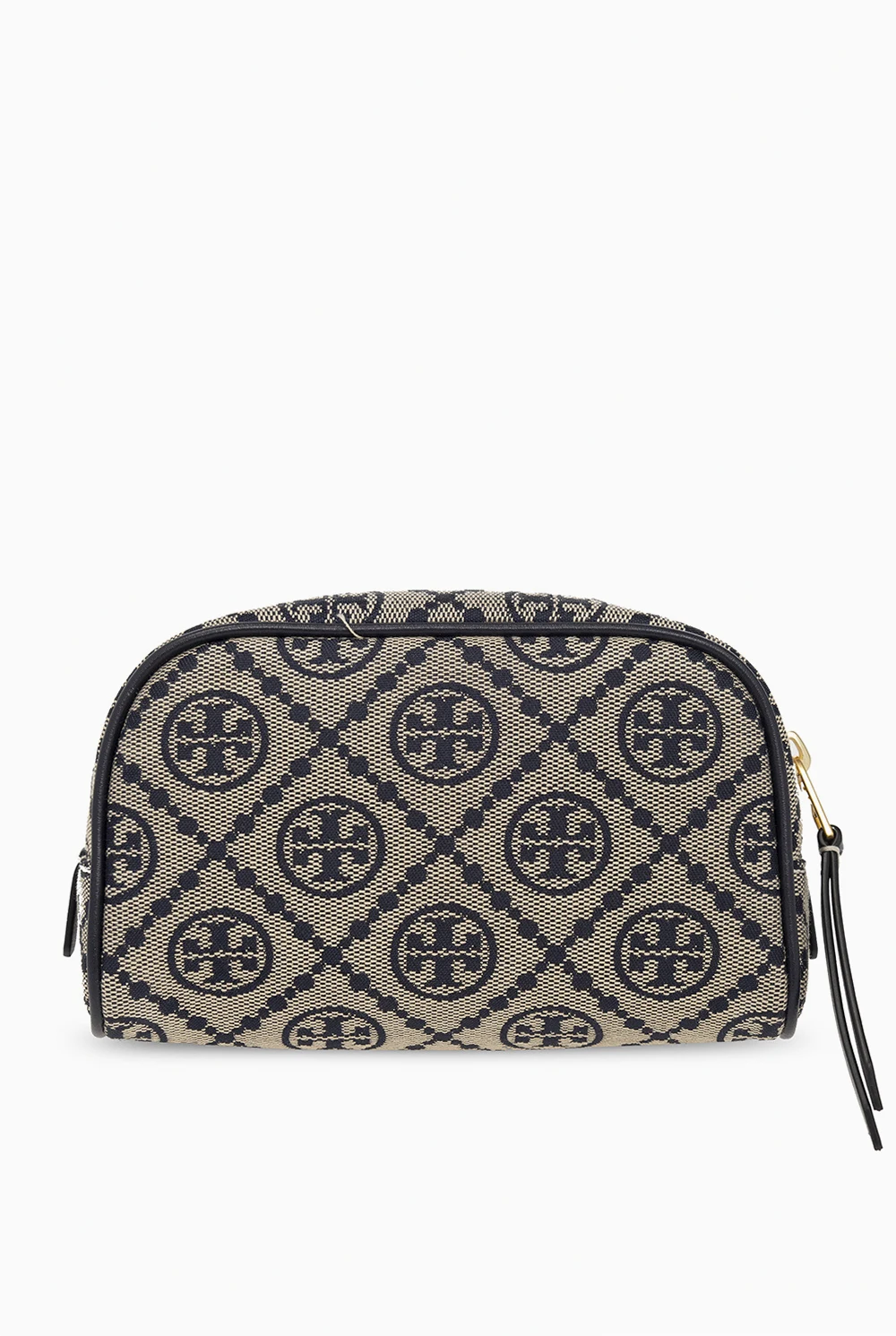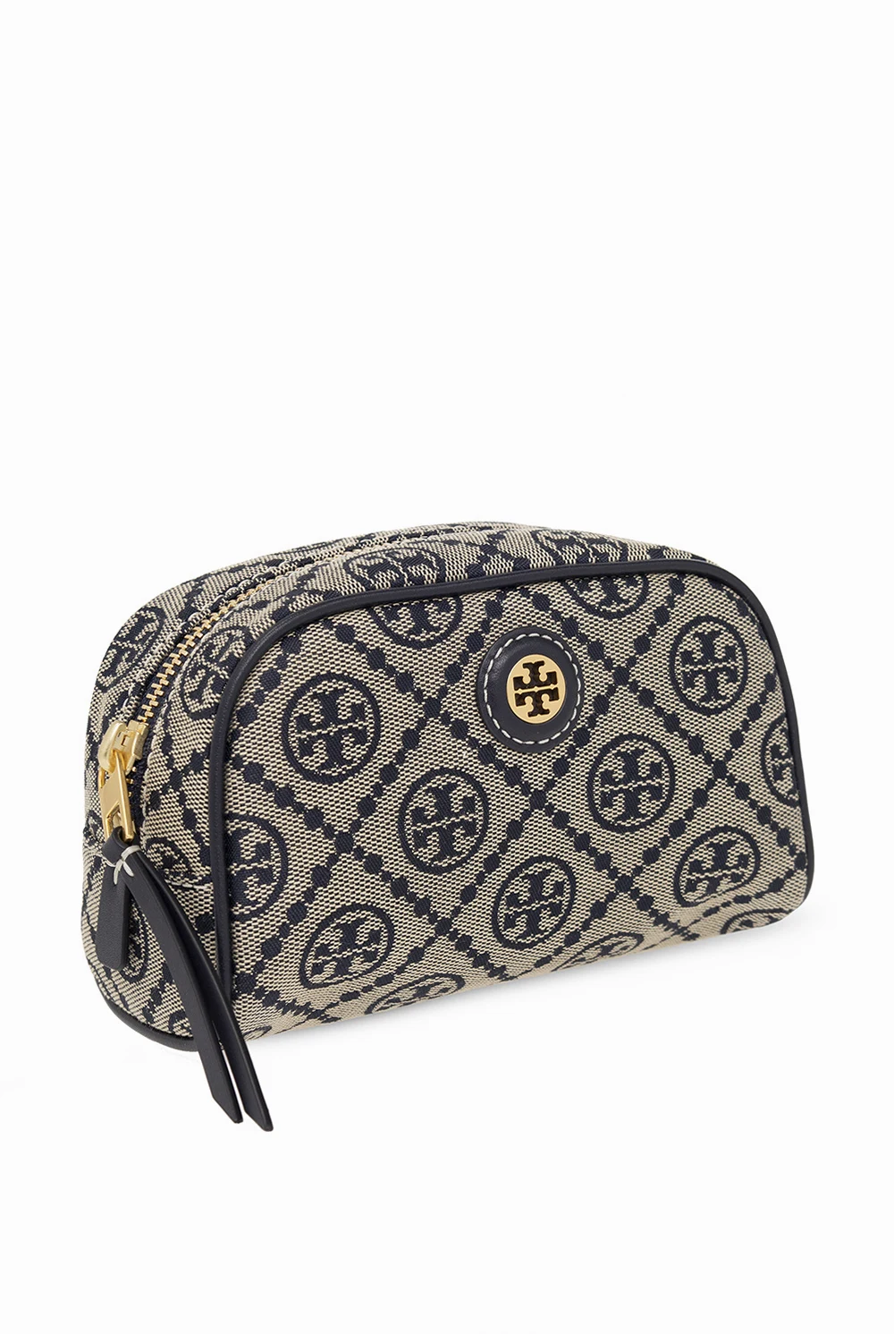 Beige and navy wash bag from Tory Burch. Made of canvas with a jacquard T Monogram pattern inspired by traditional Pennsylvania Dutch quilting, this model features a zip fastening, patch with a metal Double T logo appliqué, one internal compartment and gold-tone metal hardware.