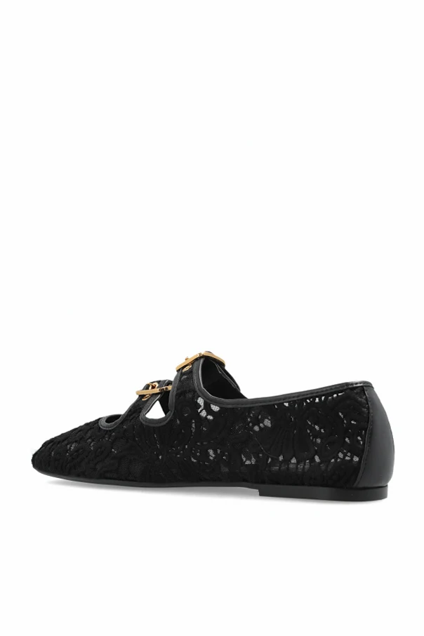 Der Schuhschaft ist aus schwarzer, halbtransparenter Spitze mit floralem Muster gefertigt und wird durch Samtpaspeln sowie Lederdetails veredelt. Zwei Riemen über dem Spann, jeweils mit goldenen Schnallen abgeschlossen, betonen dezent den romantischen Charakter und sorgen für eine perfekte Passform.