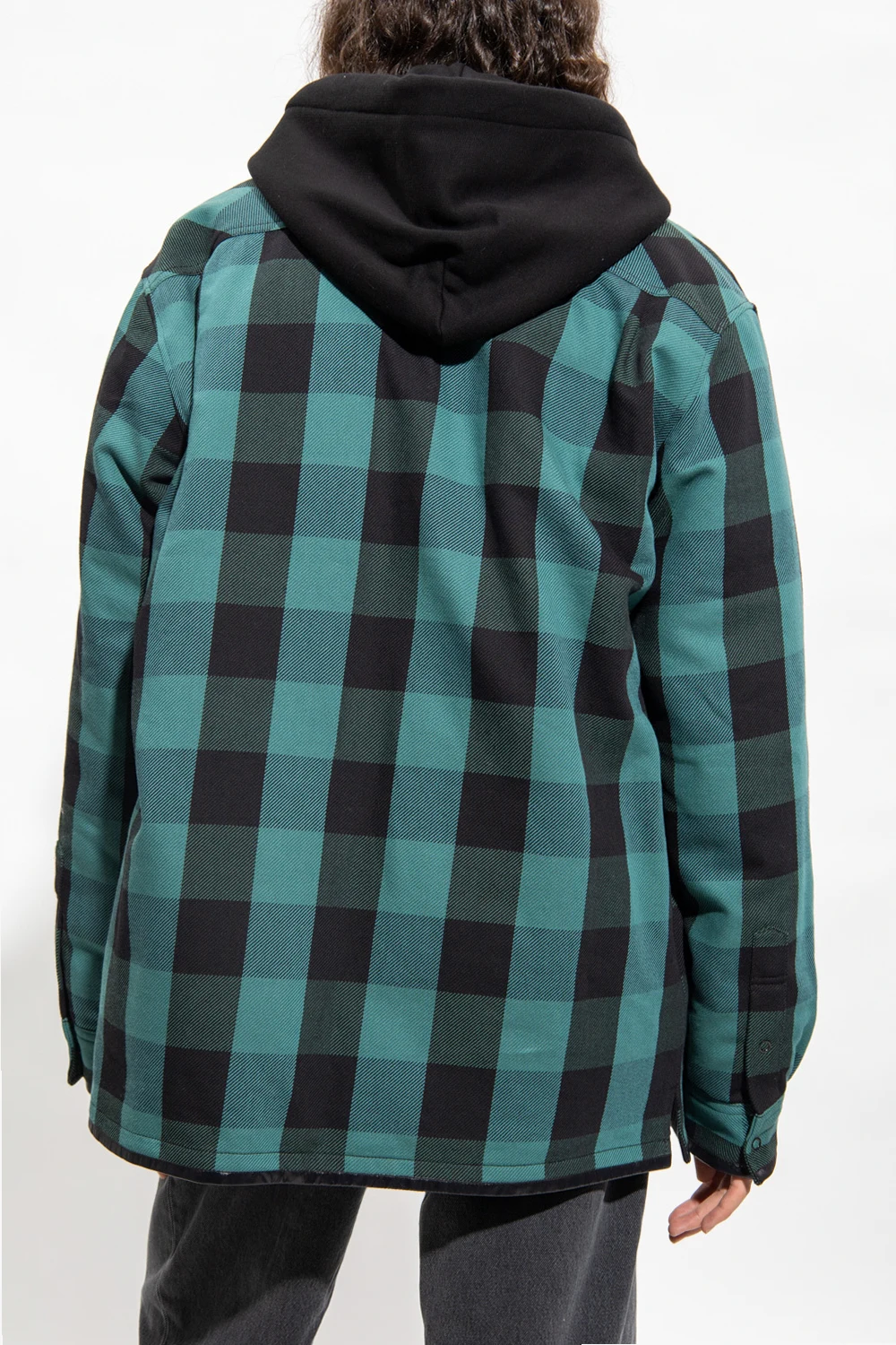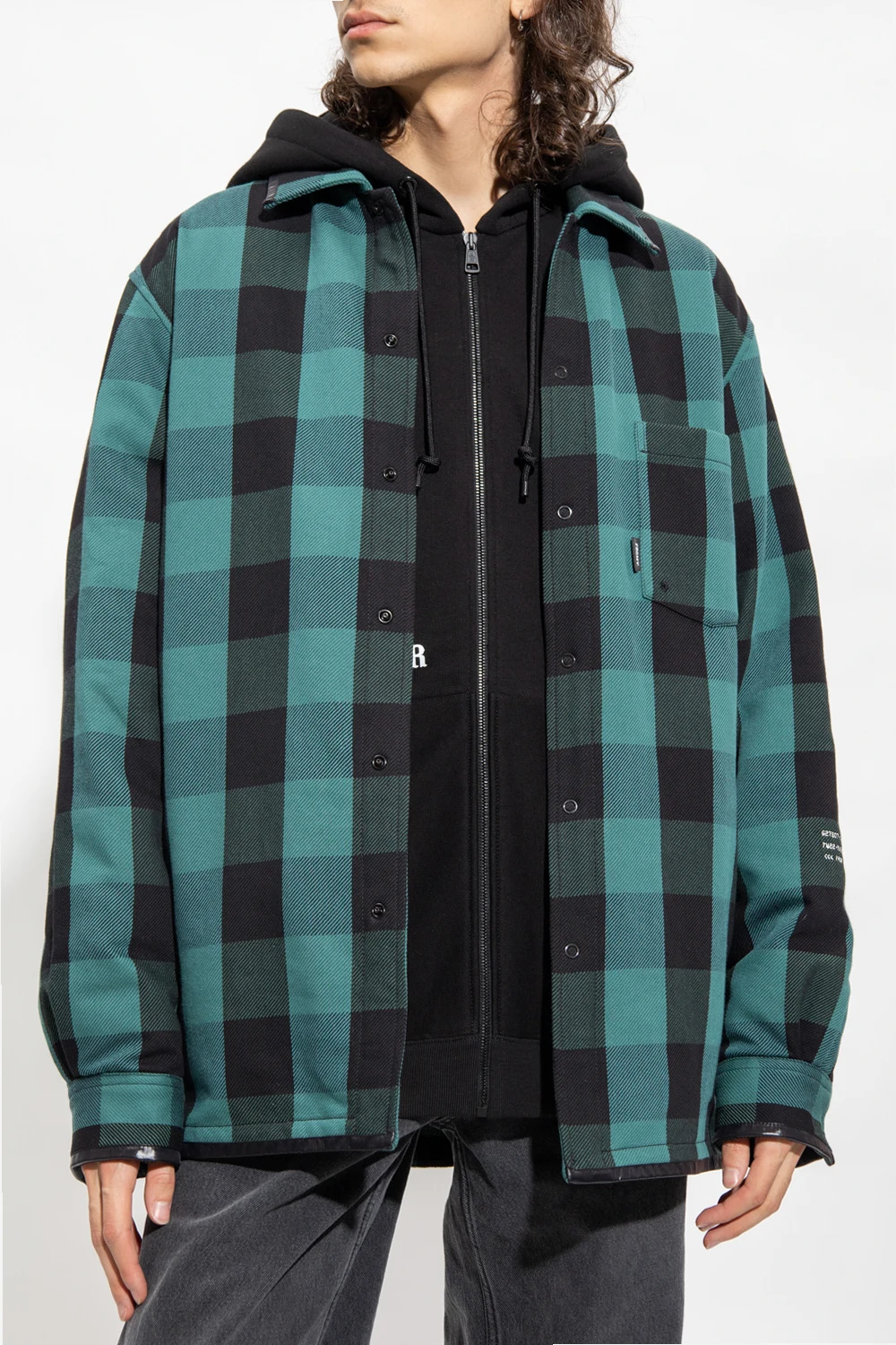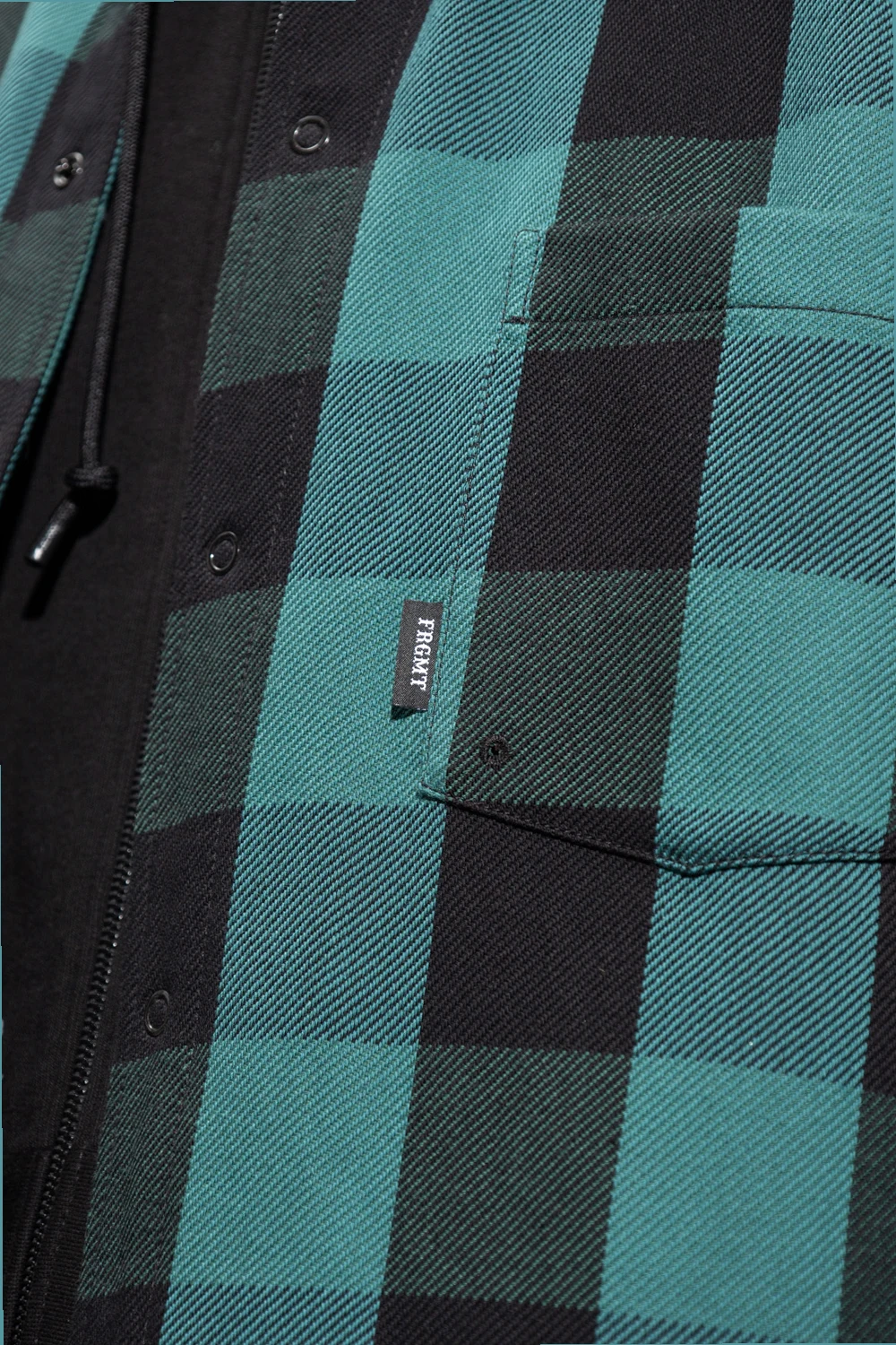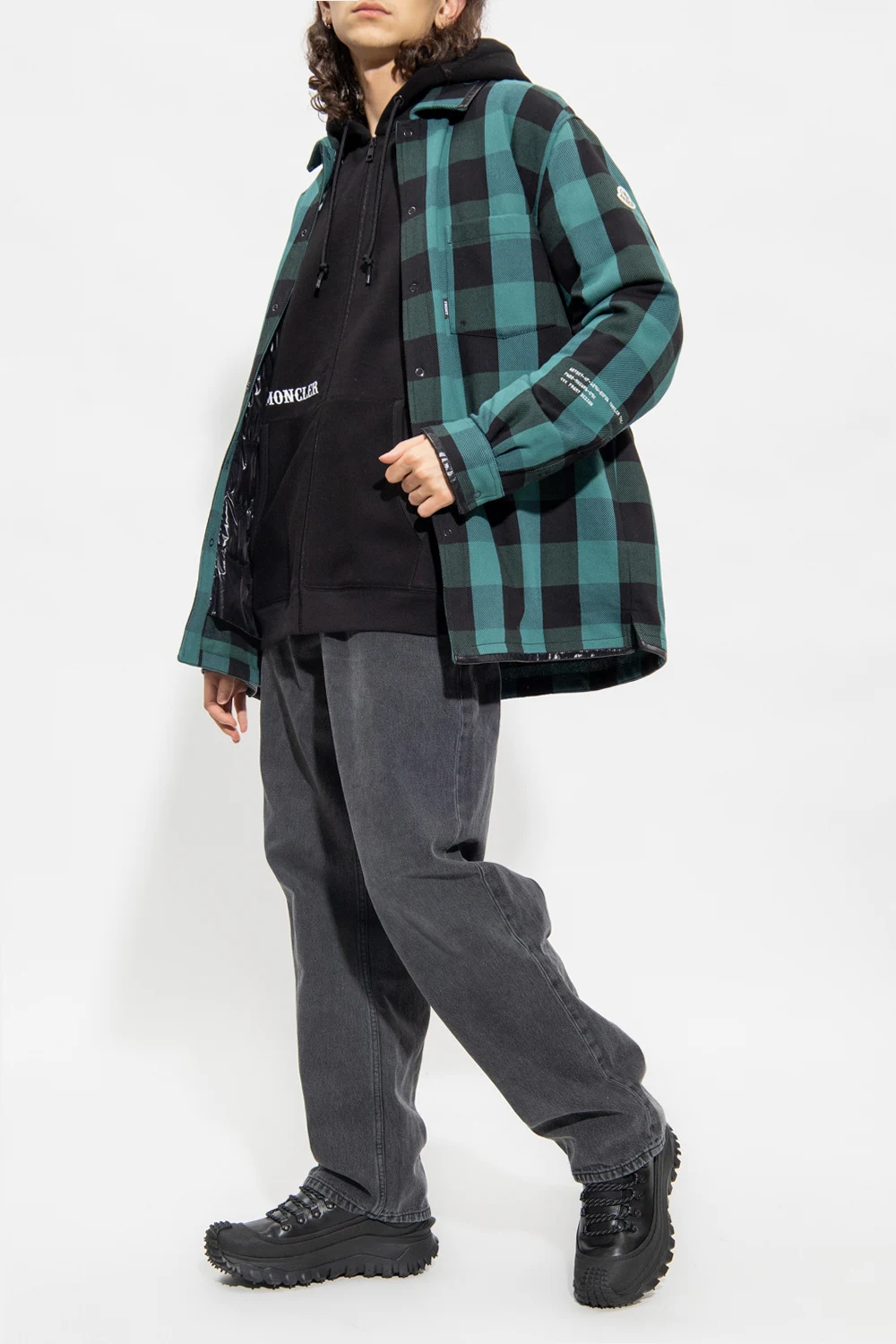 Green and black ‘Simon’ overshirt from Moncler Genius, the '7 Moncler Fragment Hiroshi Fujiwara' collection. Crafted from cotton, this style features a quilted lining padded with natural down and feathers with the DIST certificate. Showcasing a check pattern, it is complete with snap closures on the front, a slip chest pocket, a Feltrino patch and white lettering embroidery on the shoulder and long sleeves with snap-fastened cuffs.