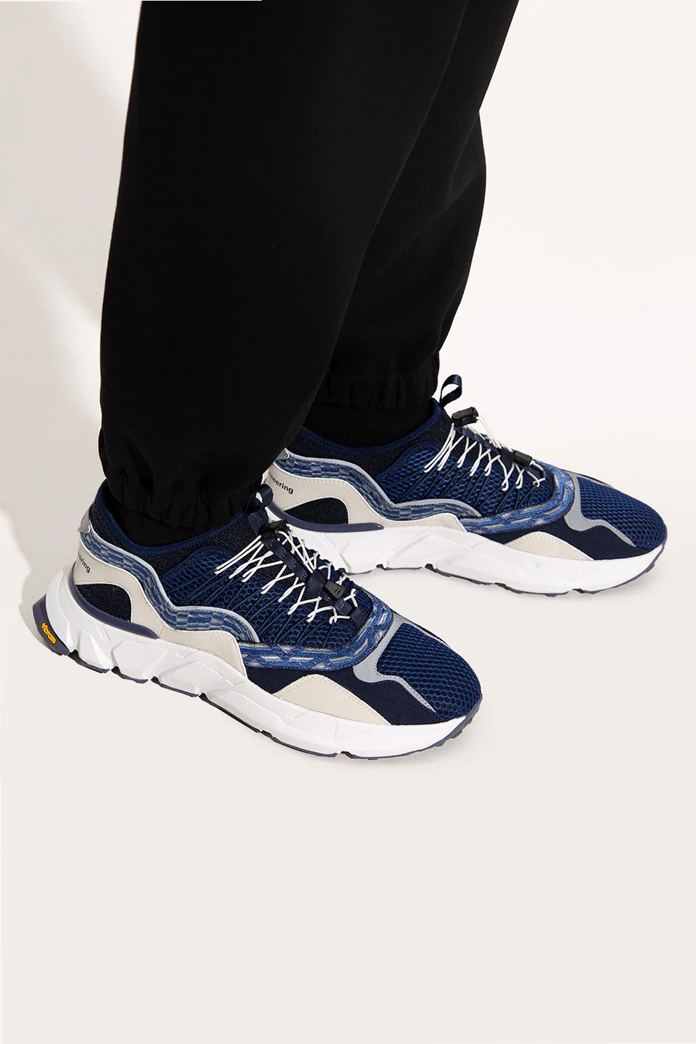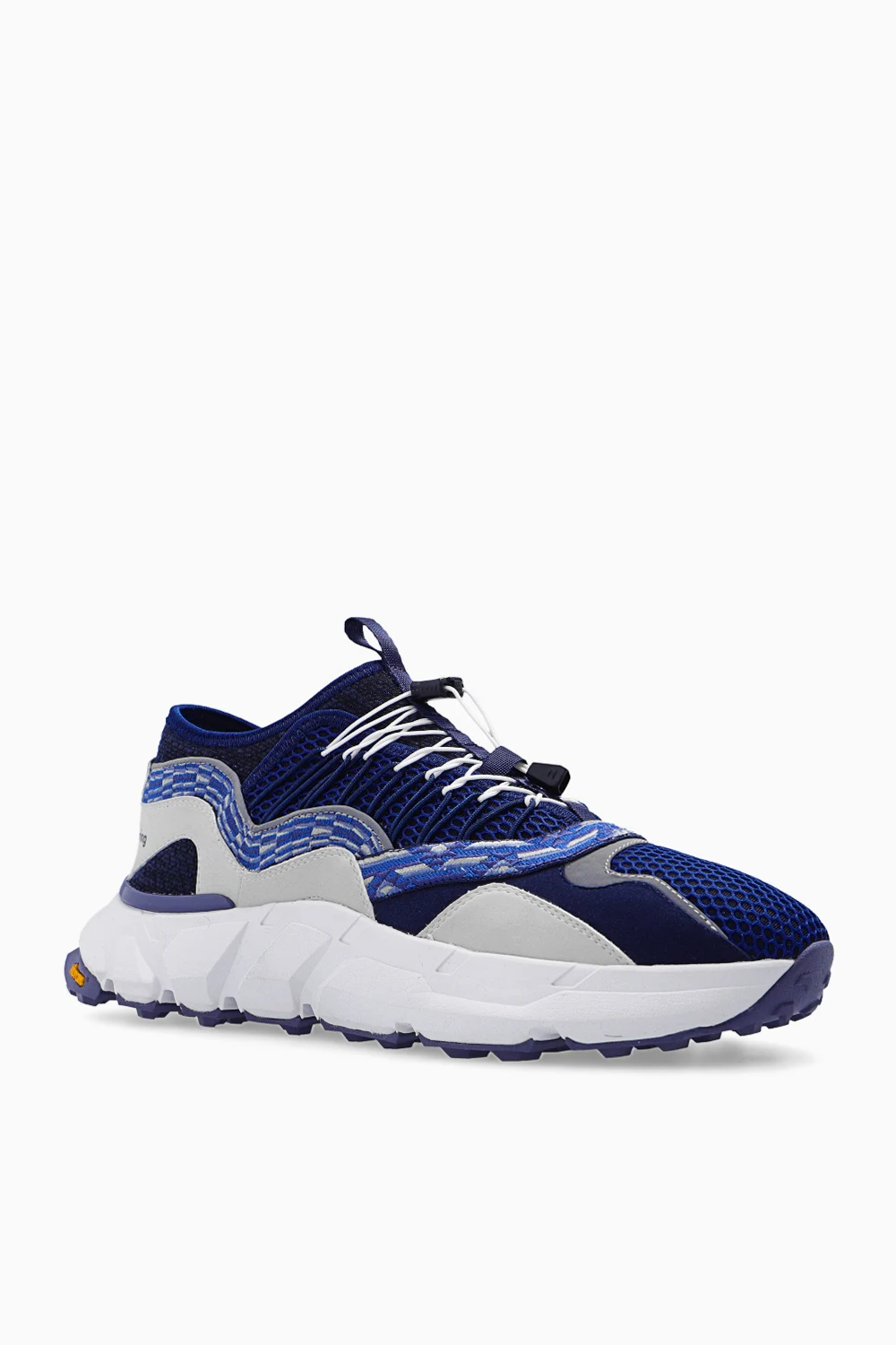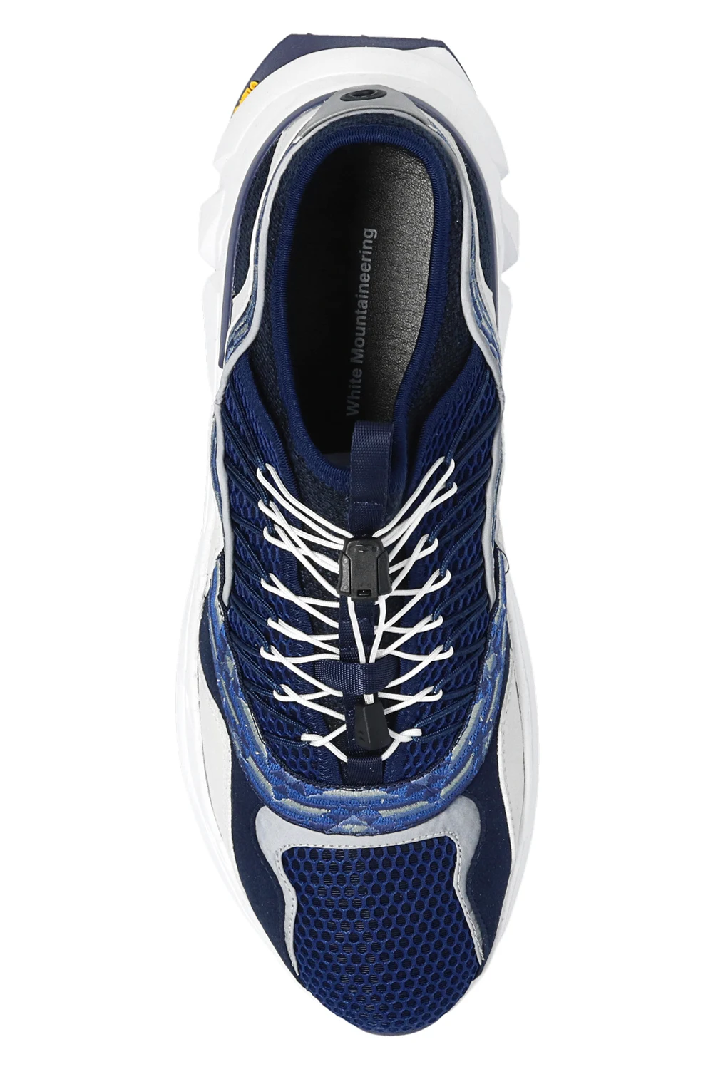 Navy blue and white sneakers from White Mountaineering. The upper is made of durable mesh and synthetic material which ensure comfort during each step and exceptional endurance to withstand even the most intense hiking trips. Equipped with a lace-up system that allows quick one-touch adjustment, this model features logo detailing, reflective details and a blue and white Vibram® rubber sole, characterised by excellent grip, durability and abrasion-resistant properties.