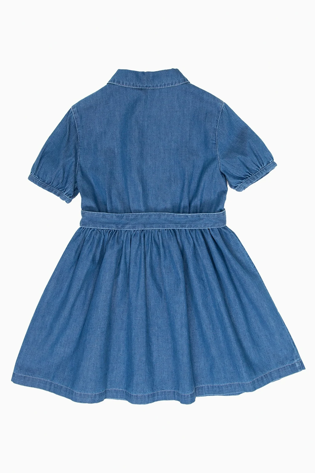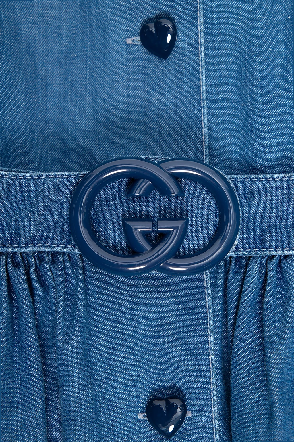 Navy blue denim dress from Gucci Kids. Falling down with a flared skirt, this cotton-crafted style features button closures and short sleeves.