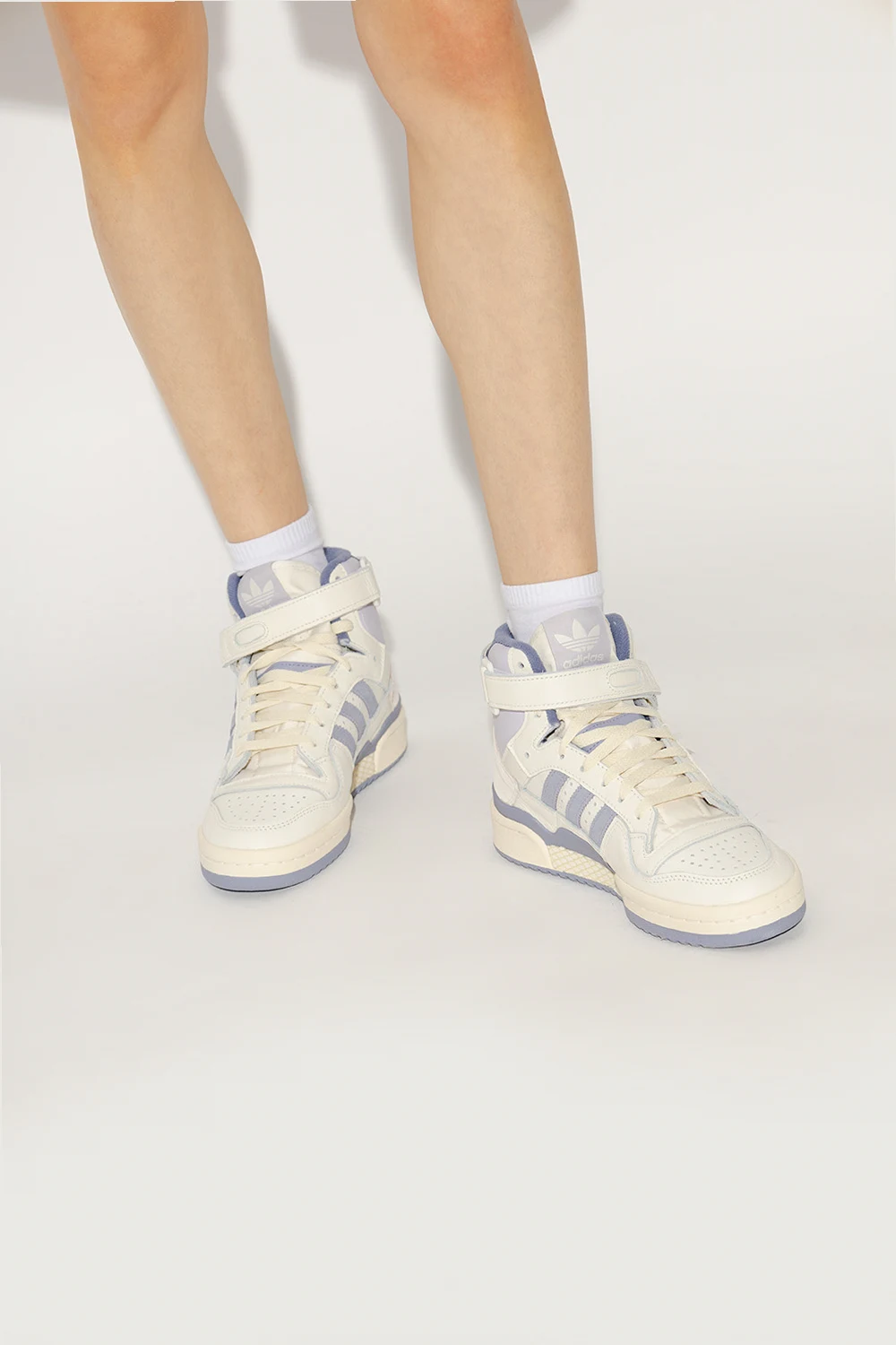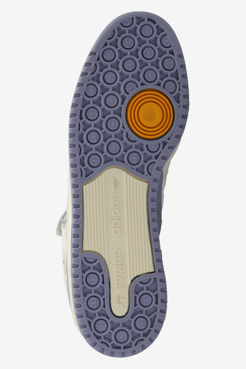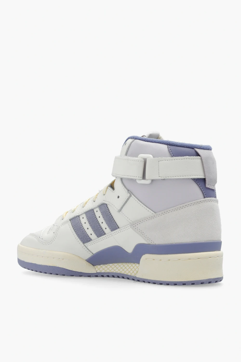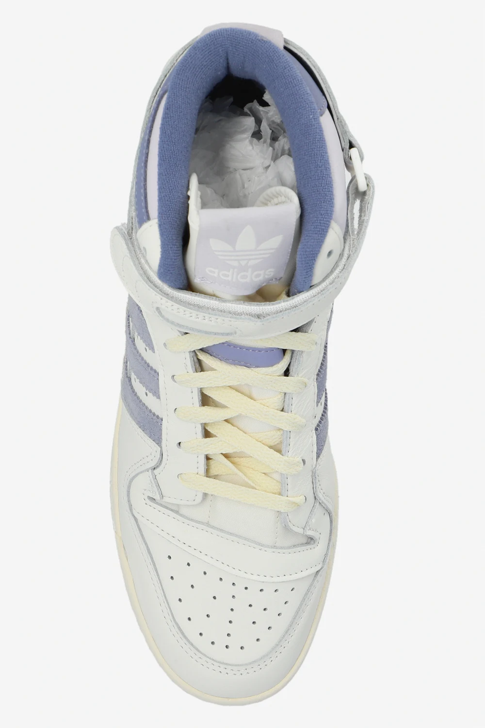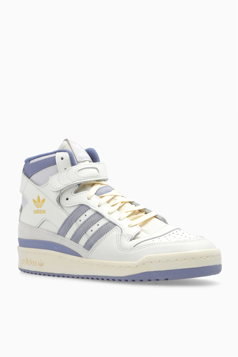 White, purple and cream ‘FORUM 84 HI’ sneakers from ADIDAS Originals. Crafted from leather and fabric, this lace-up model sits on a cream and purple rubber sole and features a high-top silhouette, a velcro closure and the brand's signature three stripes.