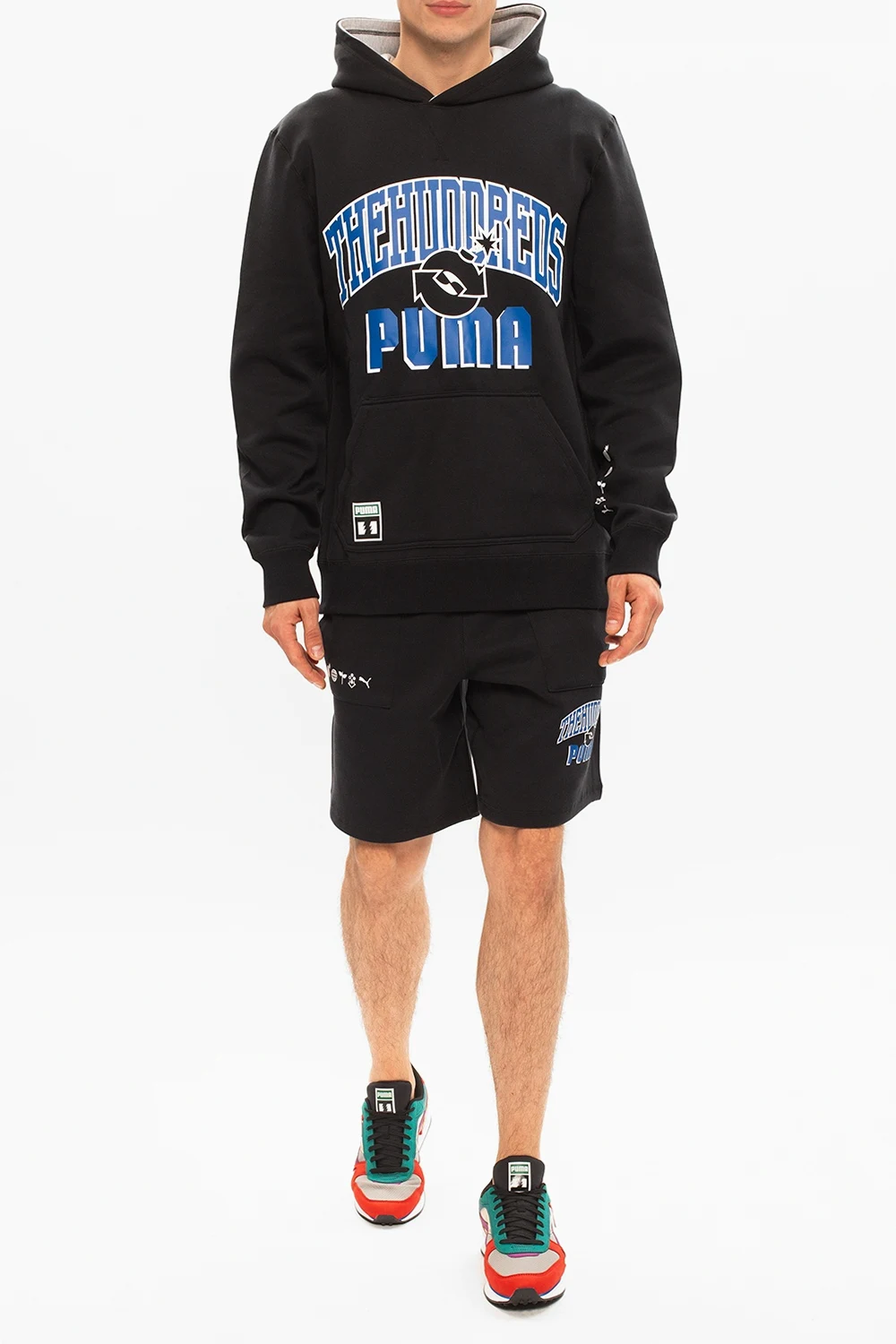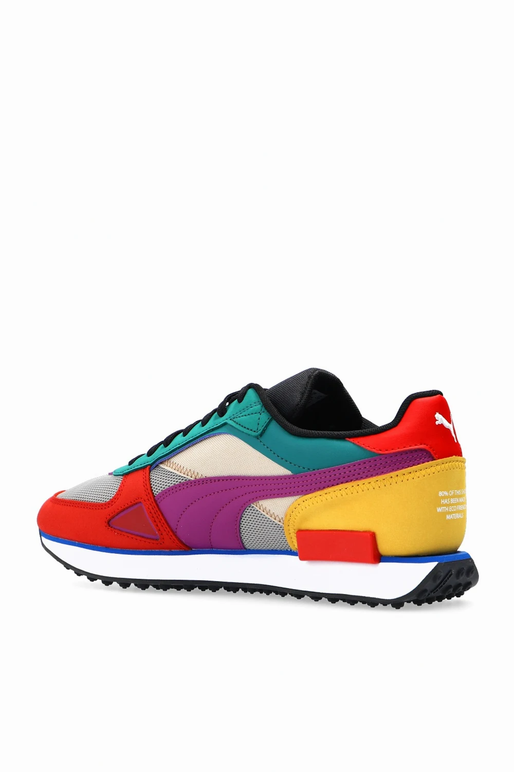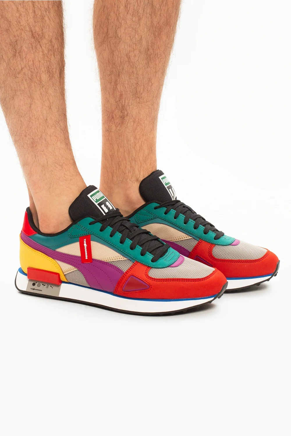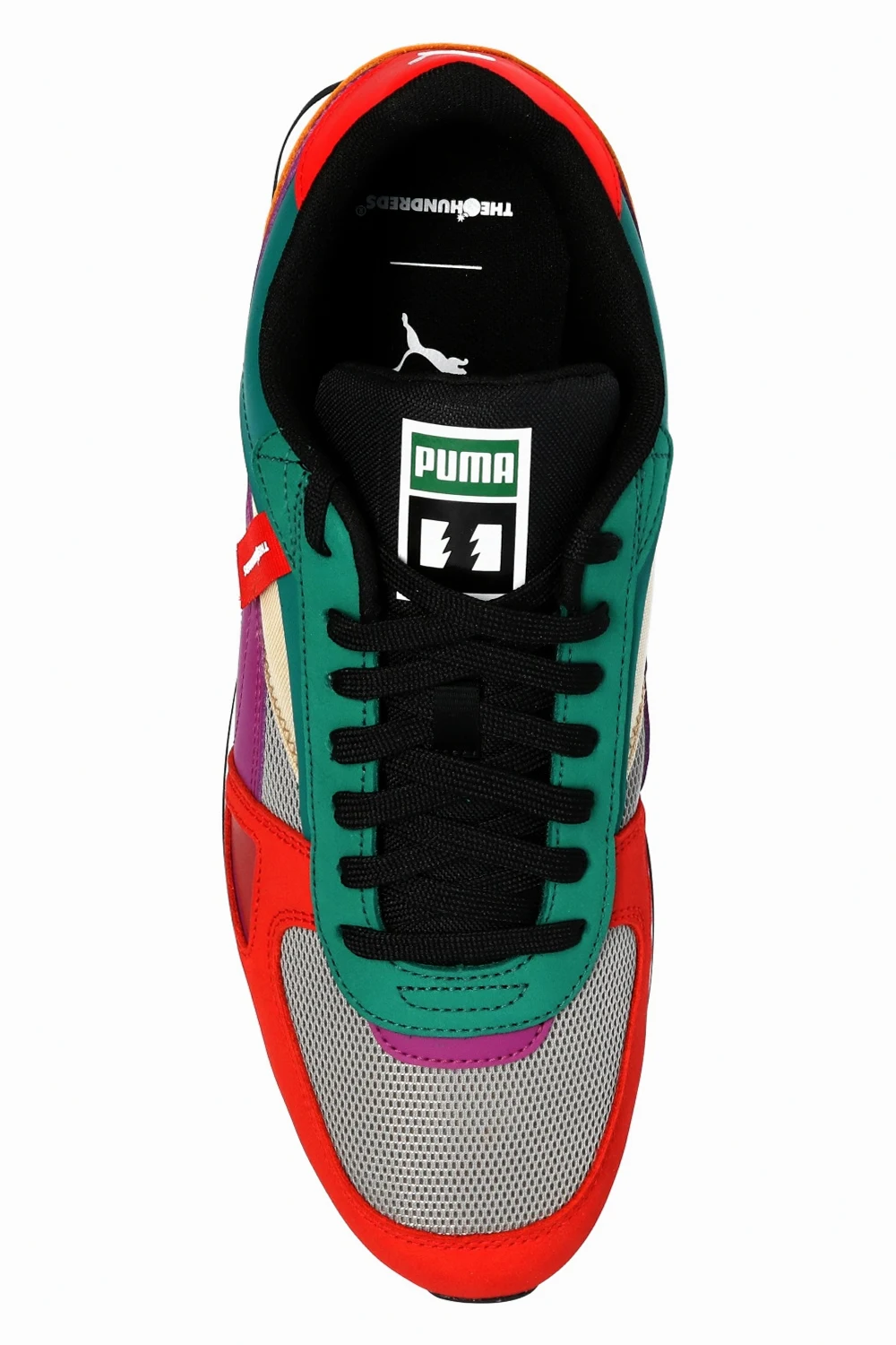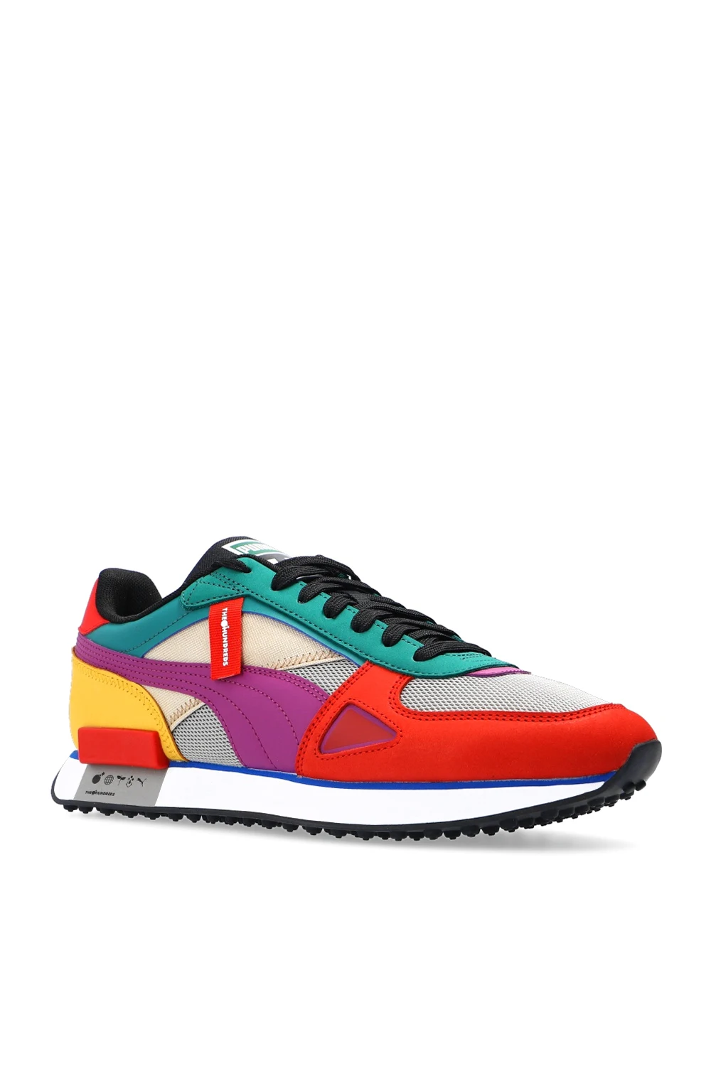 Multicolored ‘Future Rider’ lace-up sneakers from Puma x The Hundreds. Made from 80% eco-friendly materials, this model features a logo patch, an additional pair of laces in white and a rubber sole in white and black. The labels continue their mission of “people over product” and use more sustainable materials like recycled rubber and polyester, organic cotton and chrome-free leather to elevate streetwear staples. Each piece seeks to increase consciousness about how we dress and what we purchase.