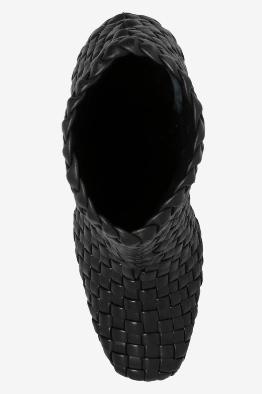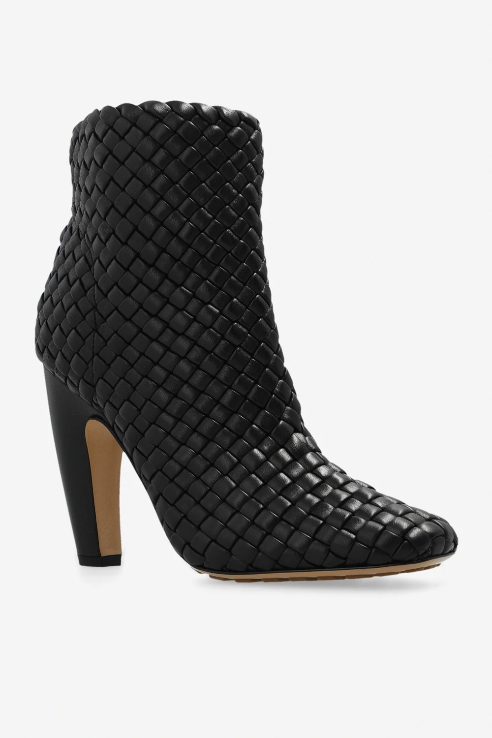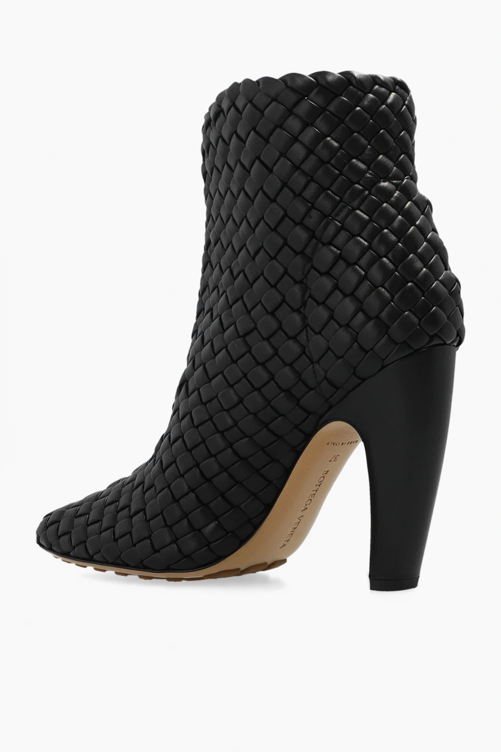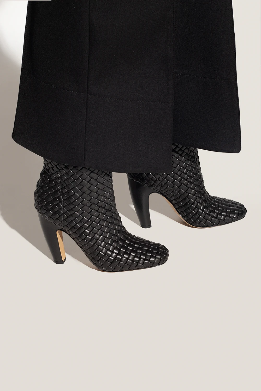 Black ‘Canalazzo’ heeled ankle boots from Bottega Veneta. Made of lamb leather with the brand’s signature Intreccio weave, this model rests on a light beige rubber-injected leather sole providing an increased grip.