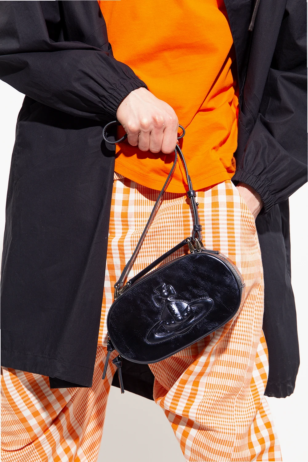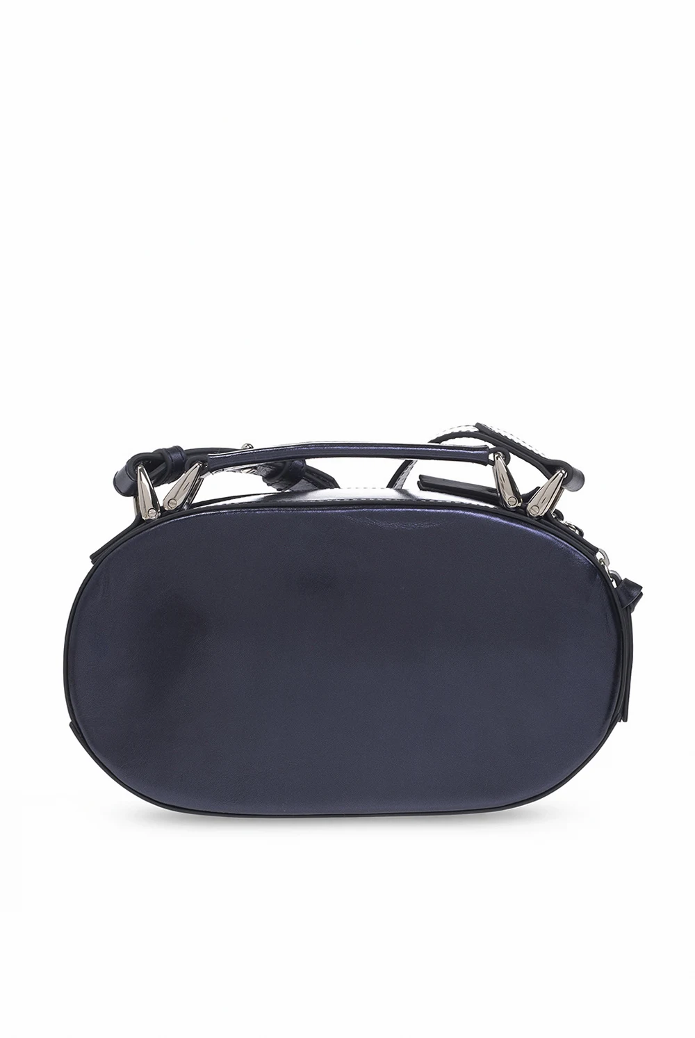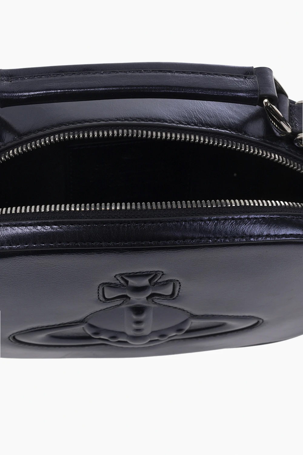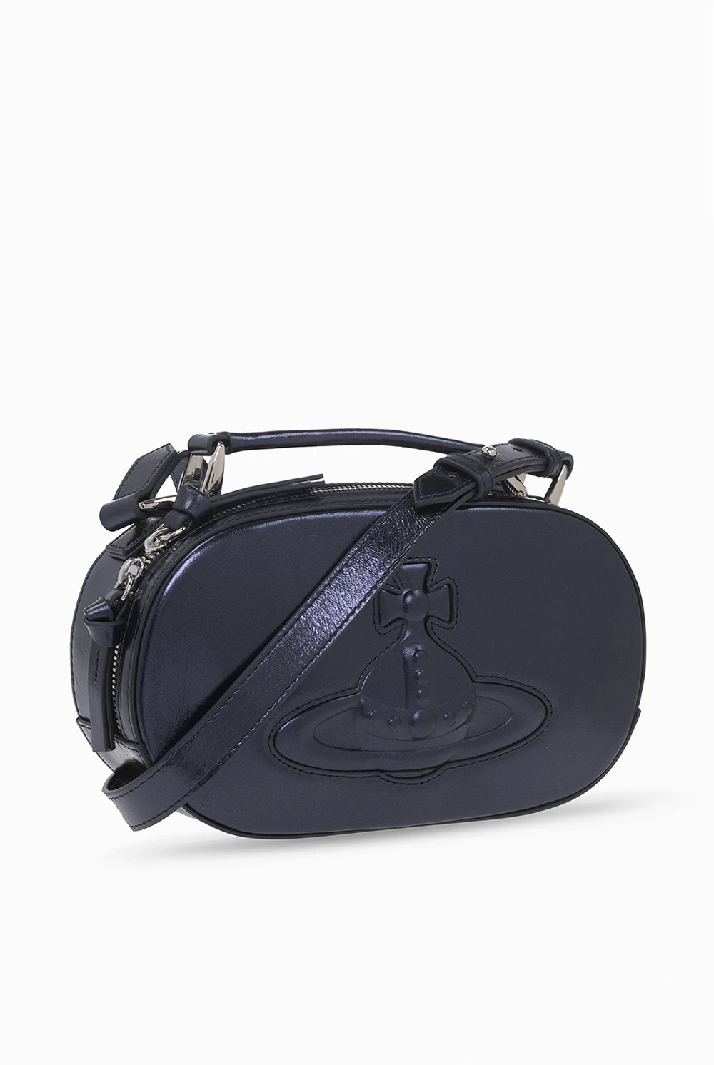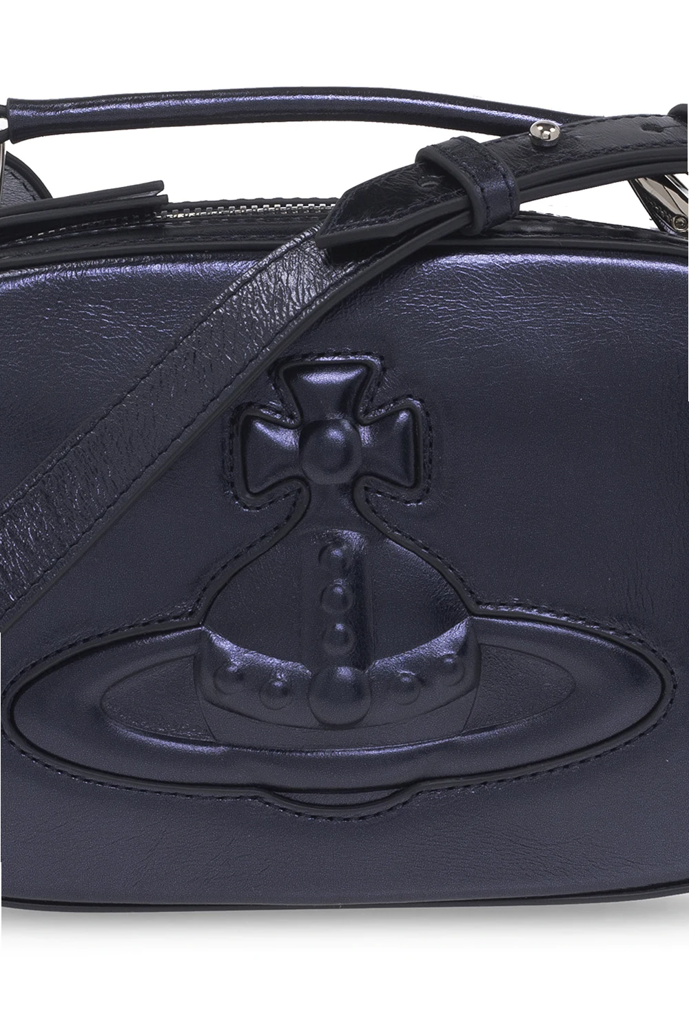 Dark purple ‘Kathy’ shoulder bag from Vivienne Westwood. Crafted from cow leather with a metallic sheen, this design features a two-way zip fastening, a tactile logo on the front, a half-round handle, an adjustable shoulder strap, silver-tone metal hardware and one internal compartment with a slip pocket.