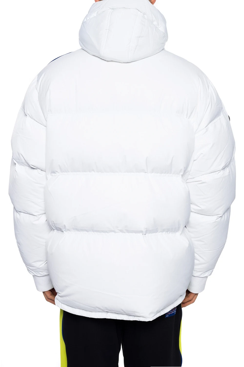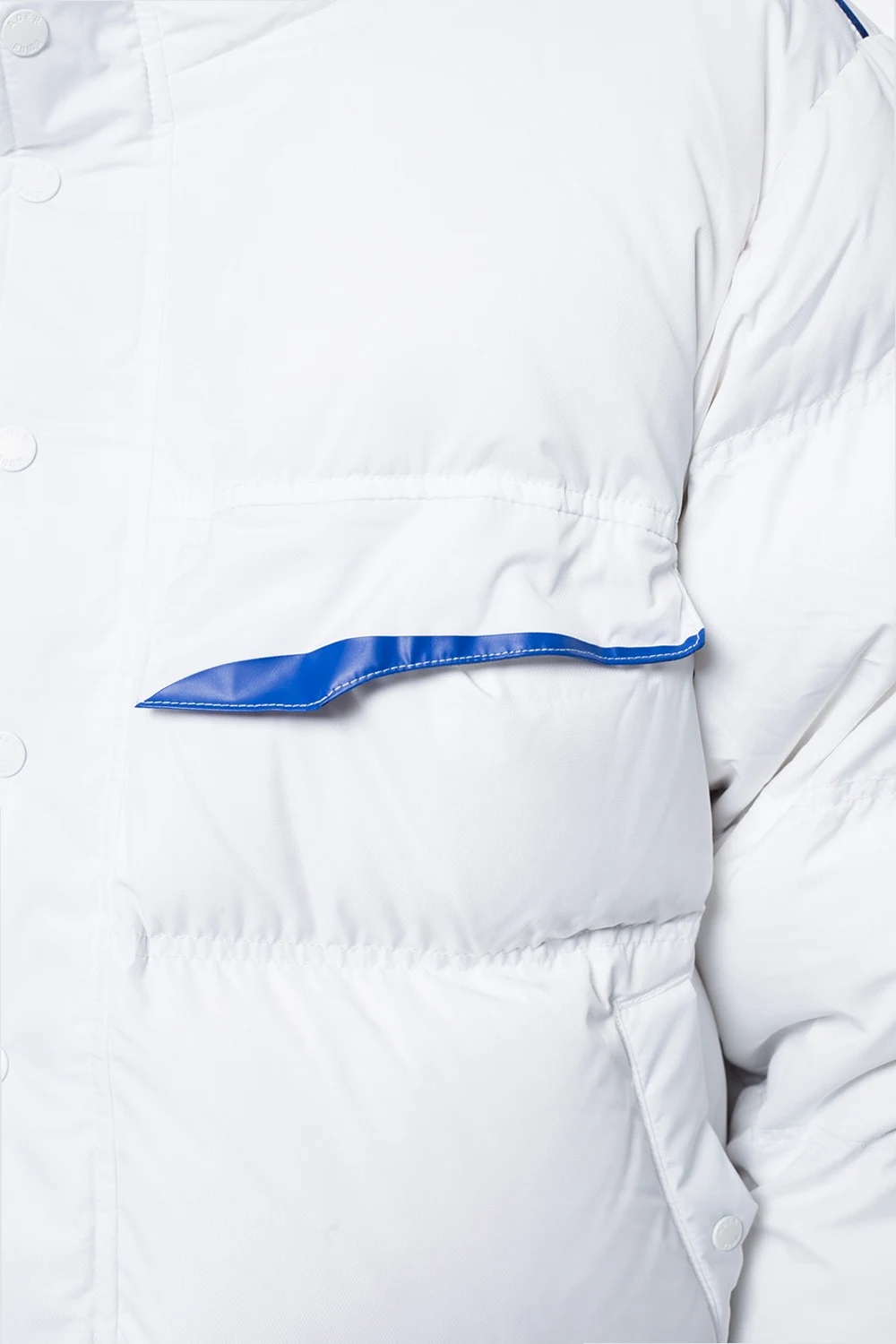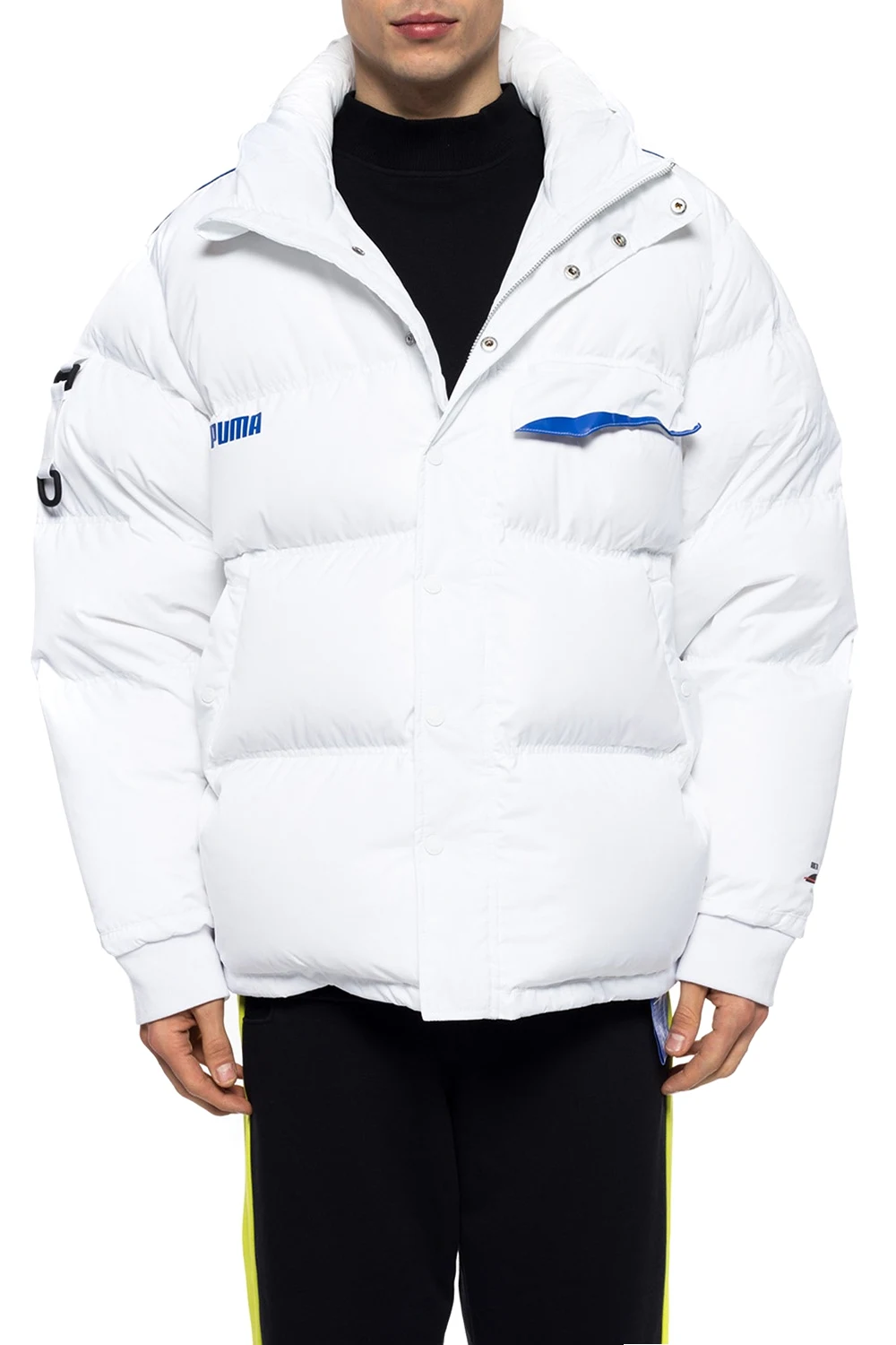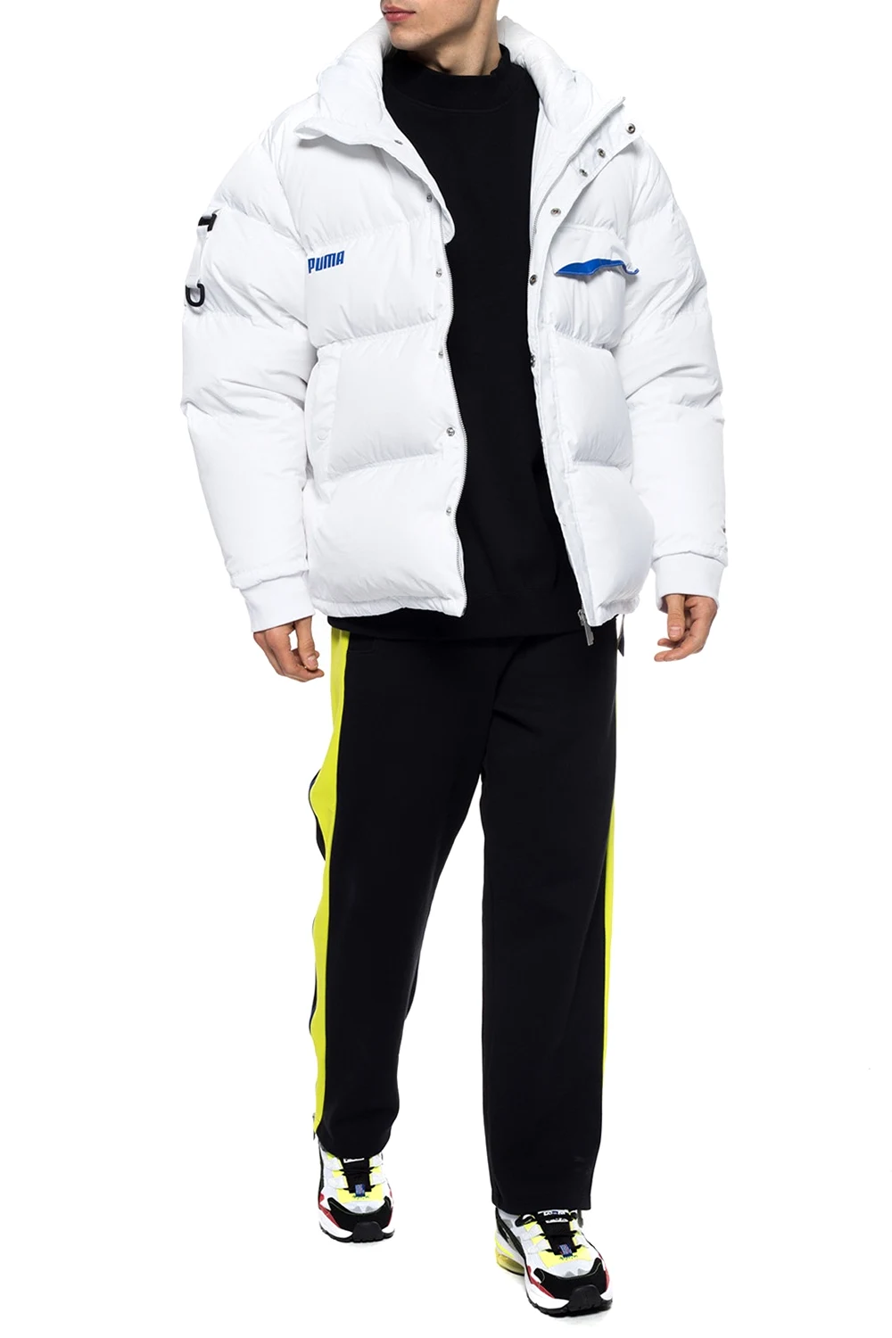 White quilted hooded jacket from Puma x Ader Error. Fastened via zip and snap-buttons. Embellished with printed blue motif with logo. Features drawstring hem, long sleeves with elasticated cuffs, round handles sewn on the back as well as 2 snap-fastened pockets and 1 velcro-fastened pocket with flap on the front.