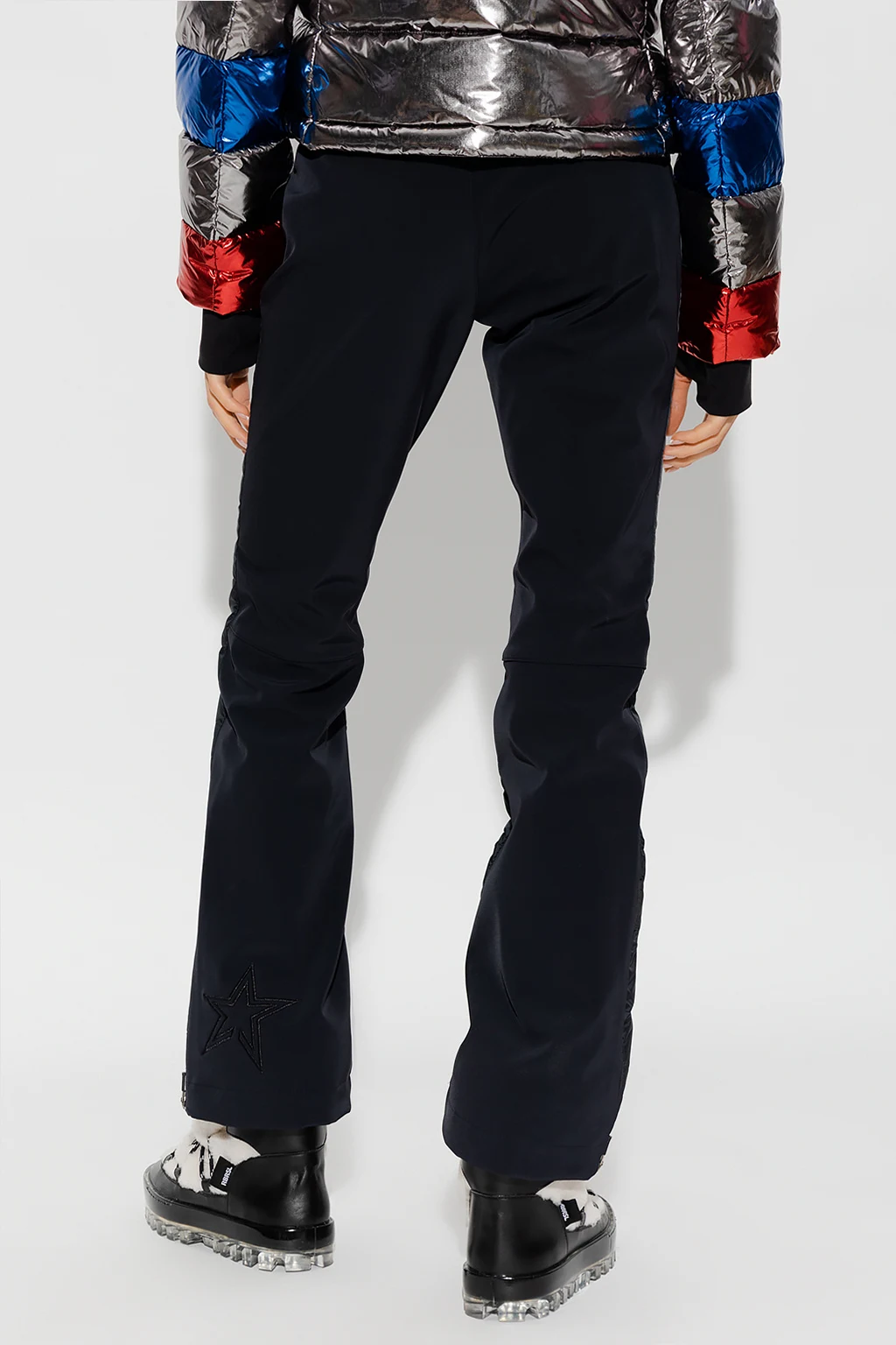 Black ‘Talia’ ski trousers from Perfect Moment. Fastened with a zip and snap button, this low rise design features a logo embroidery, quilted front padded with down, two front zip pockets, fleece lining and flared legs with zips.