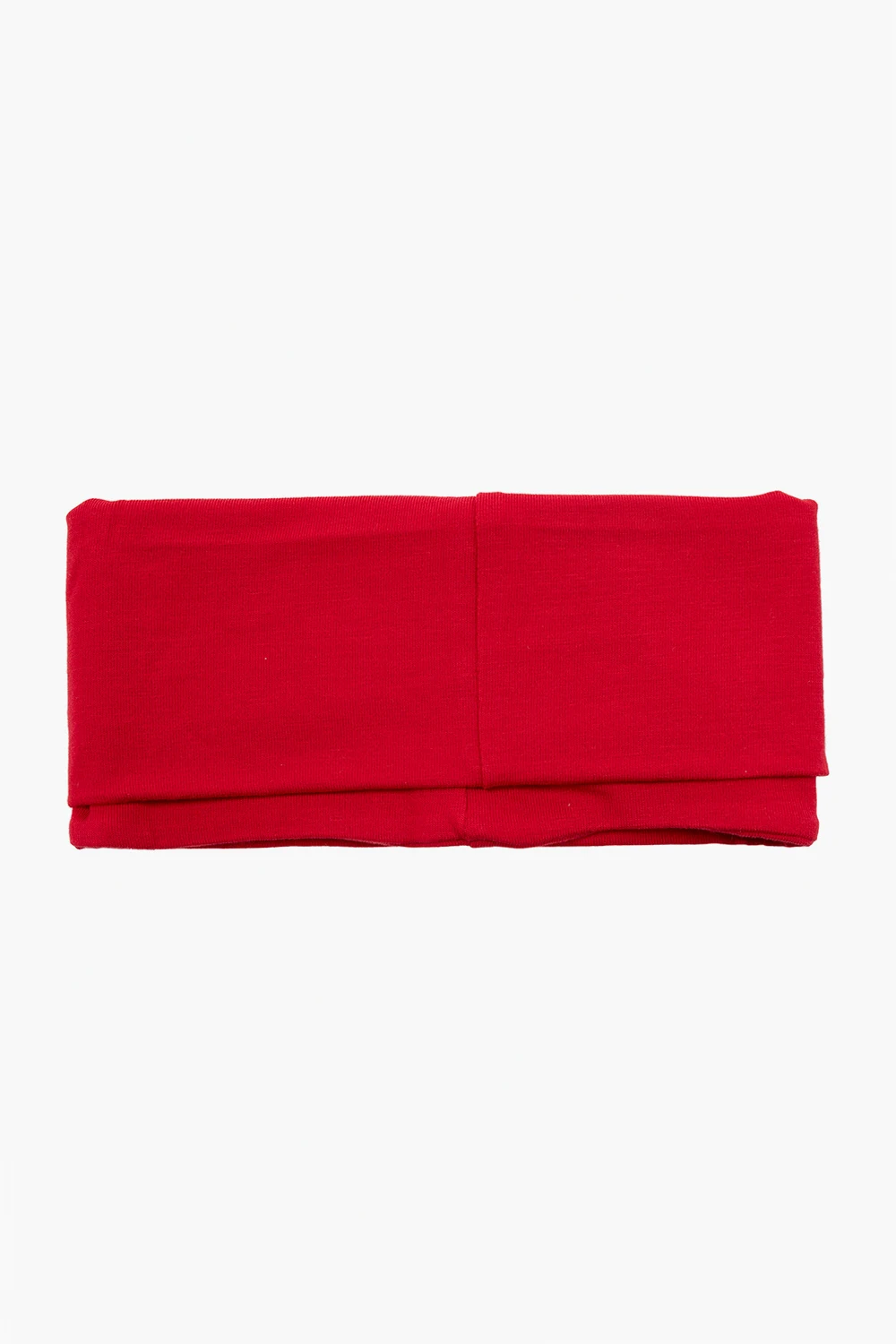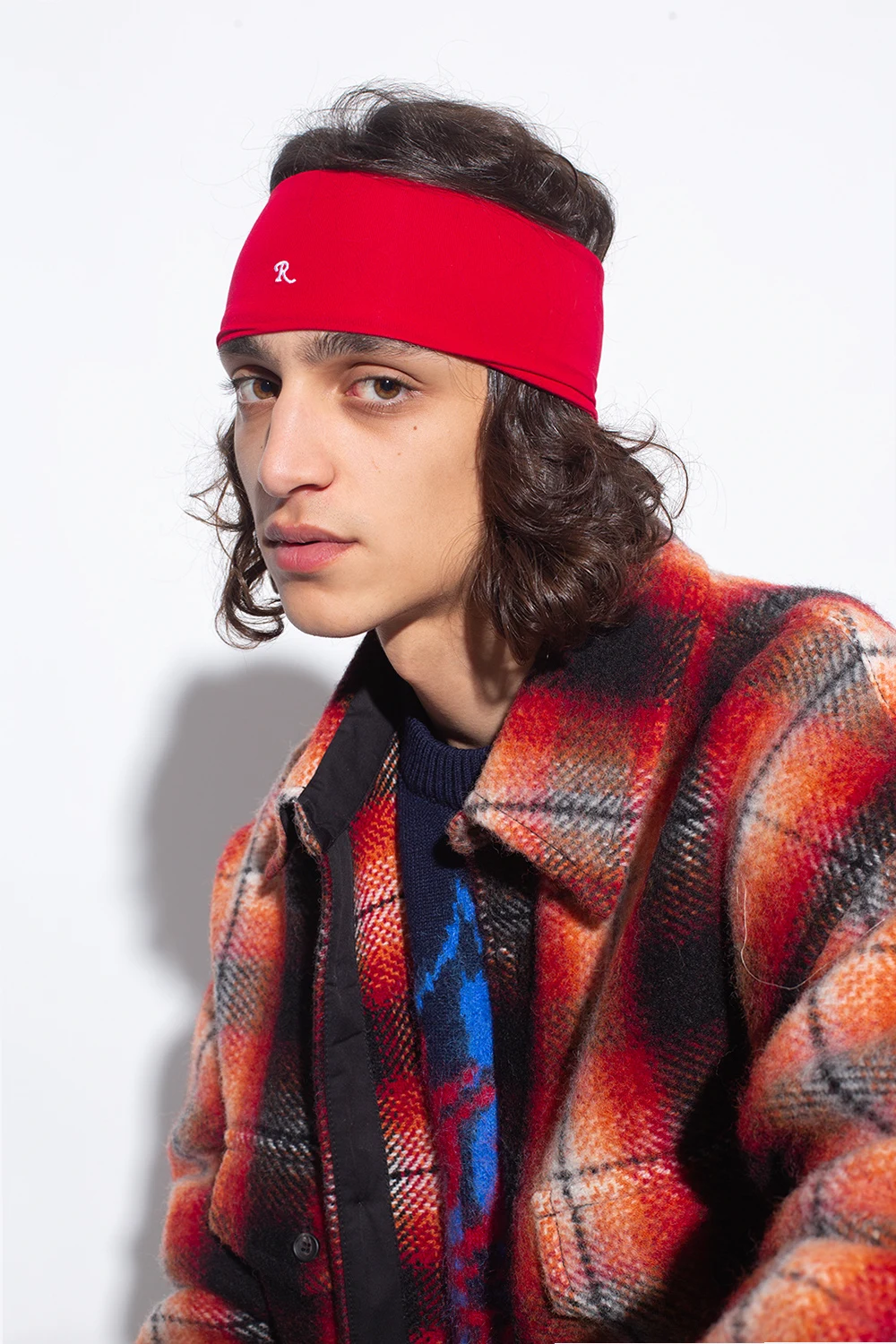 Red tube scarf with a white logo embroidery from Raf Simons.
