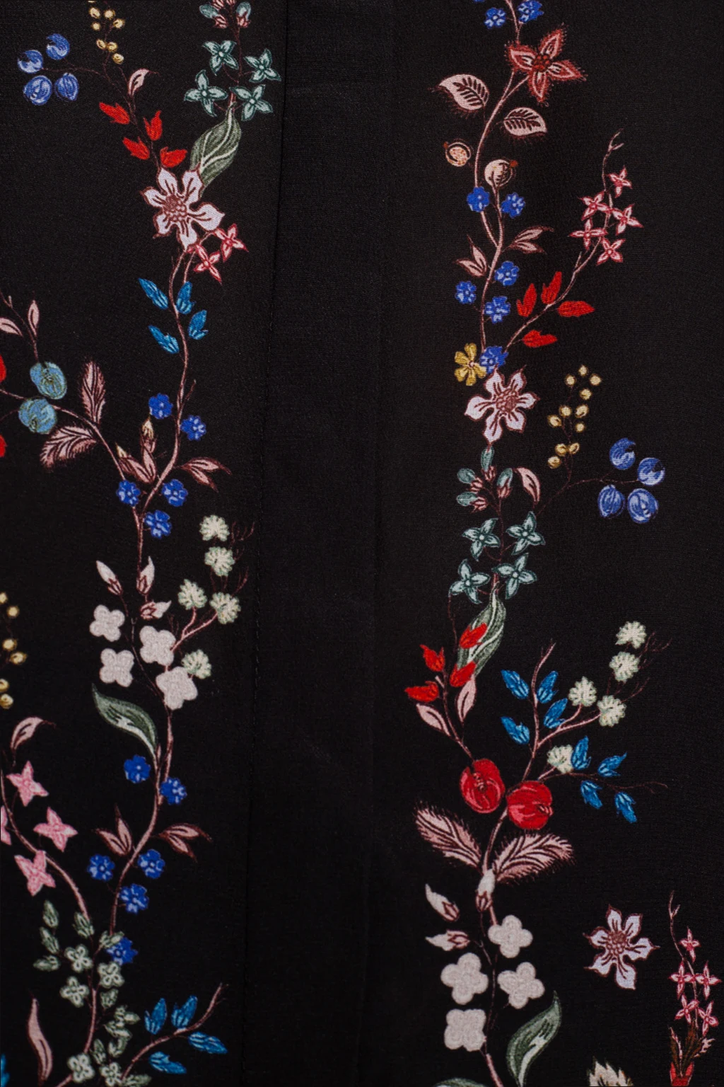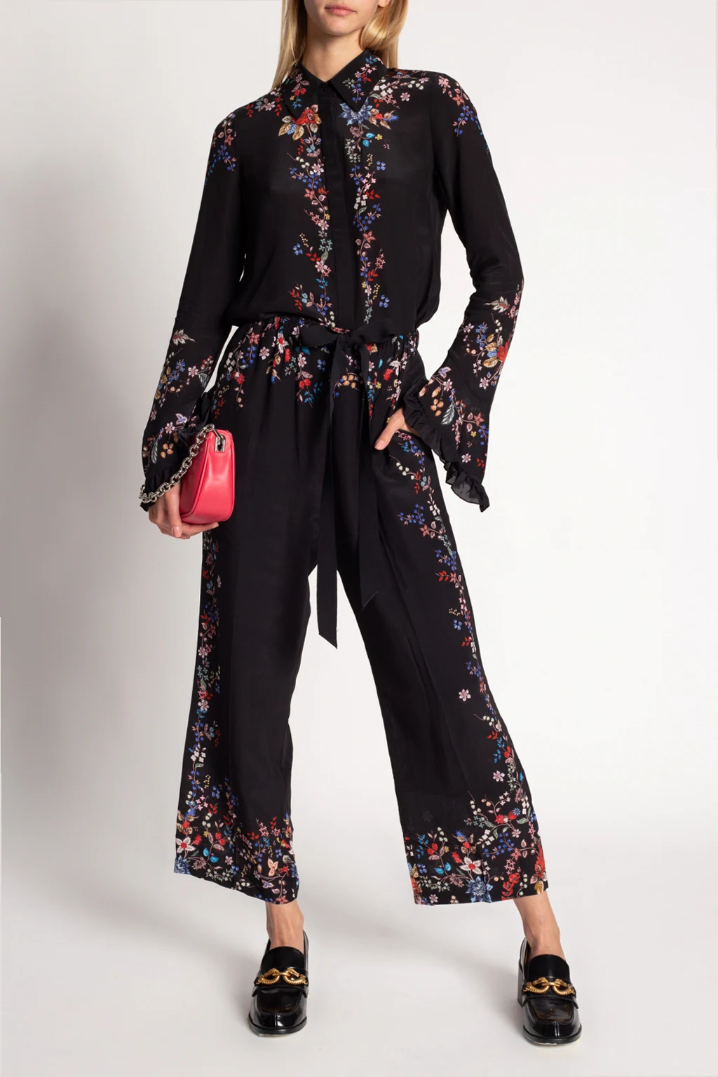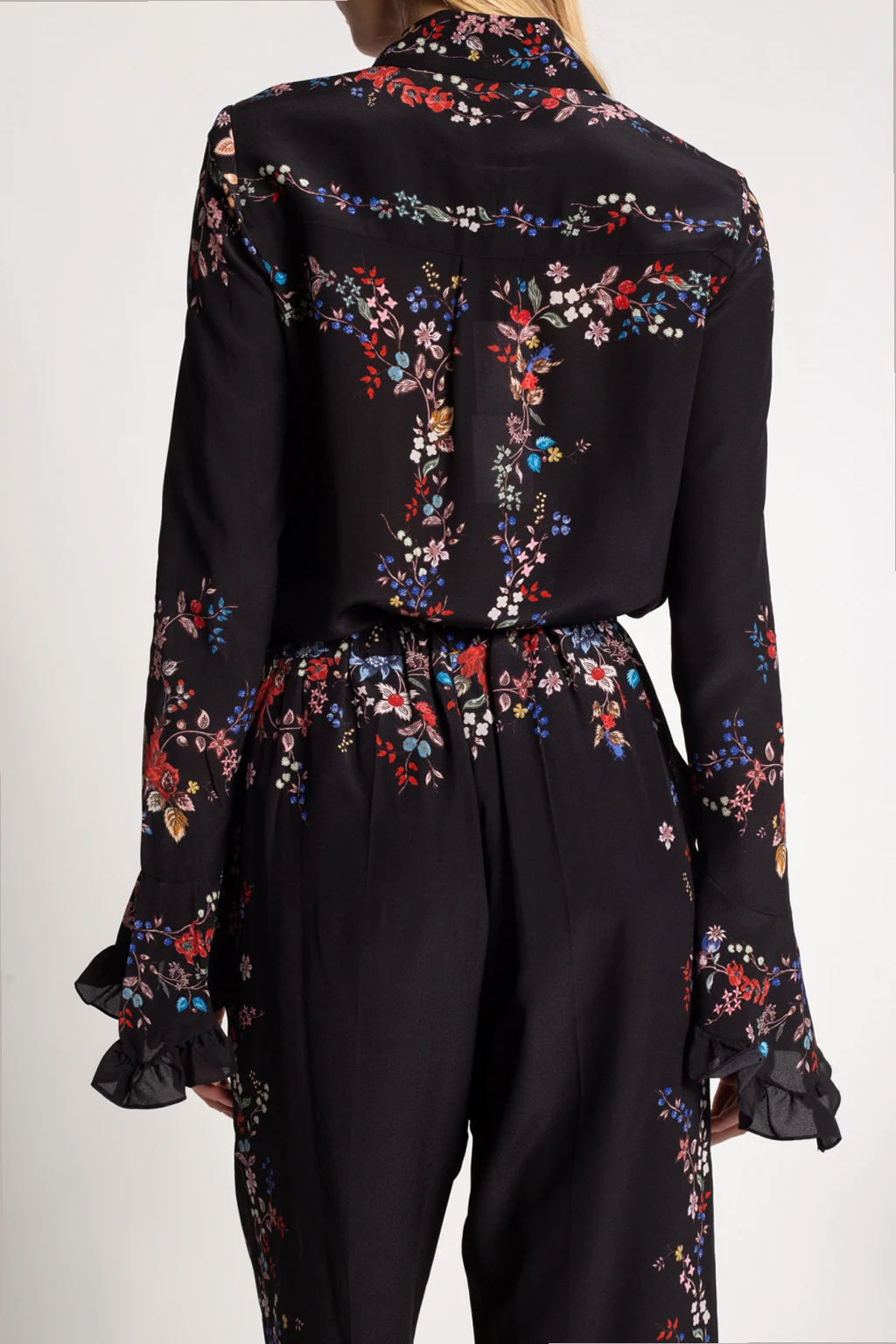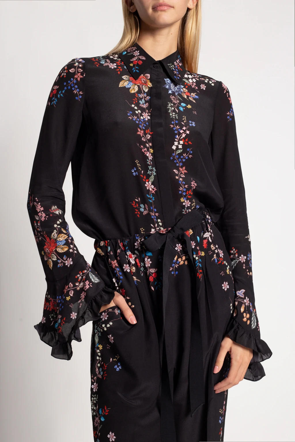 Black shirt from Erdem. Fastened with buttons, this garment is made from silk and enriched by a multicolored floral motif and long sleeves with decorative ruffles.