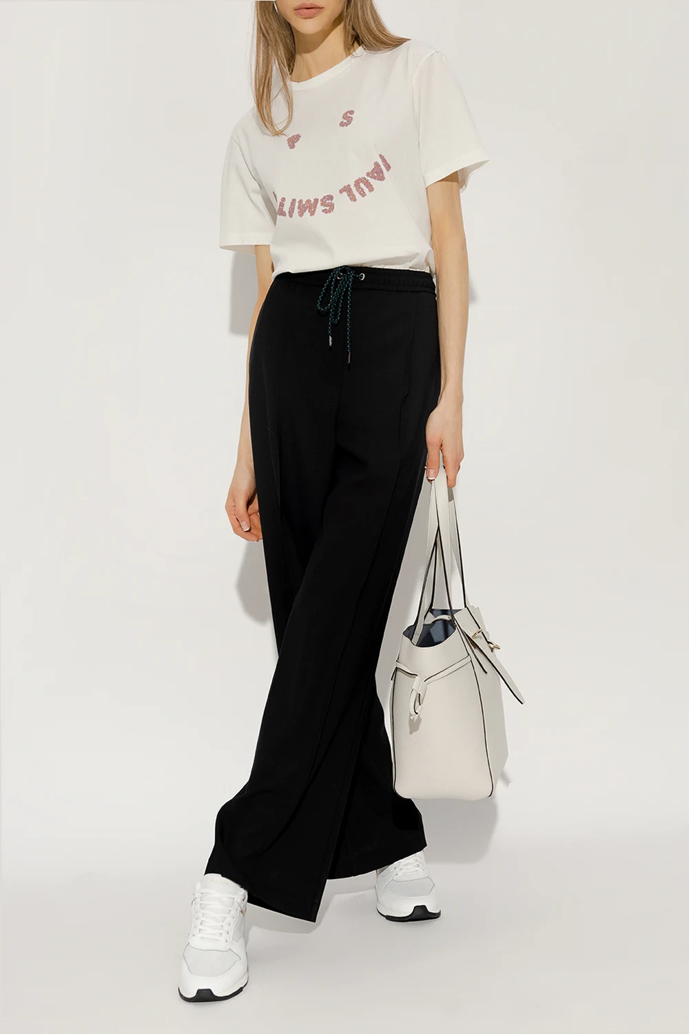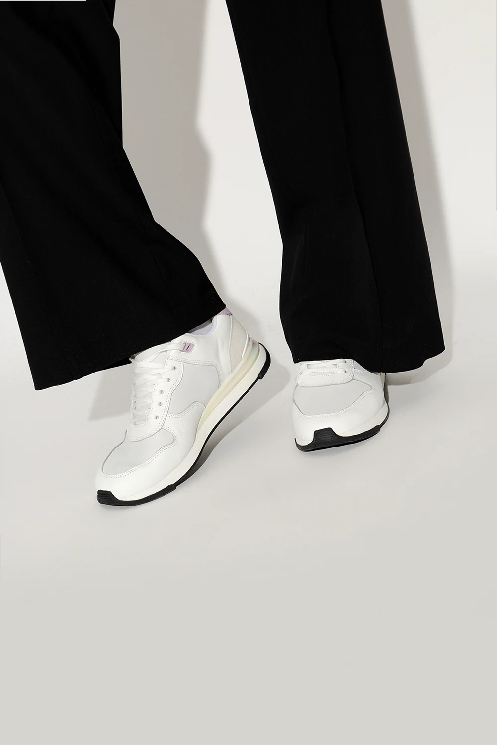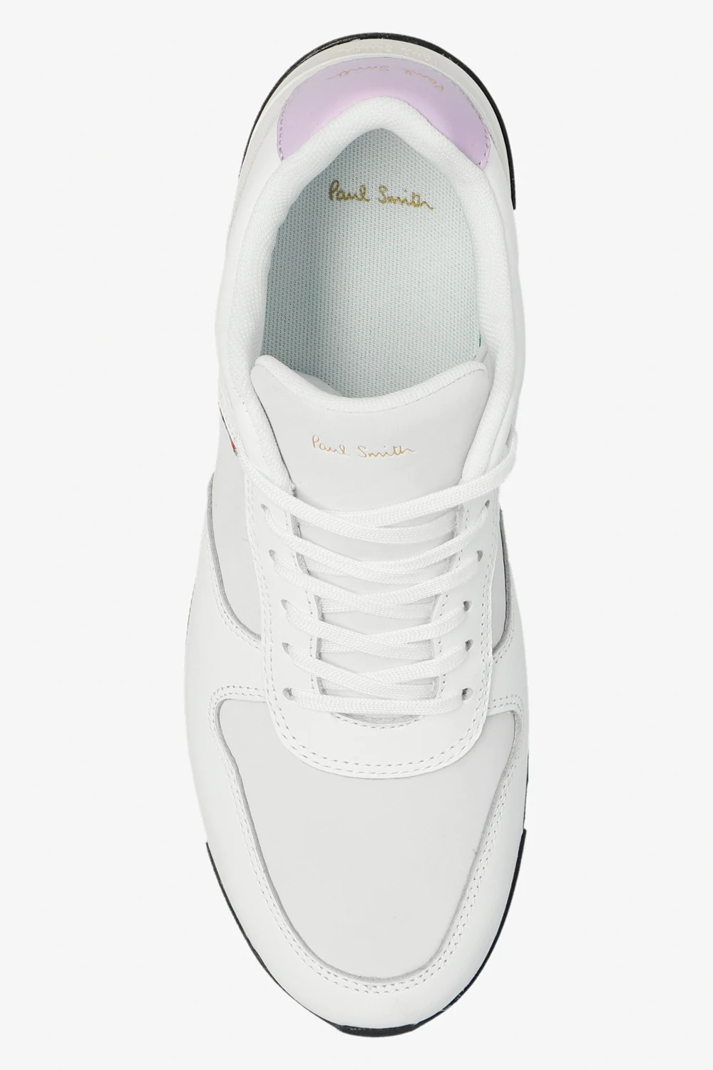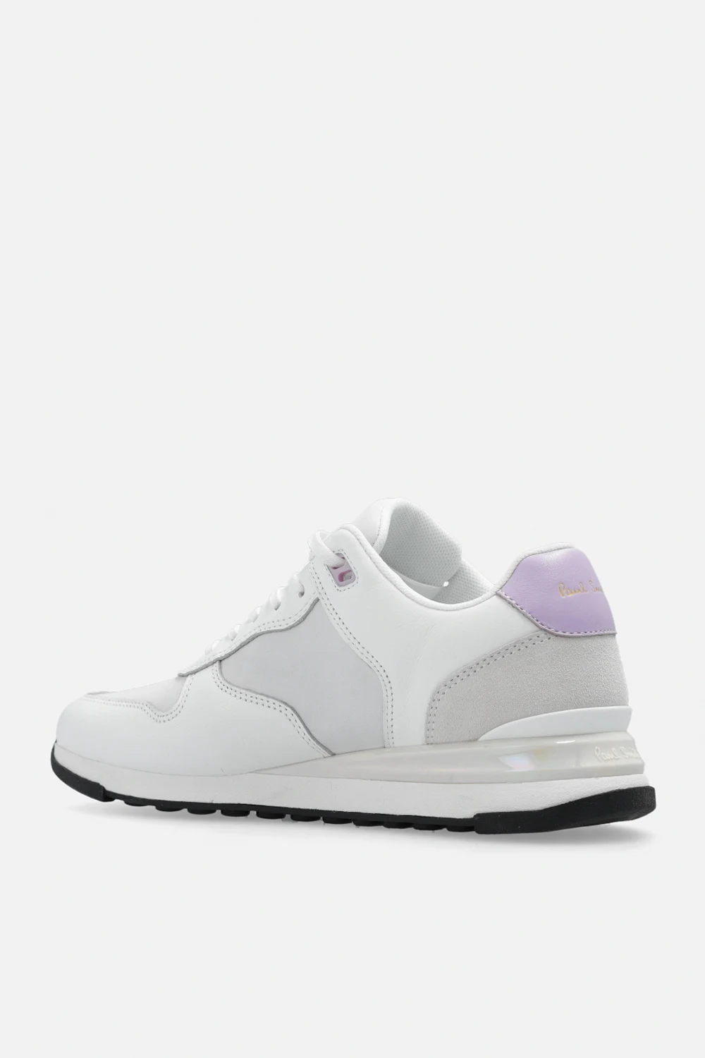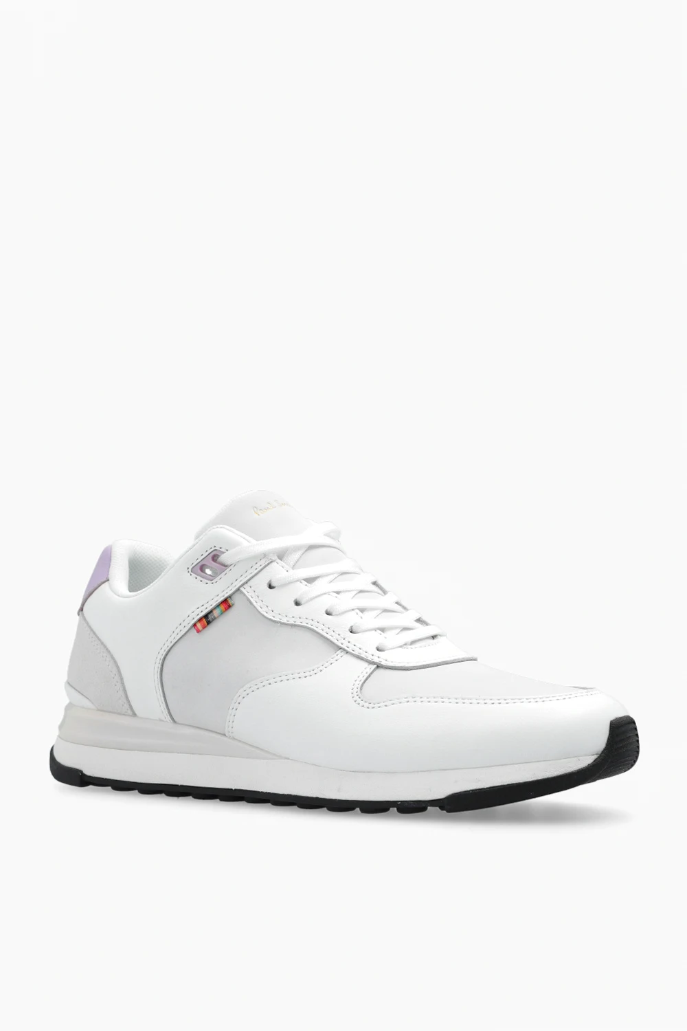 White ‘Ware’ sneakers from PS Paul Smith. Made of leather, this lace-up pair features an embossed logo on the tongue, light purple heel counter, insert with a holographic effect at the back and black rubber sole.