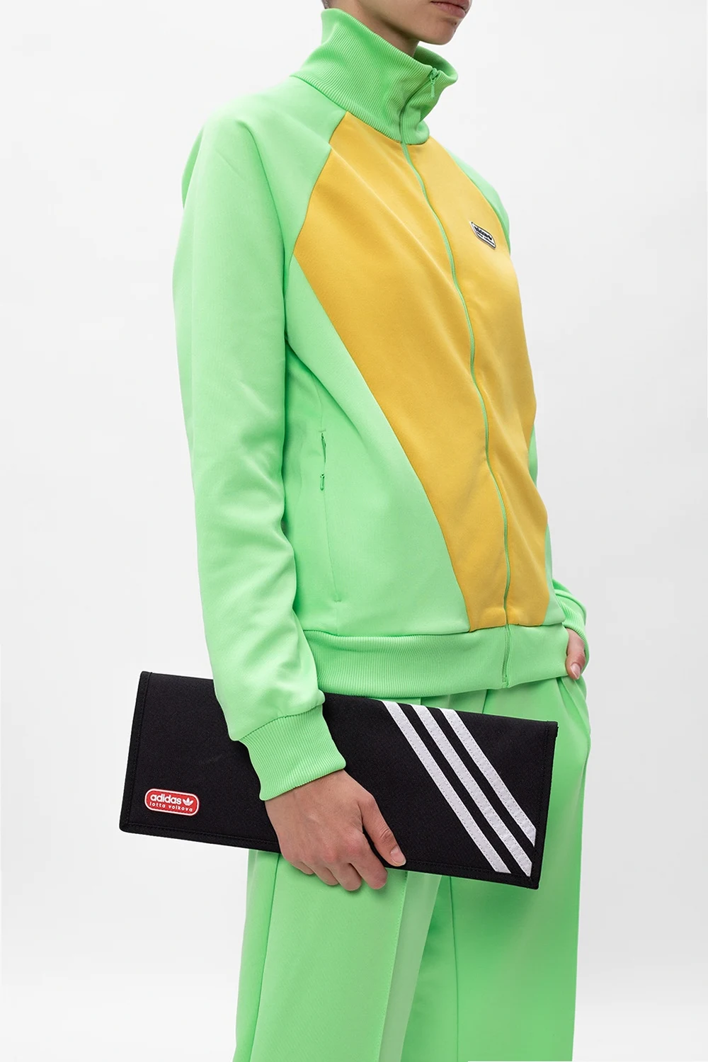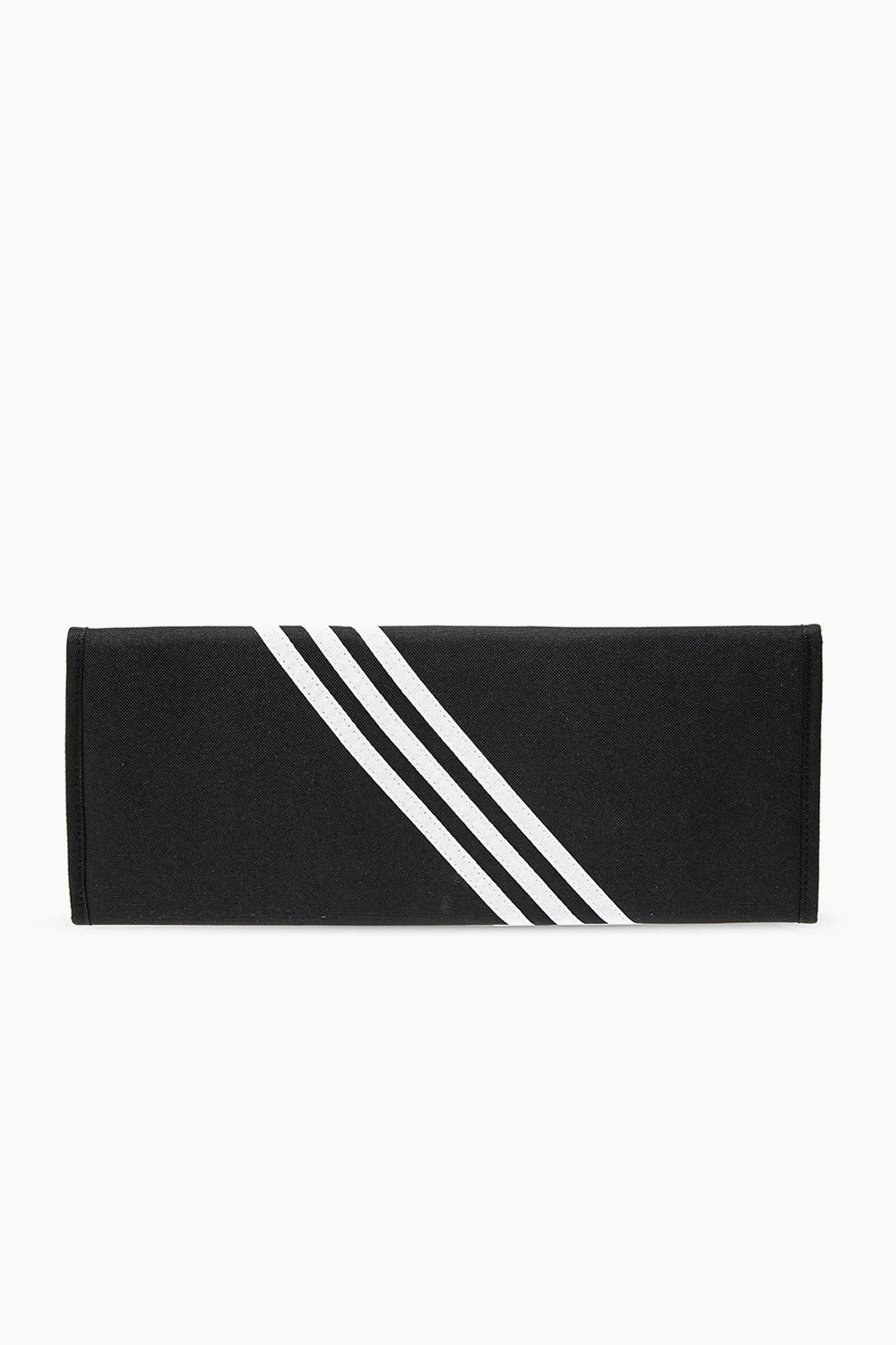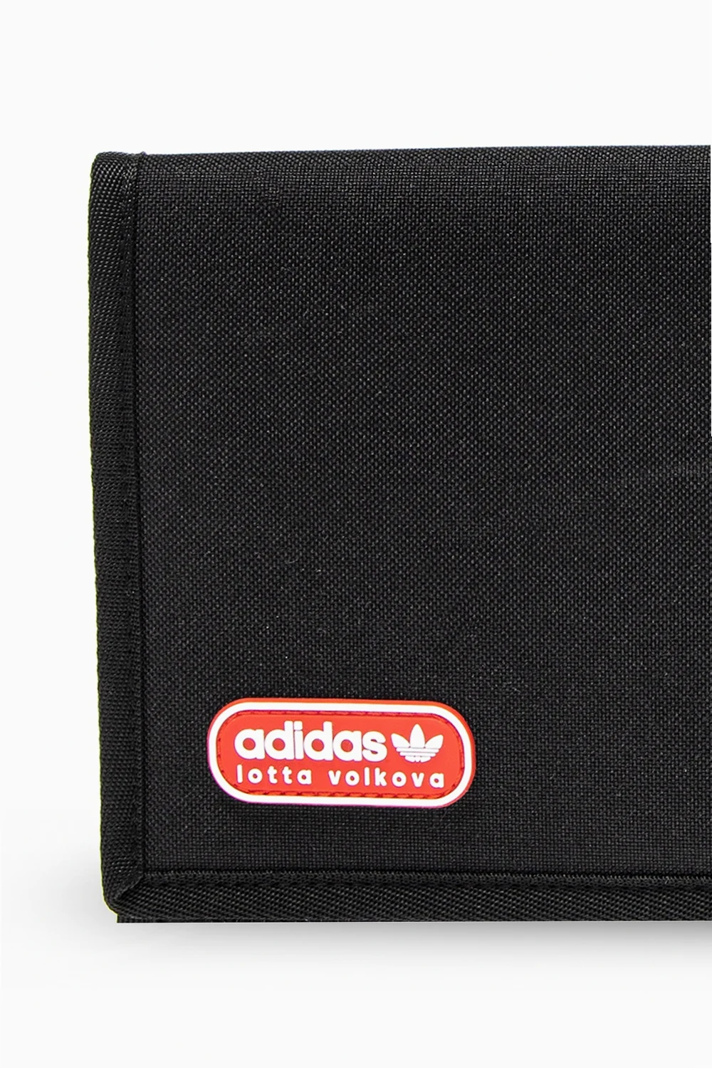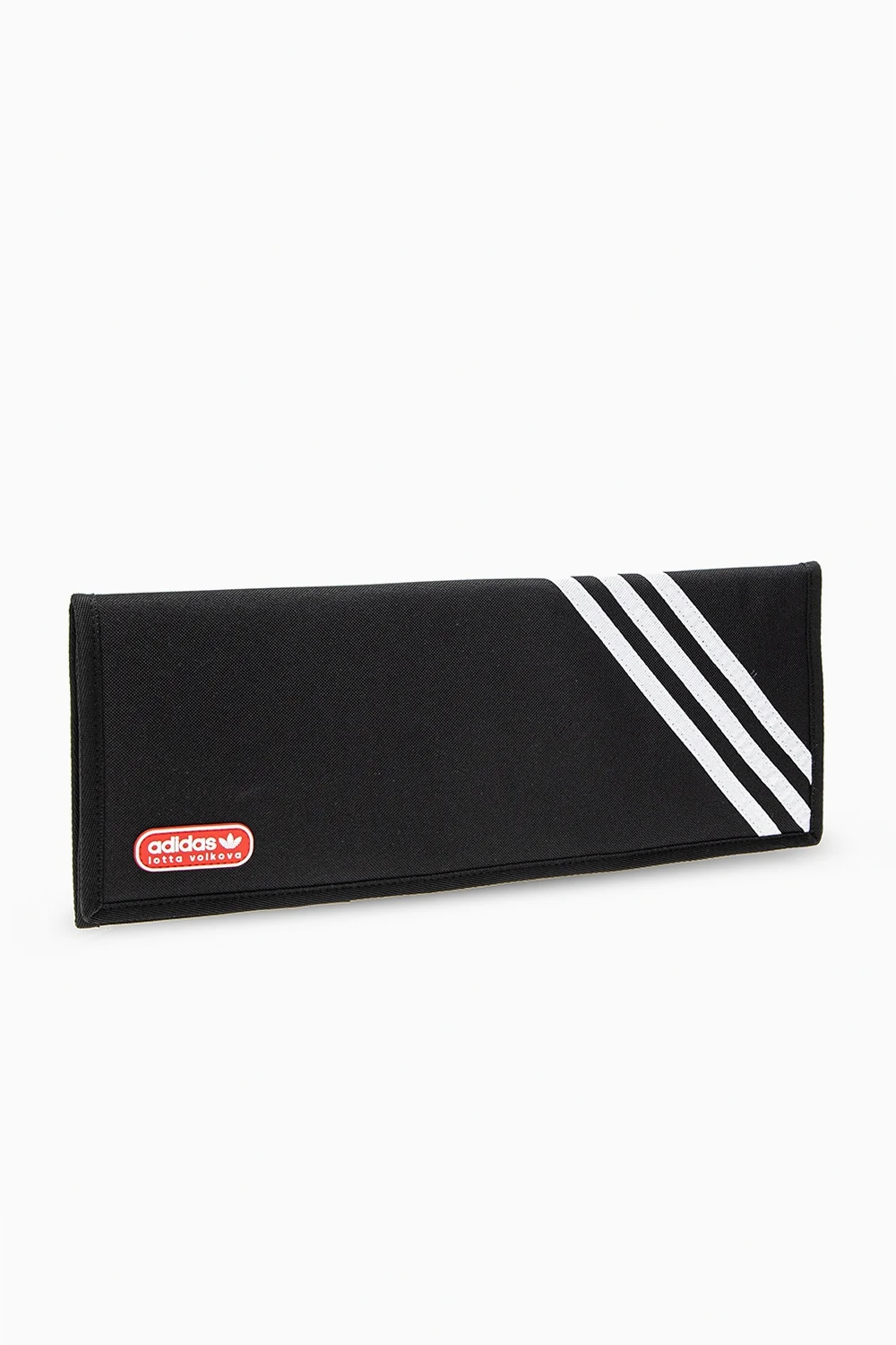 Black clutch from ADIDAS Originals x Lotta Volkova. Embellished with the label's signature three stripes in white, this style comes with a velcro fastener and a red and white rubberised trefoil logo appliqué on the exterior as well as two velcro flap pockets, one zip pocket, two slip pockets and three card slots on the inside.