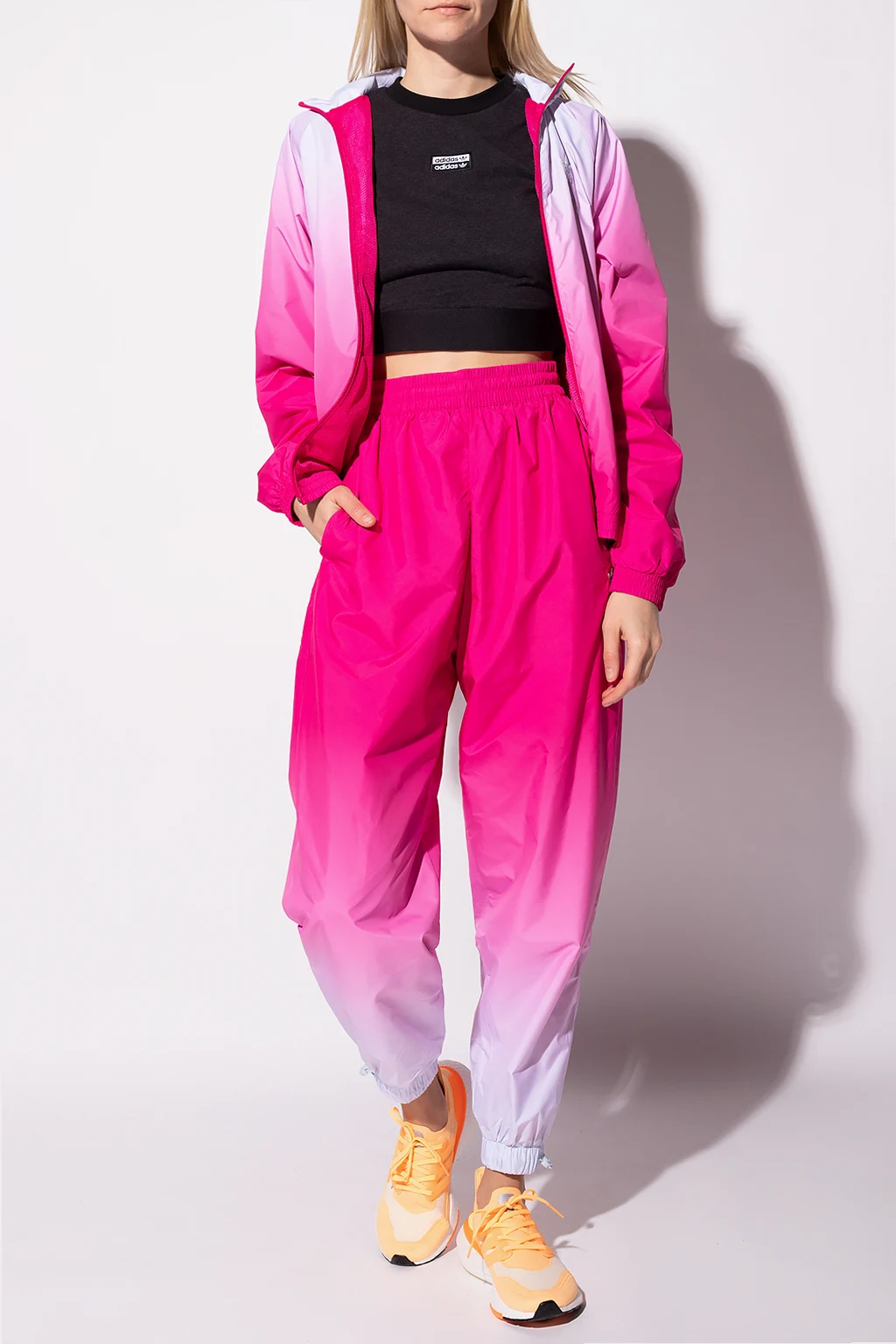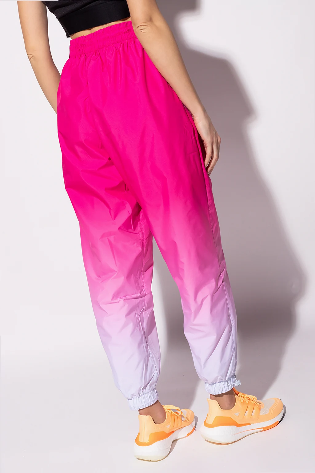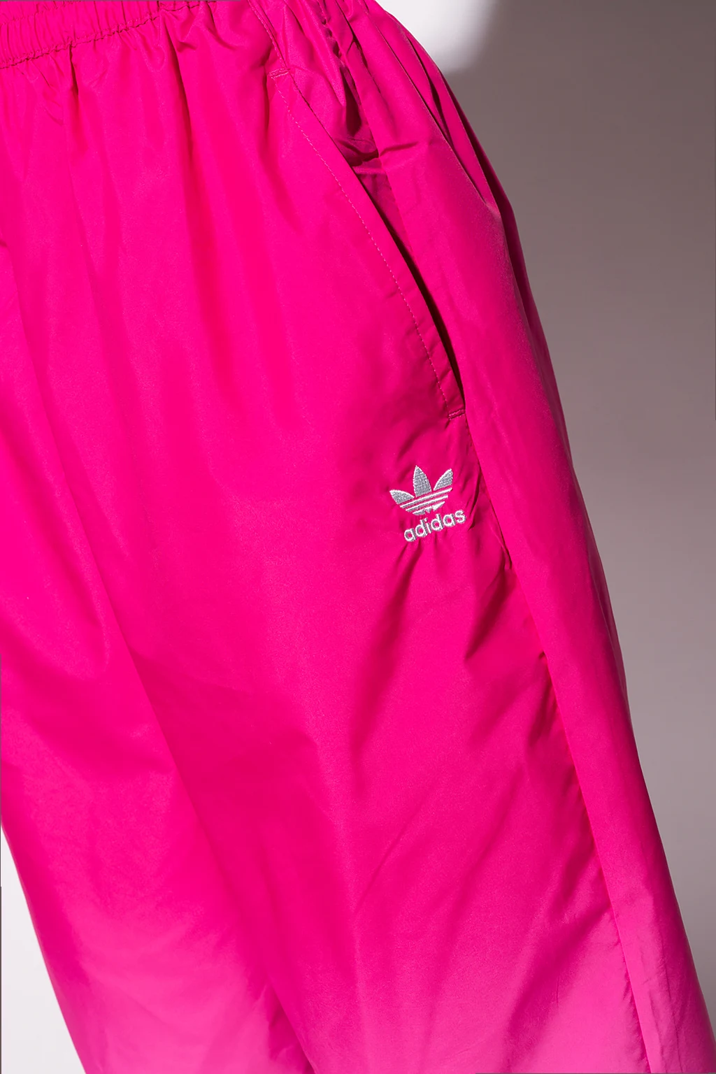 Pink and white track pants from ADIDAS Originals. Enriched by gathers and an embroidered logo, this pair features a drawcord-adjustable waist and cuffs, two side seam pockets and a relaxed fit.