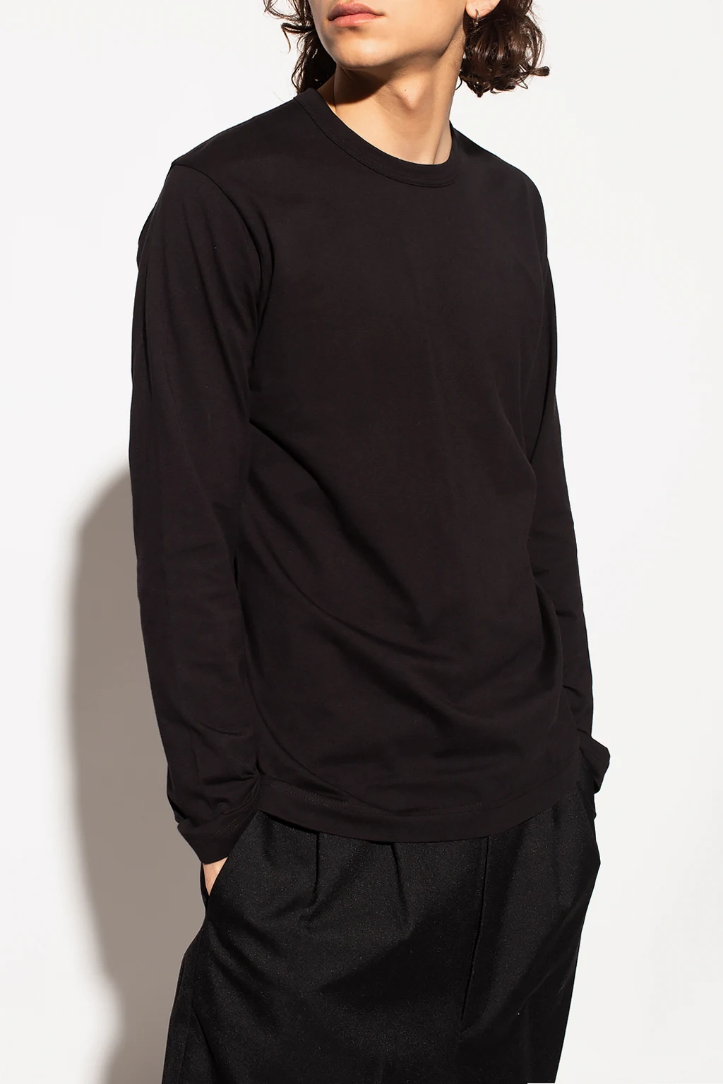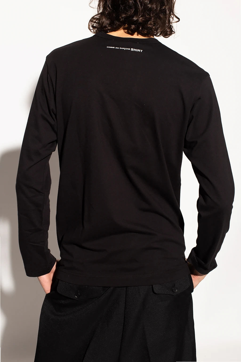 Black crewneck T-shirt from Comme des Garçons Shirt. Crafted from cotton, this style features long sleeves, an elasticated collar and the brand's logo printed in white on the back.