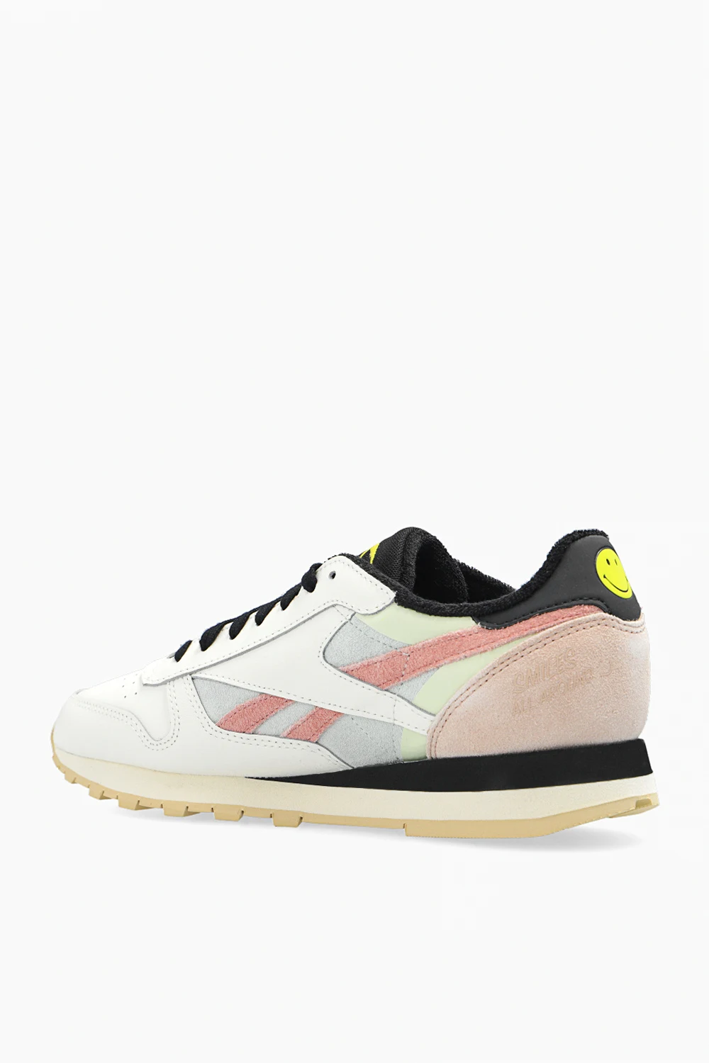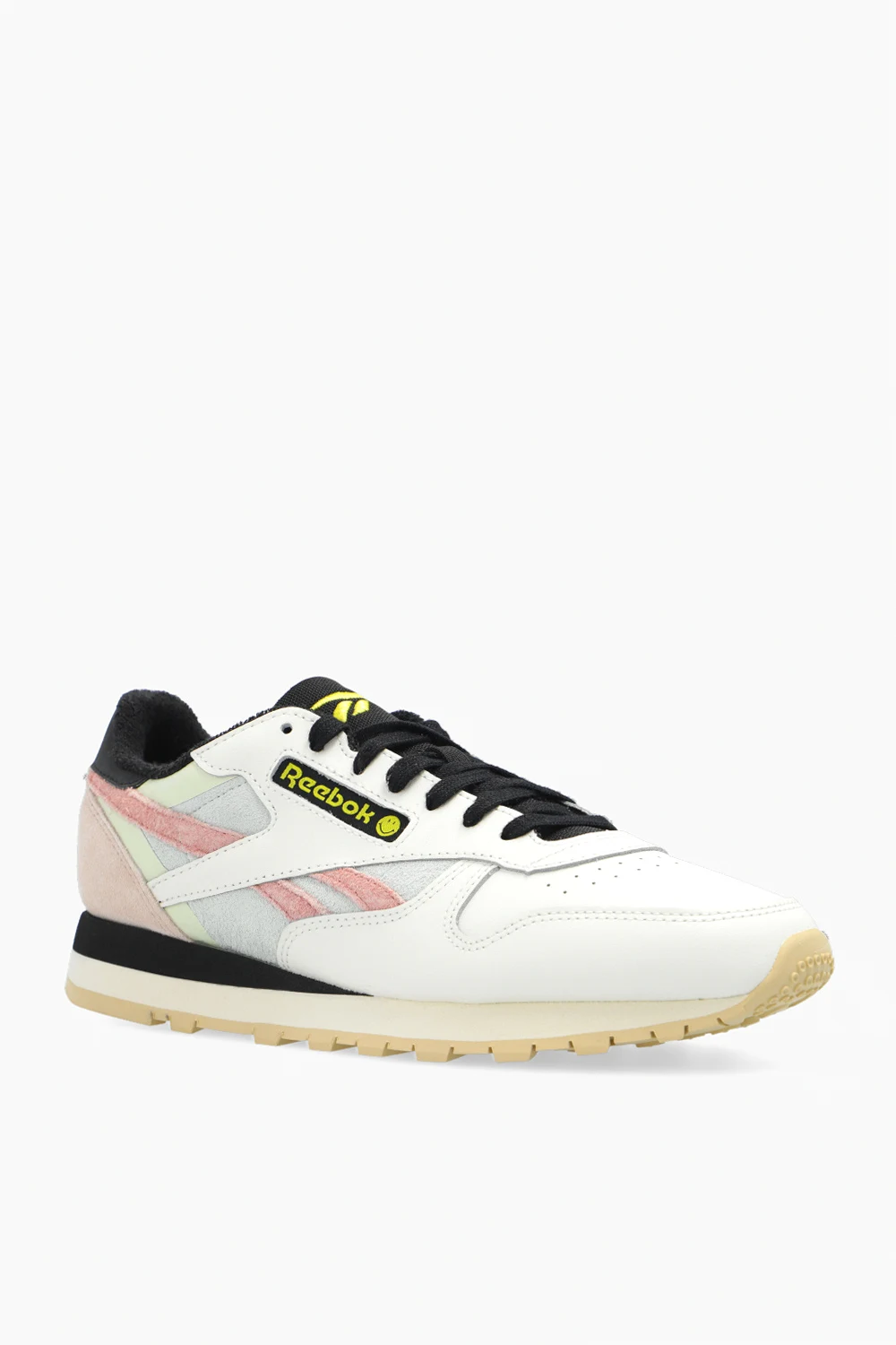 Multicolored sneakers from Reebok x Smiley. Made of leather, this lace-up pair features suede inserts, embroidered yellow logo pattern and cream rubber sole.