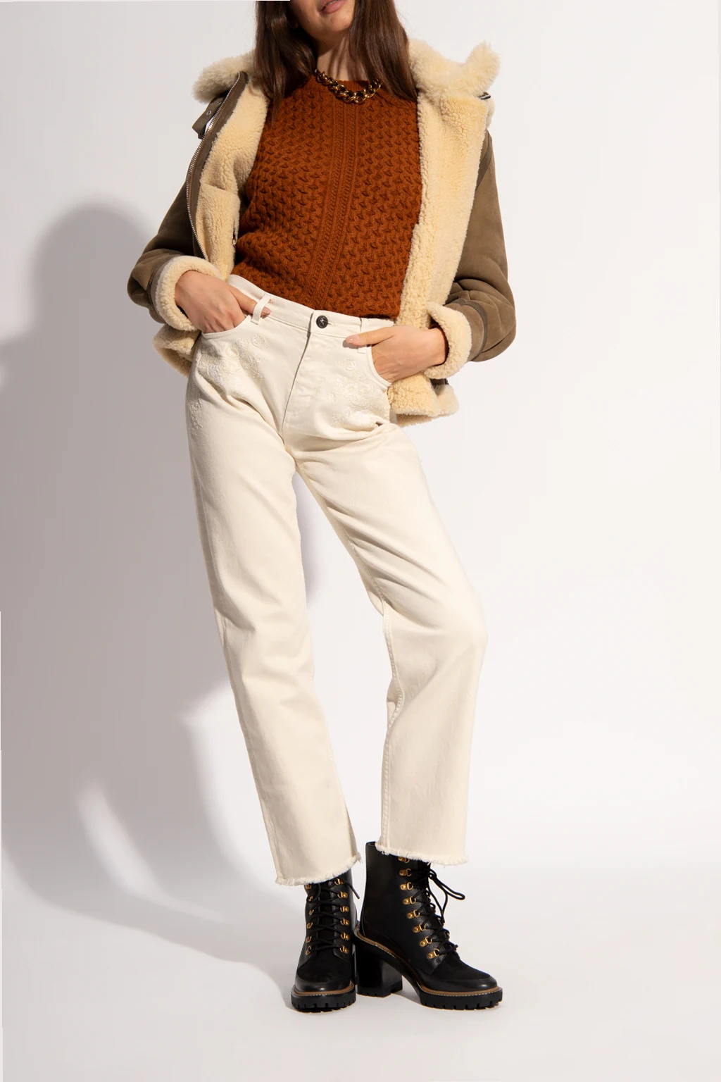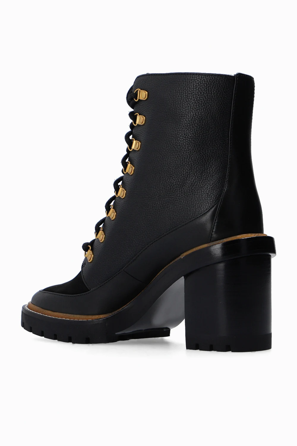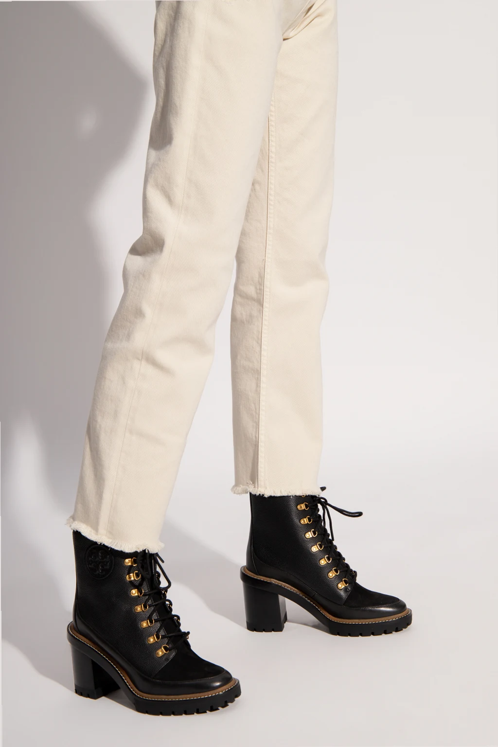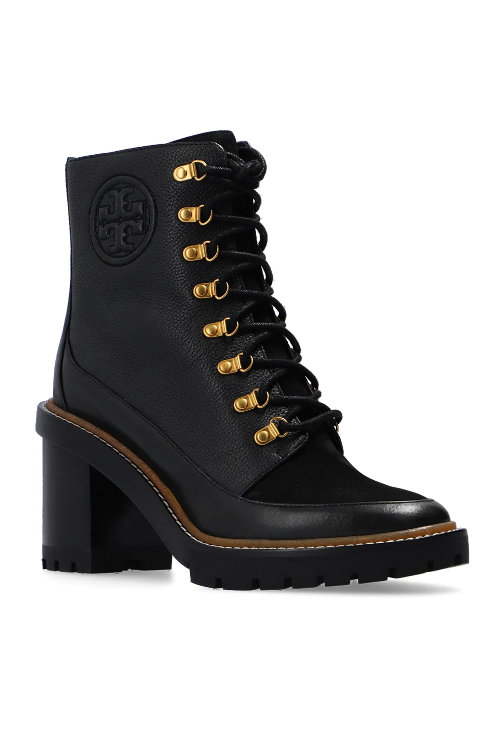 Black ‘Miller’ heeled ankle boots from Tory Burch. Crafted from leather, this lace-up model sits on a black sole made of rubber and leather and features a tactile logo on the side and gold-tone metal hardware.