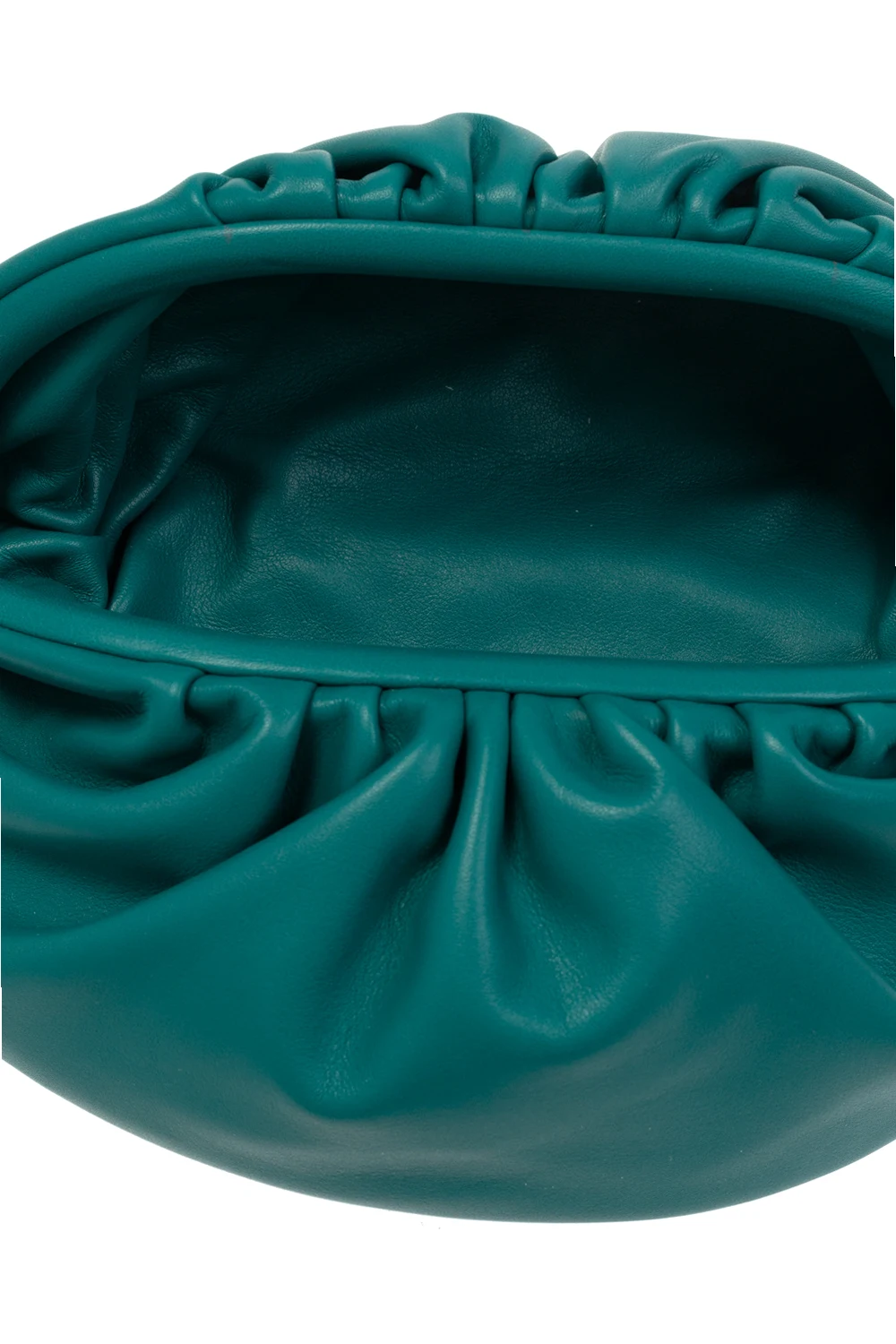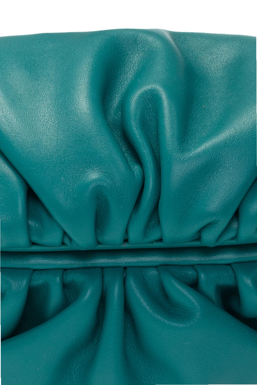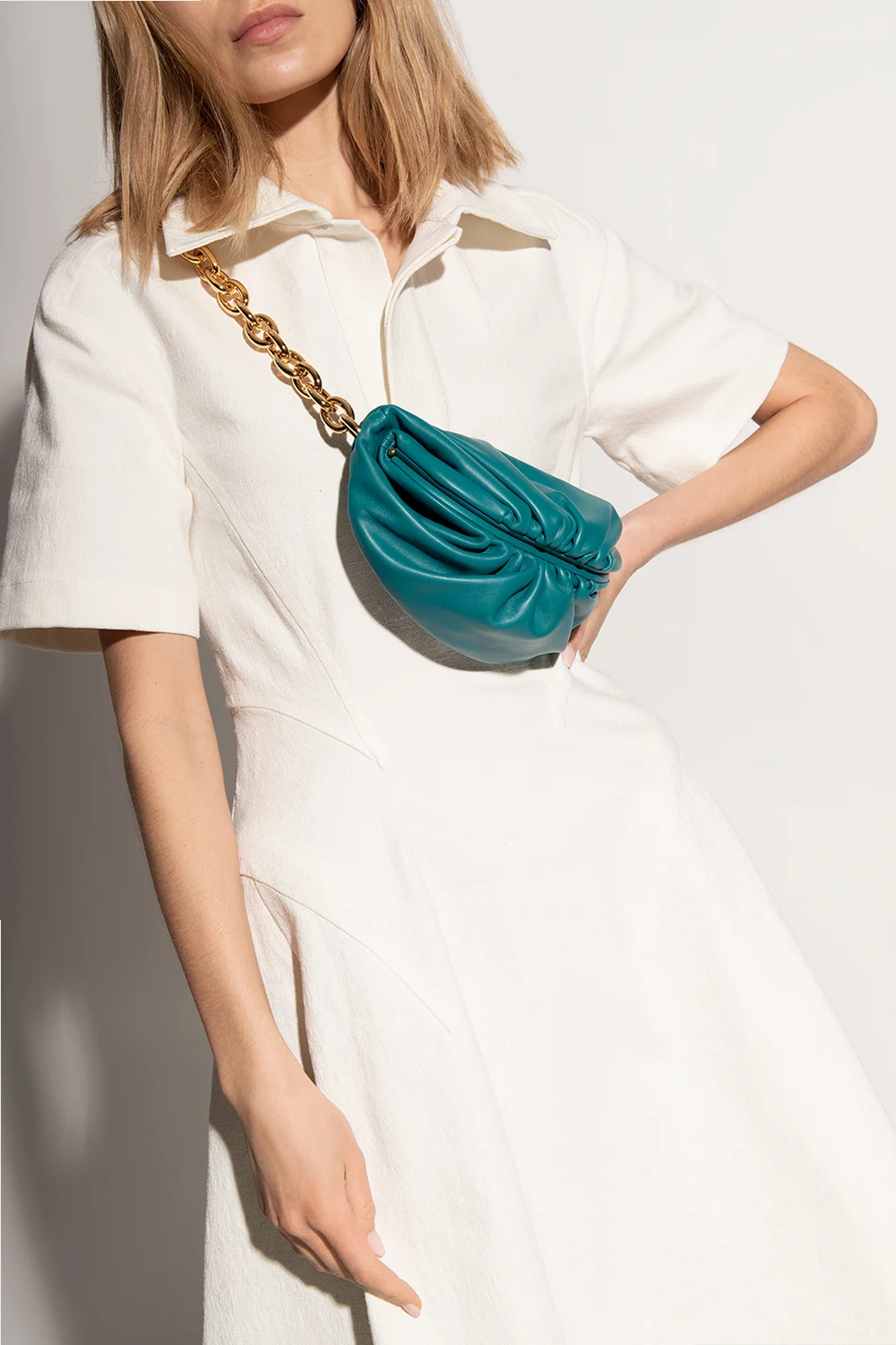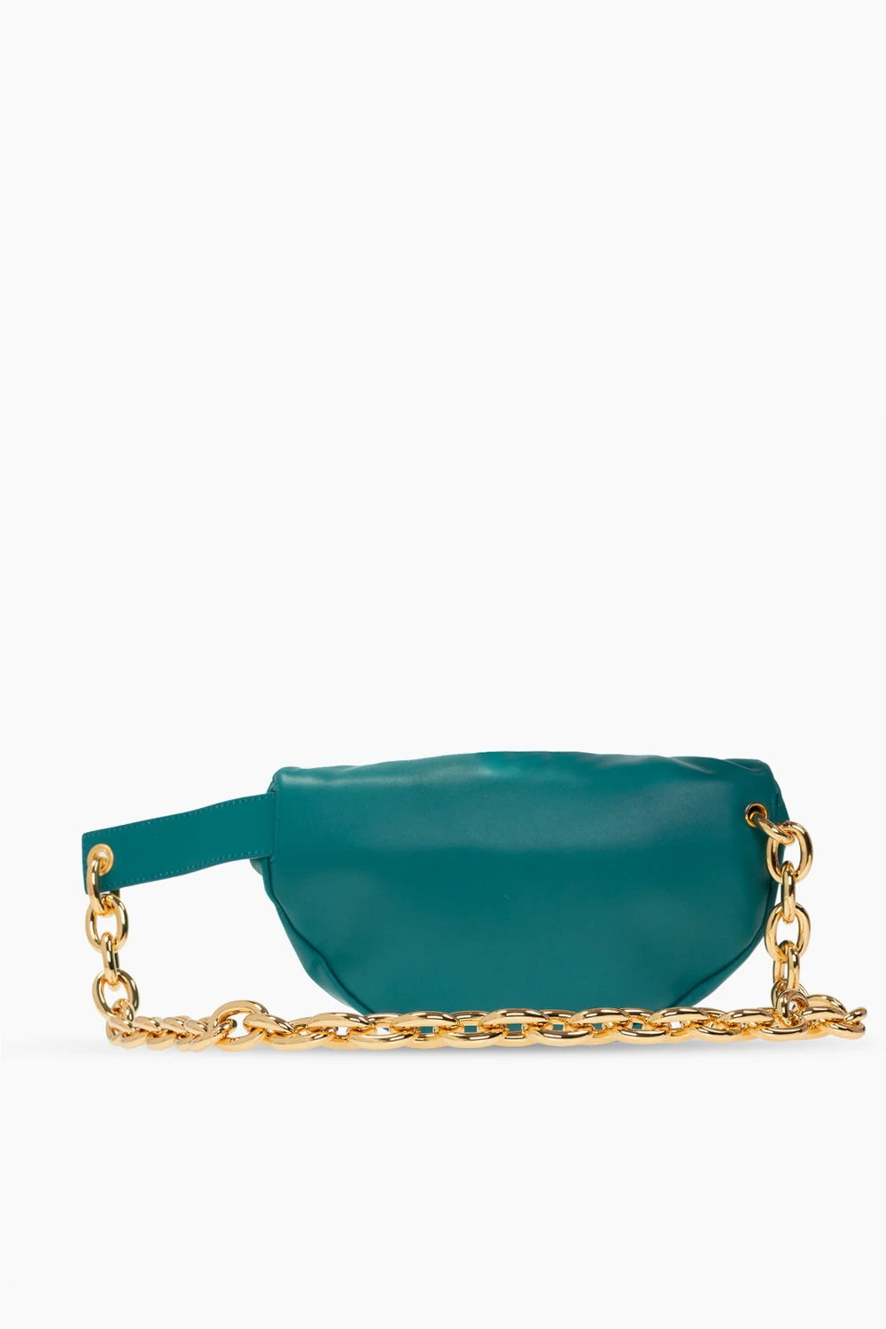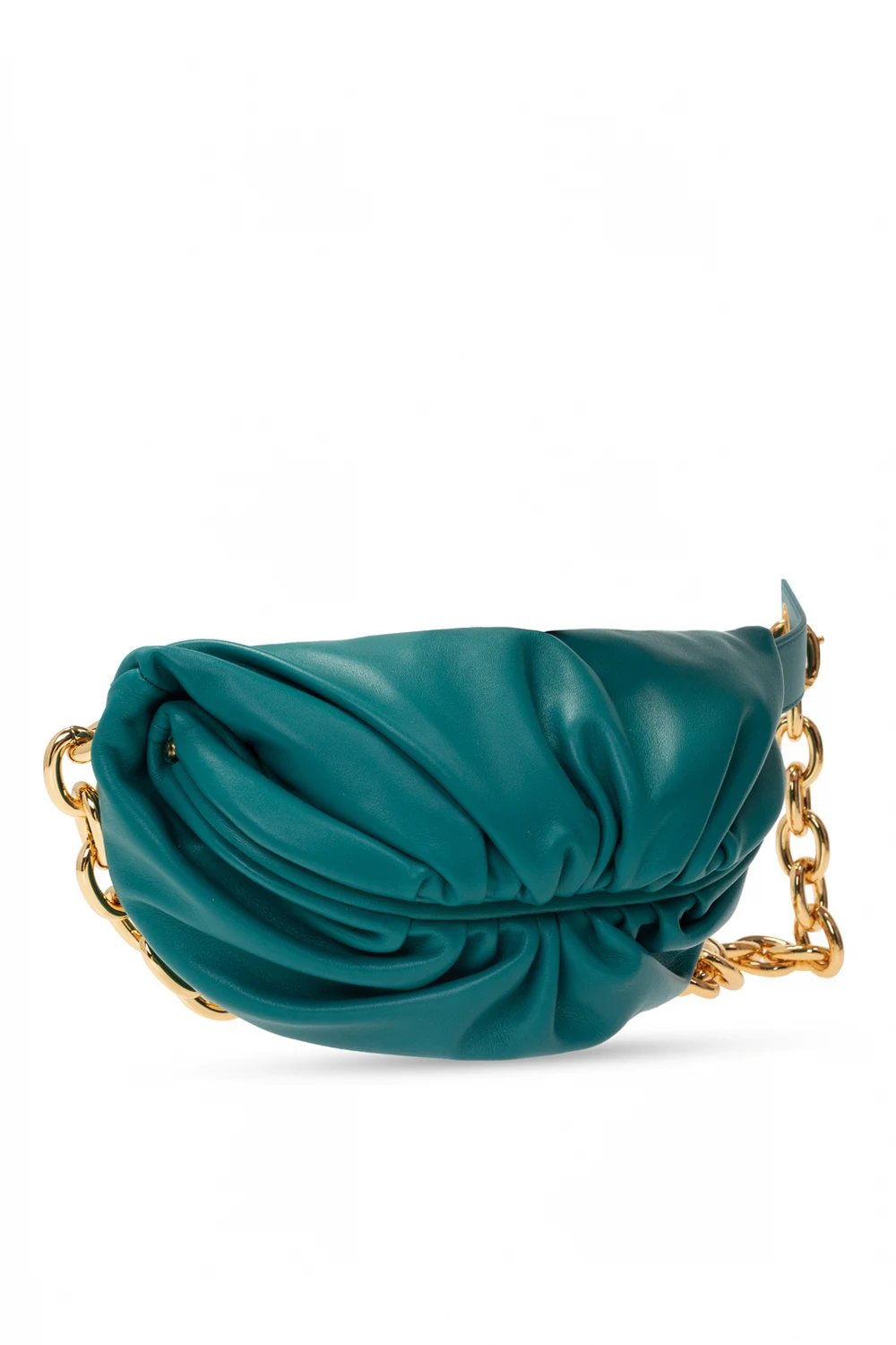Blue 'The Chain Pouch' belt bag from Bottega Veneta. Size medium. Crafted from calf leather, this design features a magnetic snap, gathers, chain belt, one internal compartment and gold-tone metal hardware.