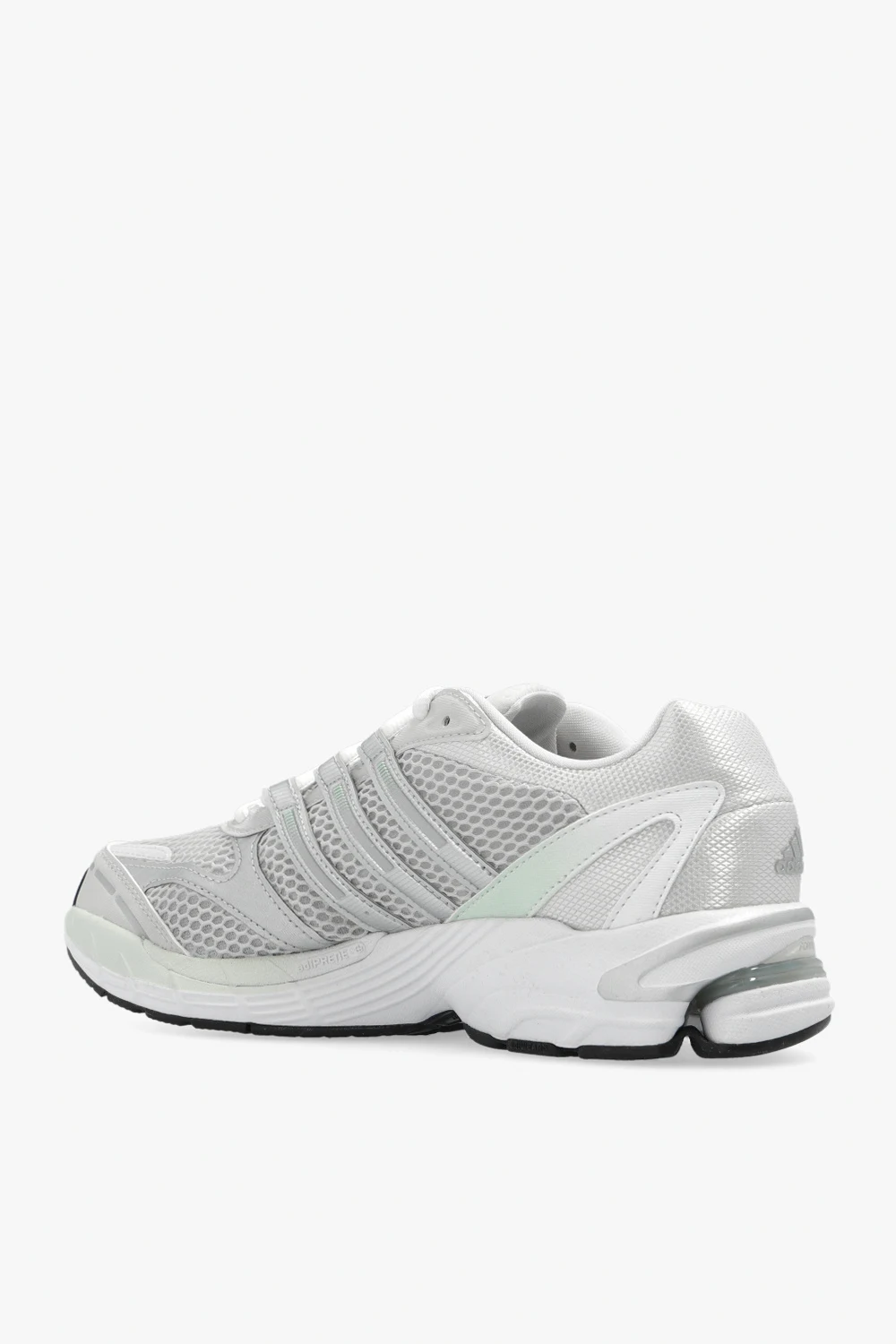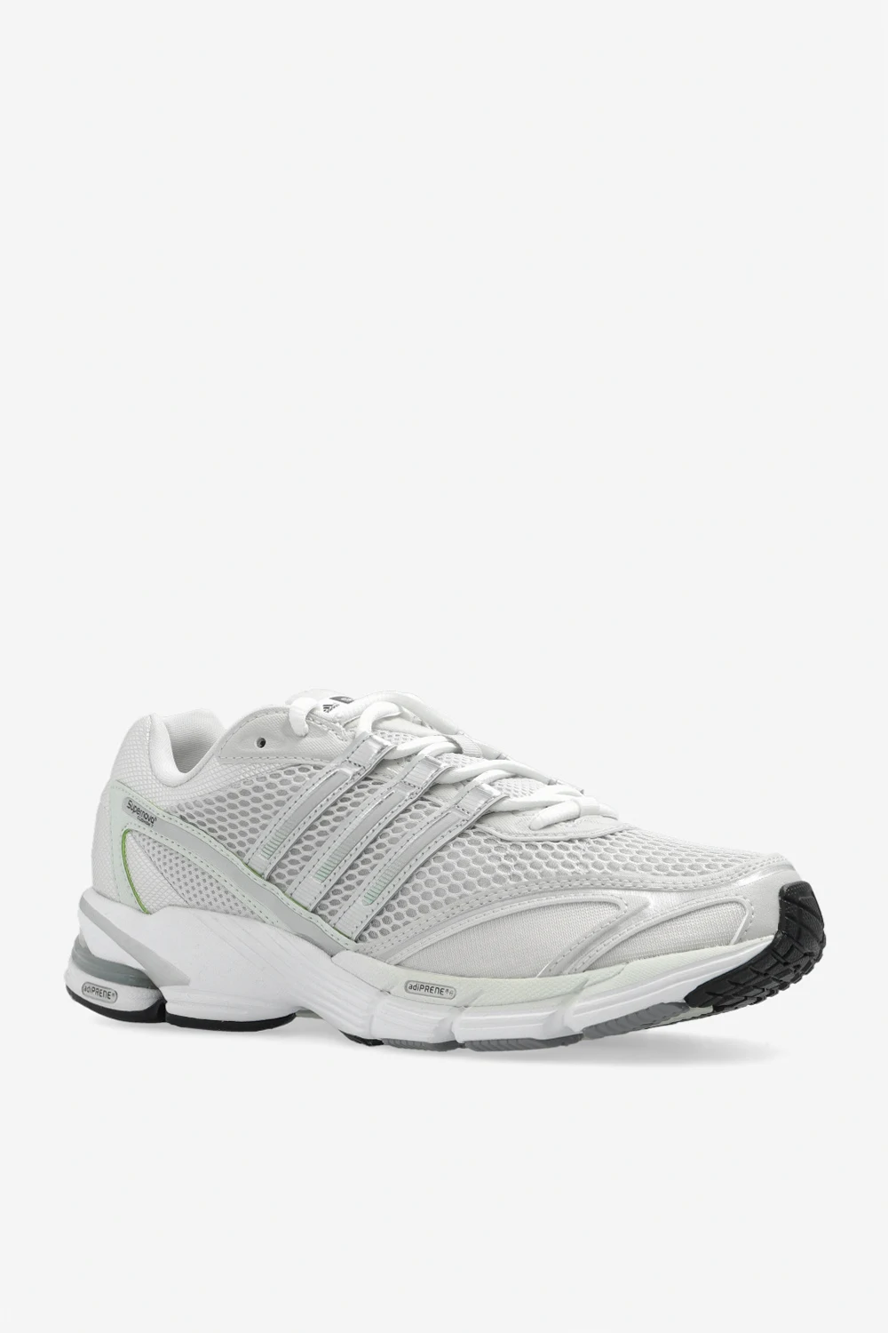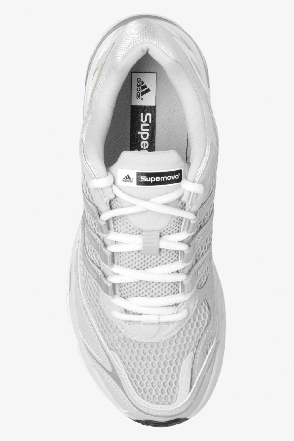 Light grey, green and silver-tone ‘Supernova Cushion 7’ sneakers from ADIDAS Originals. Crafted from fabric and trimmed with rubber, this lace-up model showcases the brand's logo and its signature three stripes and a colourful rubber sole.