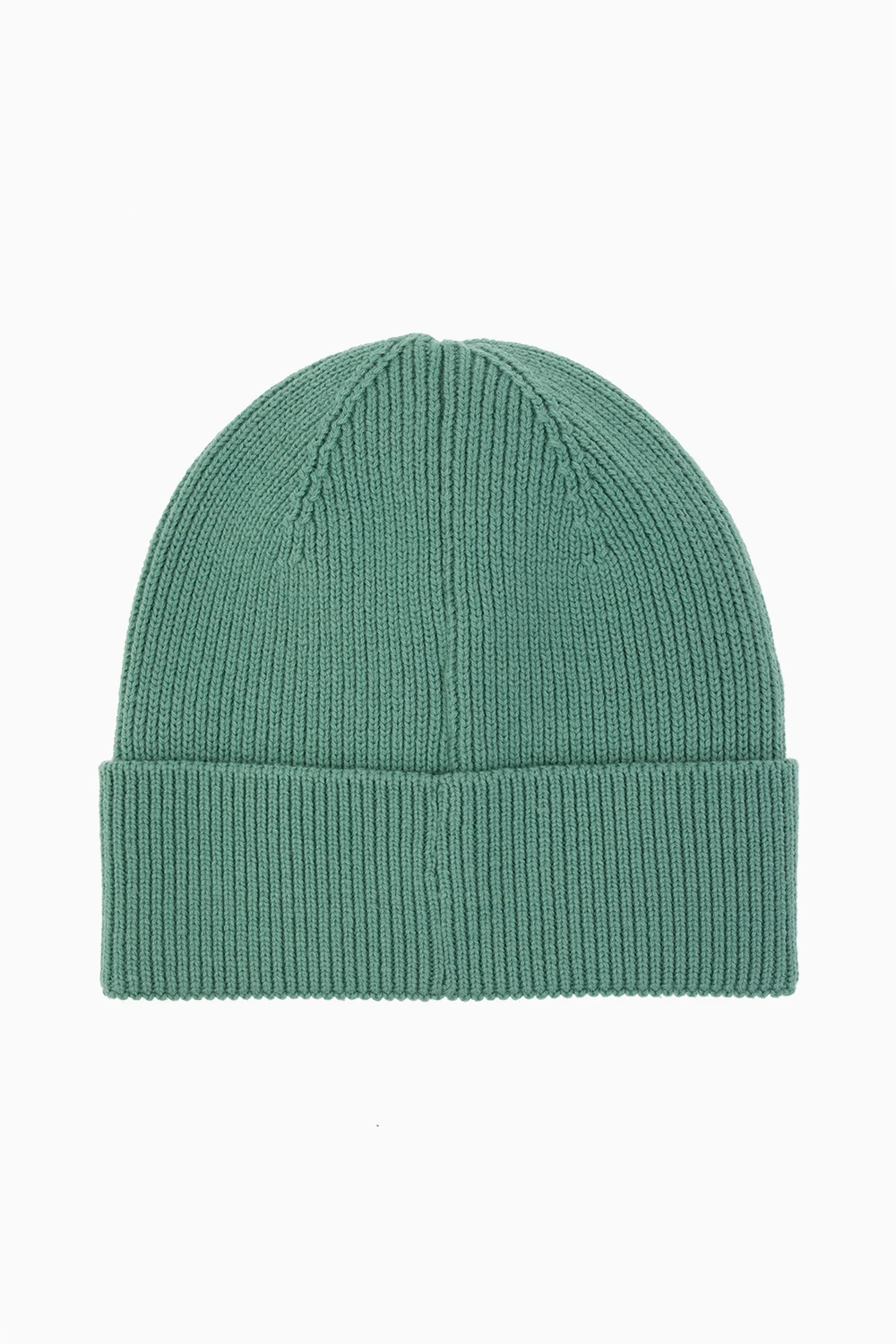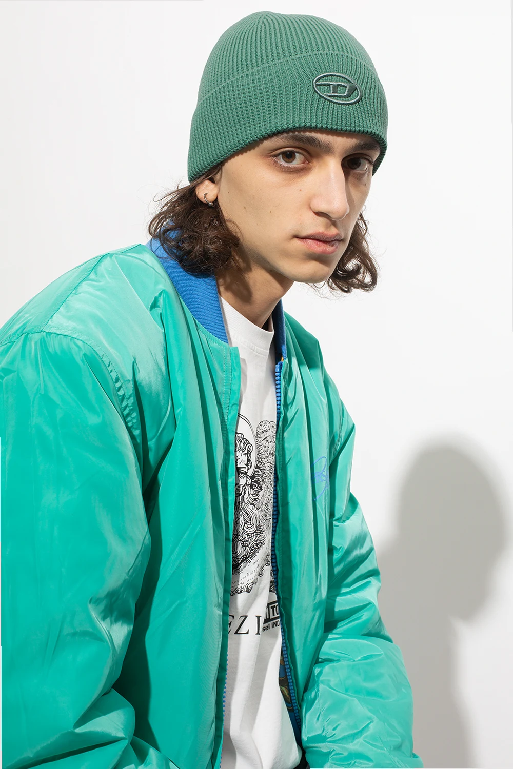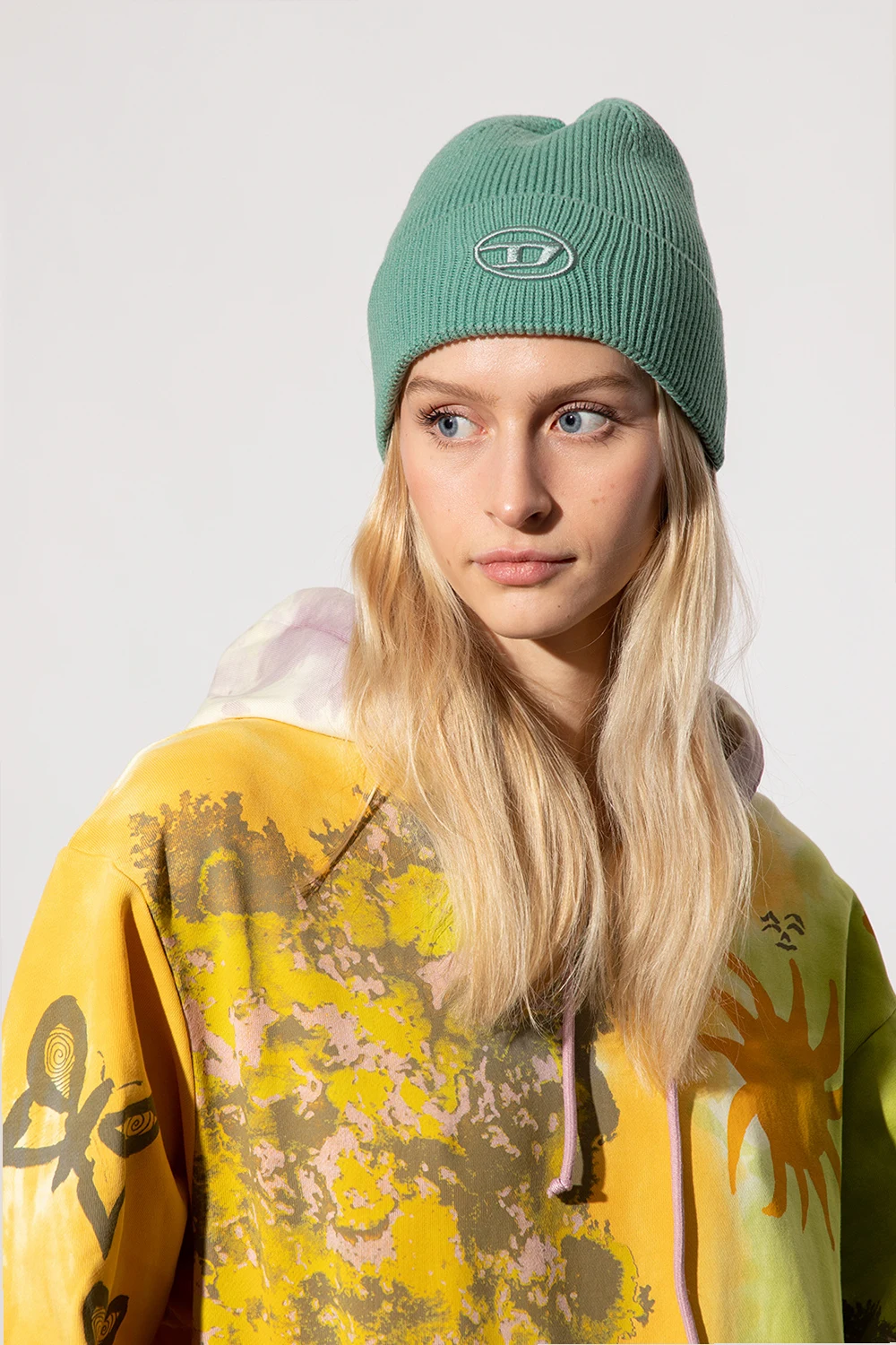 Green beanie from Diesel. Crafted from a ribbed wool and cotton blend, this item features a logo patch for brand recognition.