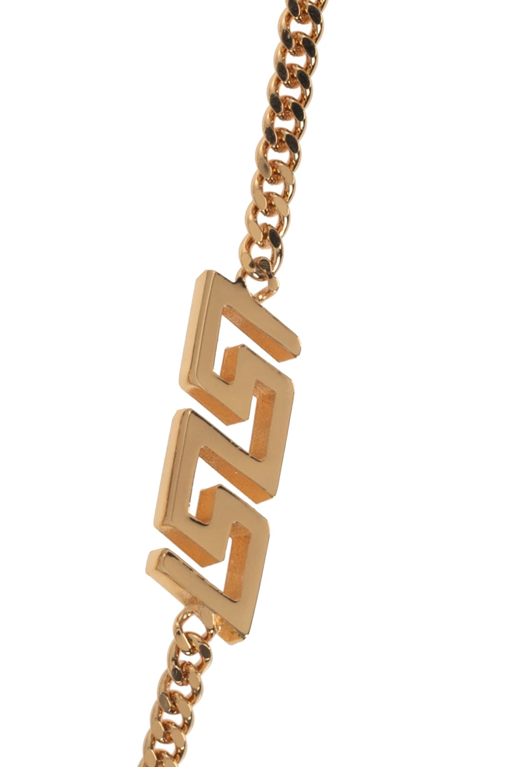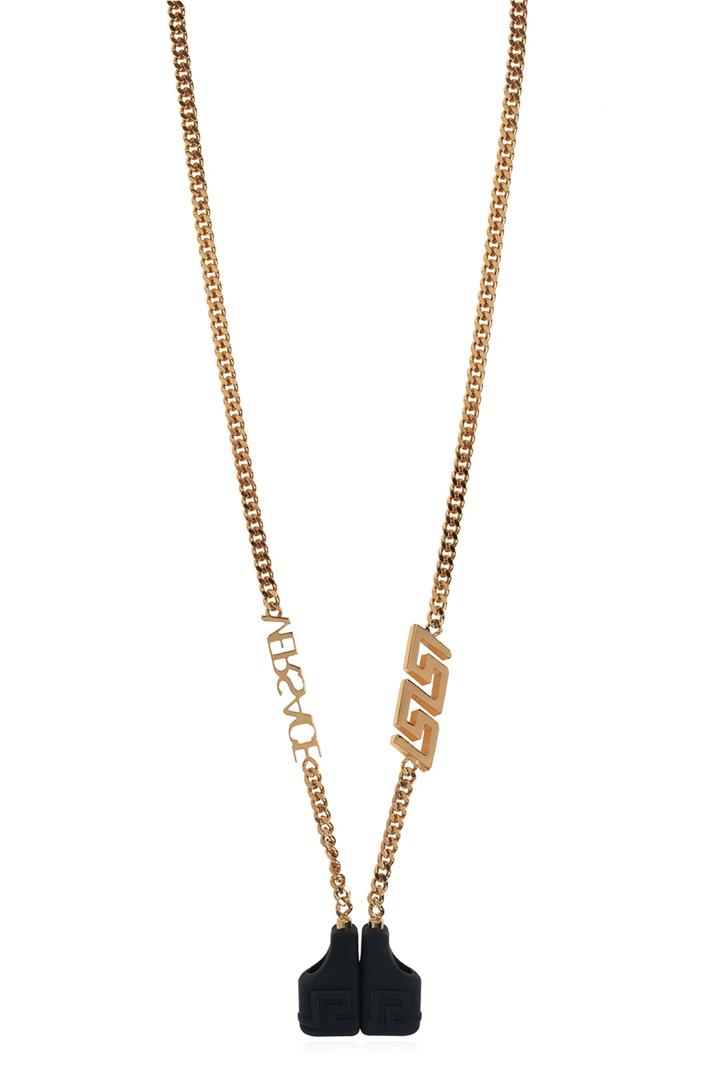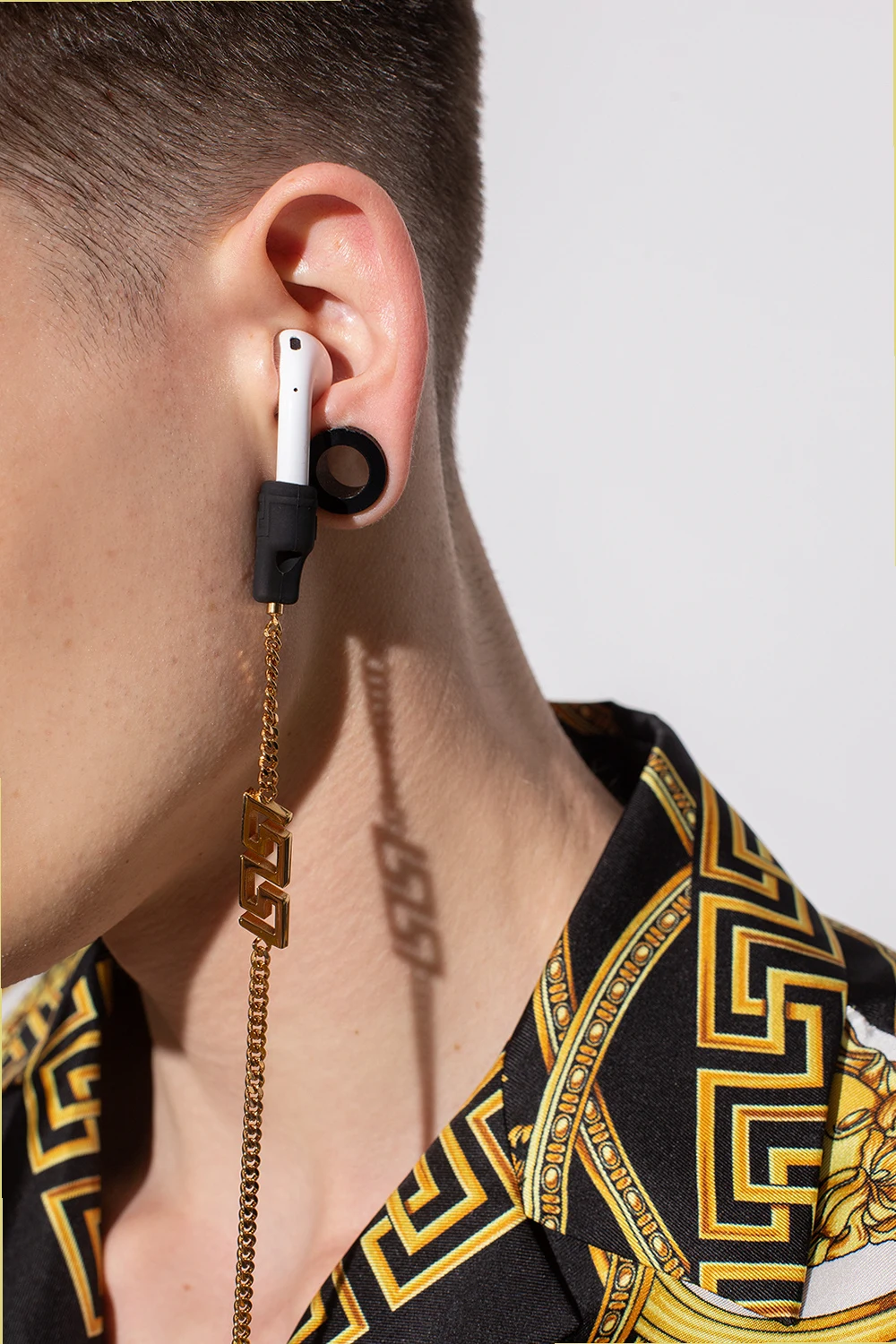 Gold-tone AirPods chain from Versace. It is decorated with a logo detail, the iconic Greek motif and magnetic silicone earphone holders.